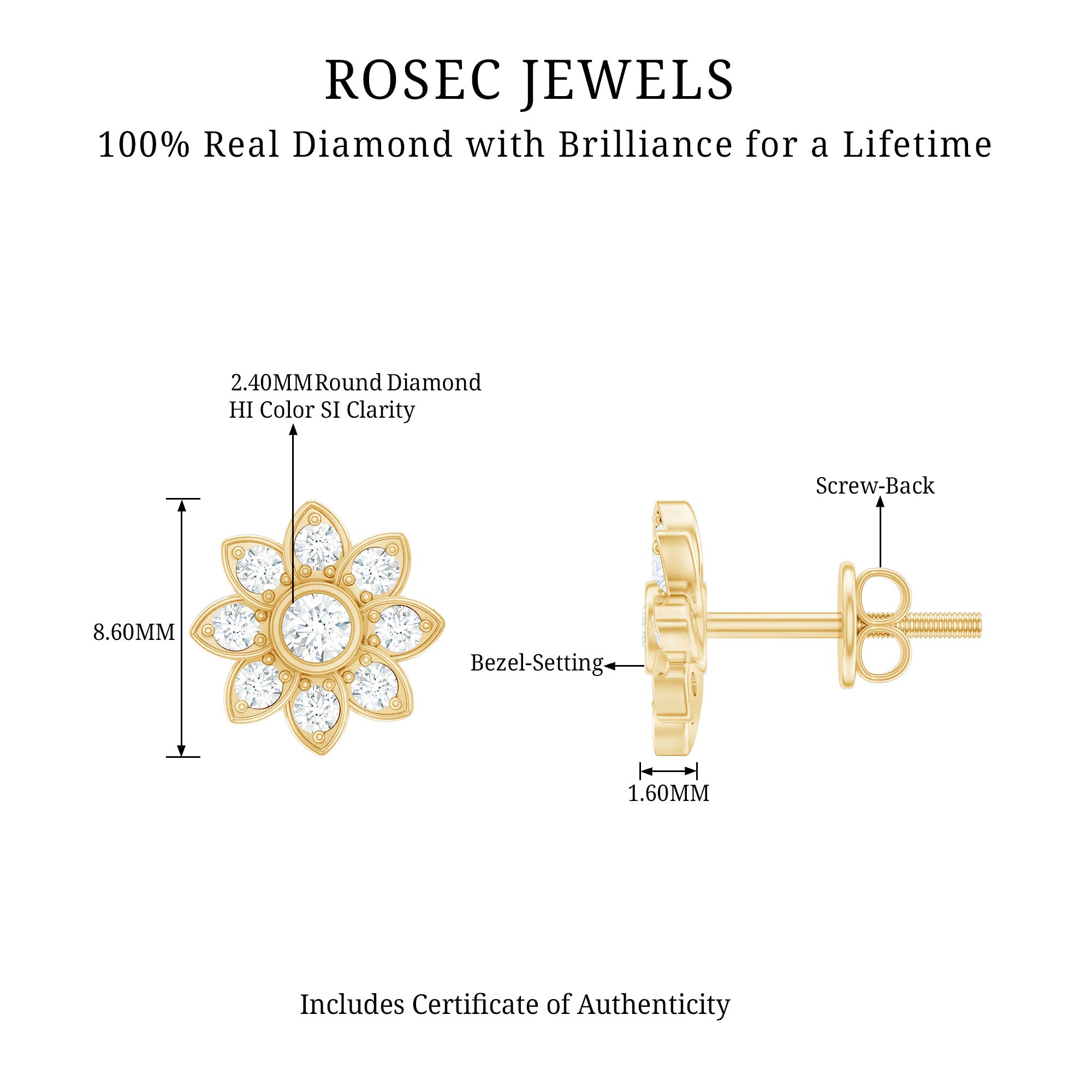 Sparkle the grace of your style with these Diamond Flower Earrings. These Stud Earrings feature Round Shaped Diamond in the center in Bezel Setting along with the Petals that are adorned with Diamond. Known for natural radiance and timeless elegance, these Flower Stud Earrings make a stunning addition to the jewelry collection. Having the perfect combination of luxury and subtle beauty, these Floral Earrings have a luminous sheen and delicate hues, having unique iridescence reflecting light beautifully. The feminine twist with the flower design enhances the style that would let you feel fresh. The timeless flower motif exudes a refined charm that complements any style. So, embrace the beauty with style and design, bloom with shining petals paved with glistening round diamonds. In a nod to Mother Earth, these charming Floral Stud Earrings add a pop of sunshine to your signature look that effortlessly enchants, pairing to bring natures most timeless beauty to your radiant style, every day.