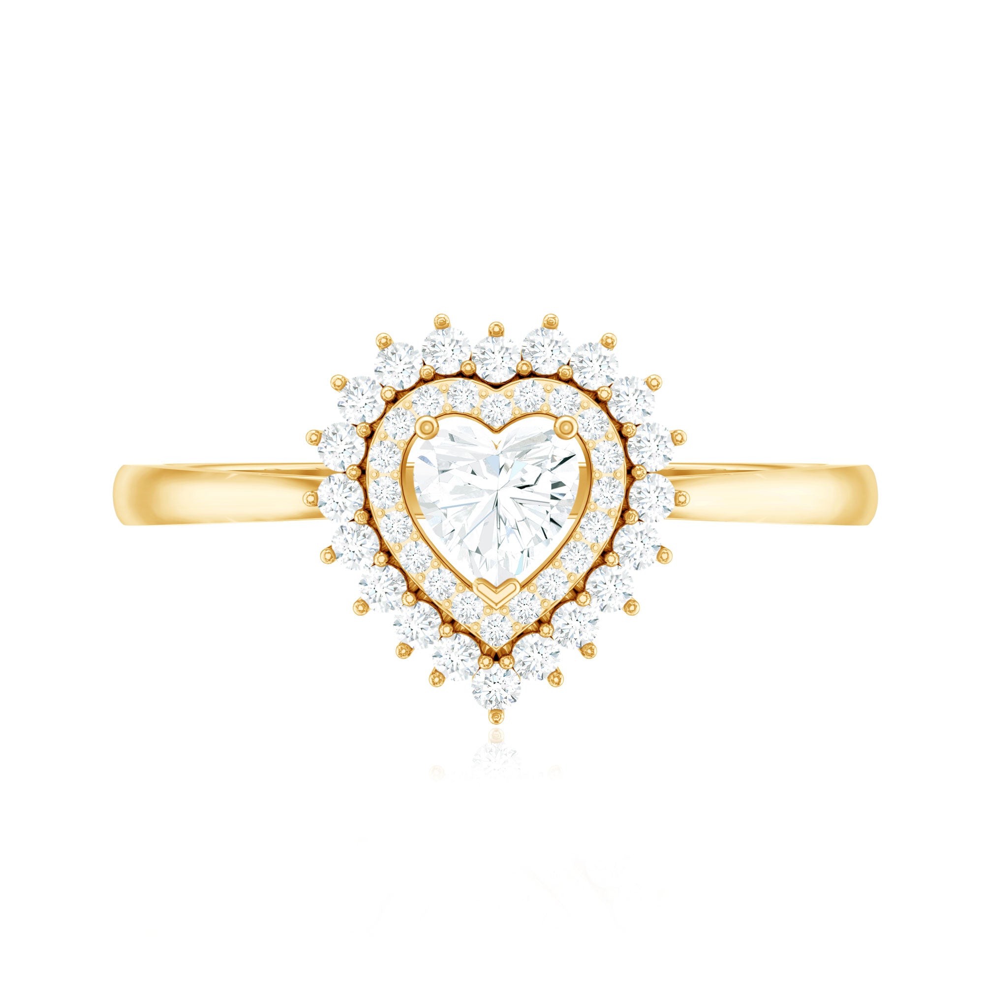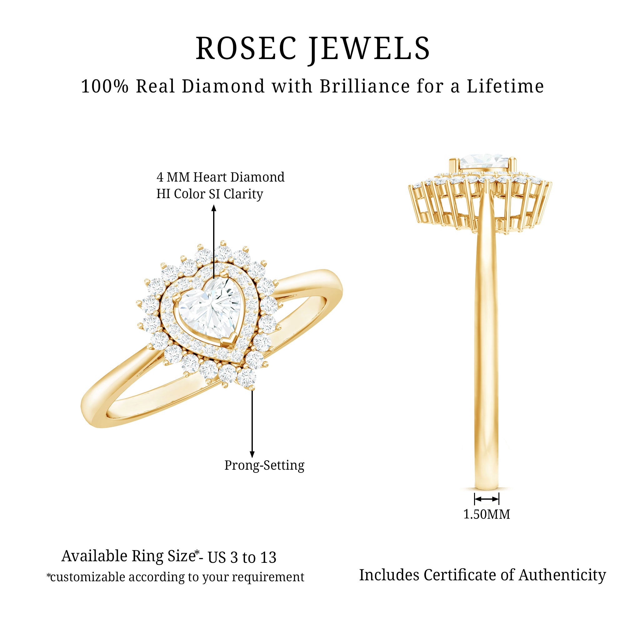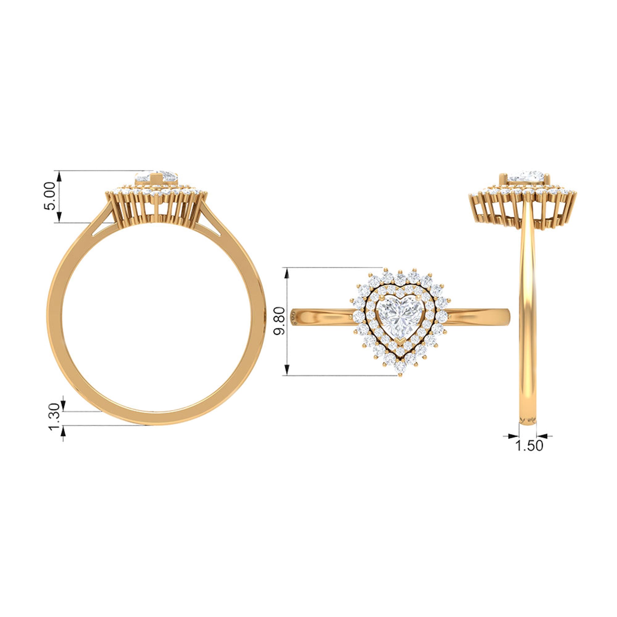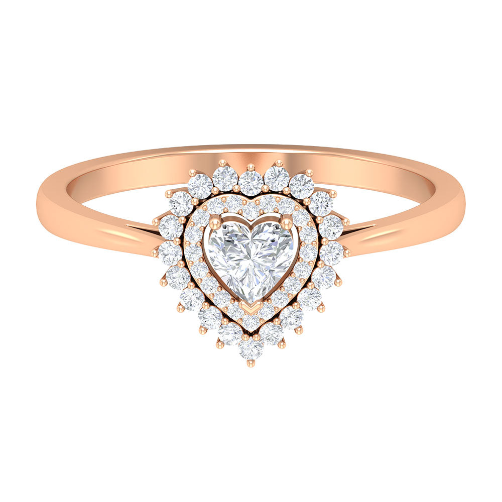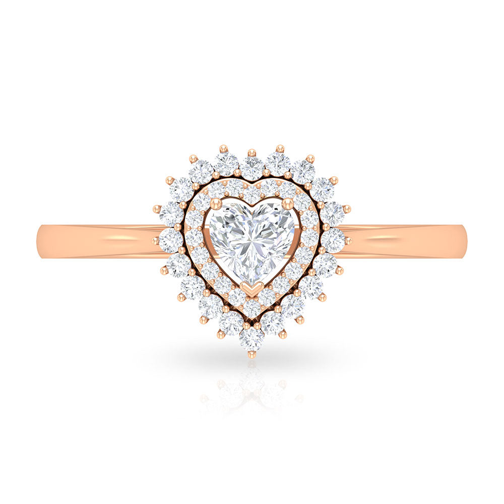 We all know that nothing expresses love quite like a diamond, but a Diamond Heart Ring might just shout it even louder. It features a 4 MM heart-shaped diamond held in prongs, encircled by round cut diamonds in a stunning double halo design, perfectly capturing the romantic feelings tied to love and enhancing the center stones size and sparkle in a classy way. With its timeless and deep symbolism, this Diamond Engagement Ring embodies your unique relationship and tells your love story. Made with HI-SI Quality Diamonds, it boasts impressive clarity and brilliance, making it an ideal emblem of everlasting love. Whether it is a pre-engagement present or a way to reaffirm your love and commitment, this Heart Shaped Engagement Ring symbolizes a promise, perfect for celebrating special moments or simply as a daily reminder of the vows made and the love that keeps blossoming. This Halo Engagement Ring comes in various metal colors and is available in different ring sizes. It also includes a certificate of authenticity for the gemstones and is beautifully packaged in a luxurious storage box.