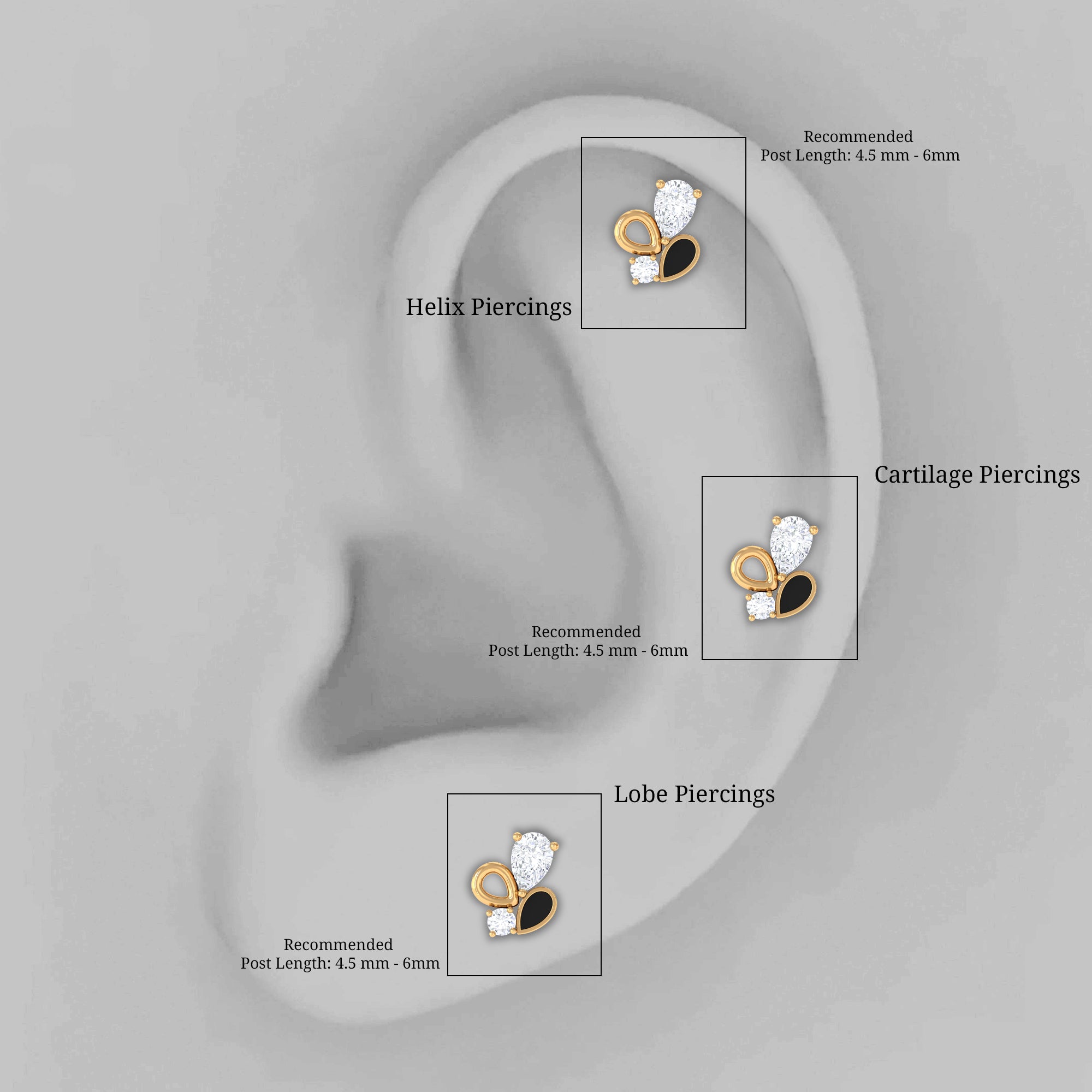 This Diamond Cluster Earring is exactly what you need to finish off a standout look and be the center of attention. This Designer Earring showcases a dazzling cluster of Pear and Round Shape Diamonds, all held in place by prong settings, complemented by pear-shaped black enamel motif and an open pear-shaped metal frame. It is the perfect Diamond Piercing Earring for your Helix, Cartilage, Conch, or Upper Lobe Piercing. This Diamond Flat Back Earring radiates charm that seamlessly matches your casual, formal, and party outfits. Win over your beloved wife with this stunning Helix Earring, making it a fantastic gift for anniversaries, birthdays, or Mothers Day. This Ear Piercing Earring features the timeless sparkle of gemstones and a beautiful dark hue that contrasts perfectly, making it a great addition to any jewelry collection. It beautifully represents your elegant style with a touch of glamour. Wearing this cartilage earring will not only enhance your look but also earn you compliments for your fantastic taste. It will arrive in a velvet pouch for safe storage, along with a certificate of authenticity.