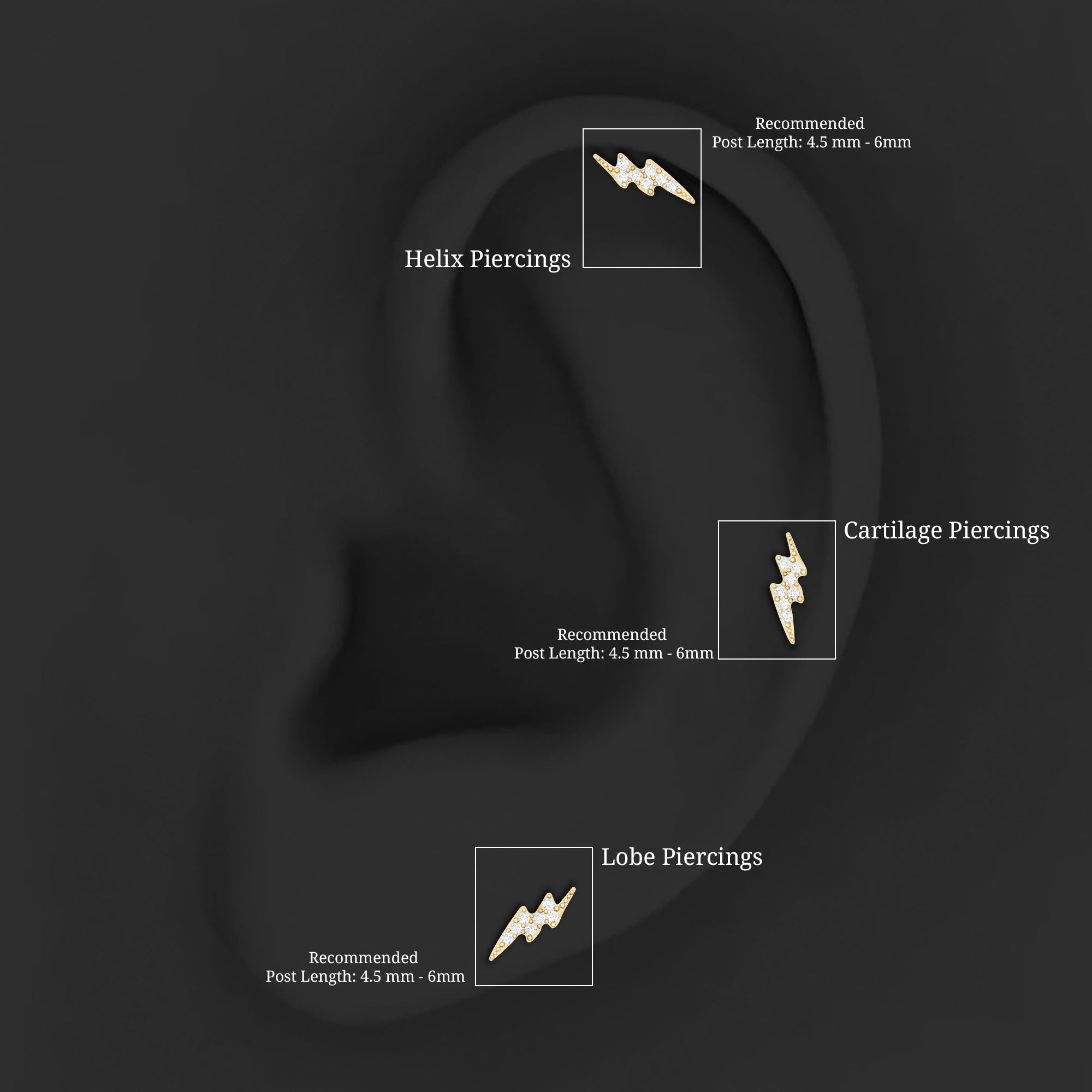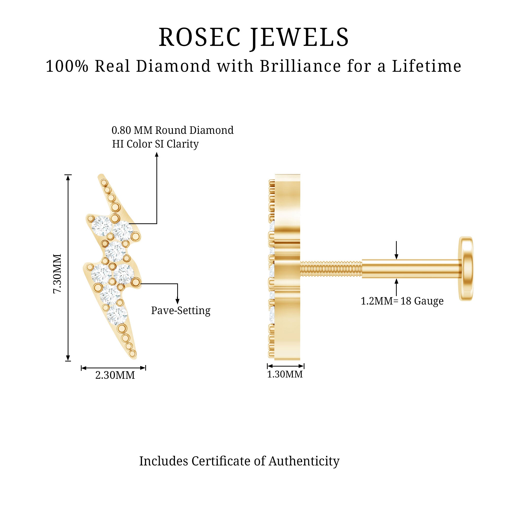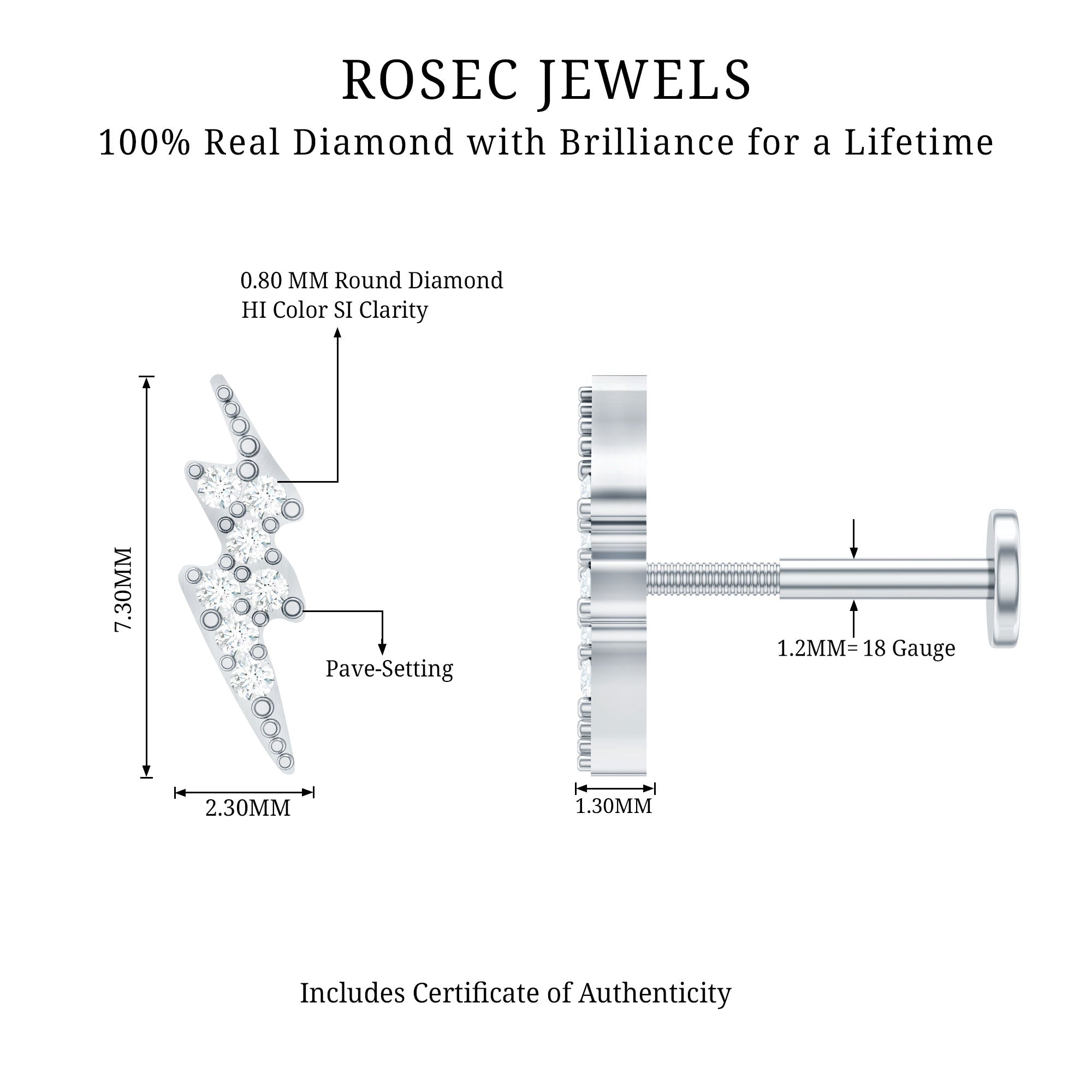 Ta-da! Electrify your ear stack with our oh-so-dainty Diamond Lightning Bolt Tragus Earring! Embellished with petite Round Diamonds secured by a Pave Setting, its minimal look allows you to stack it with your other celestial ear jewelry collection. This electrifying stunner boasts a flat back—no more pokes or jabs during quick naps or beauty sleep extravaganzas.This Piercing Earring is your go-to for an active lifestyle, offering worry-free glamour during workouts, travel, and all your daily adventures.