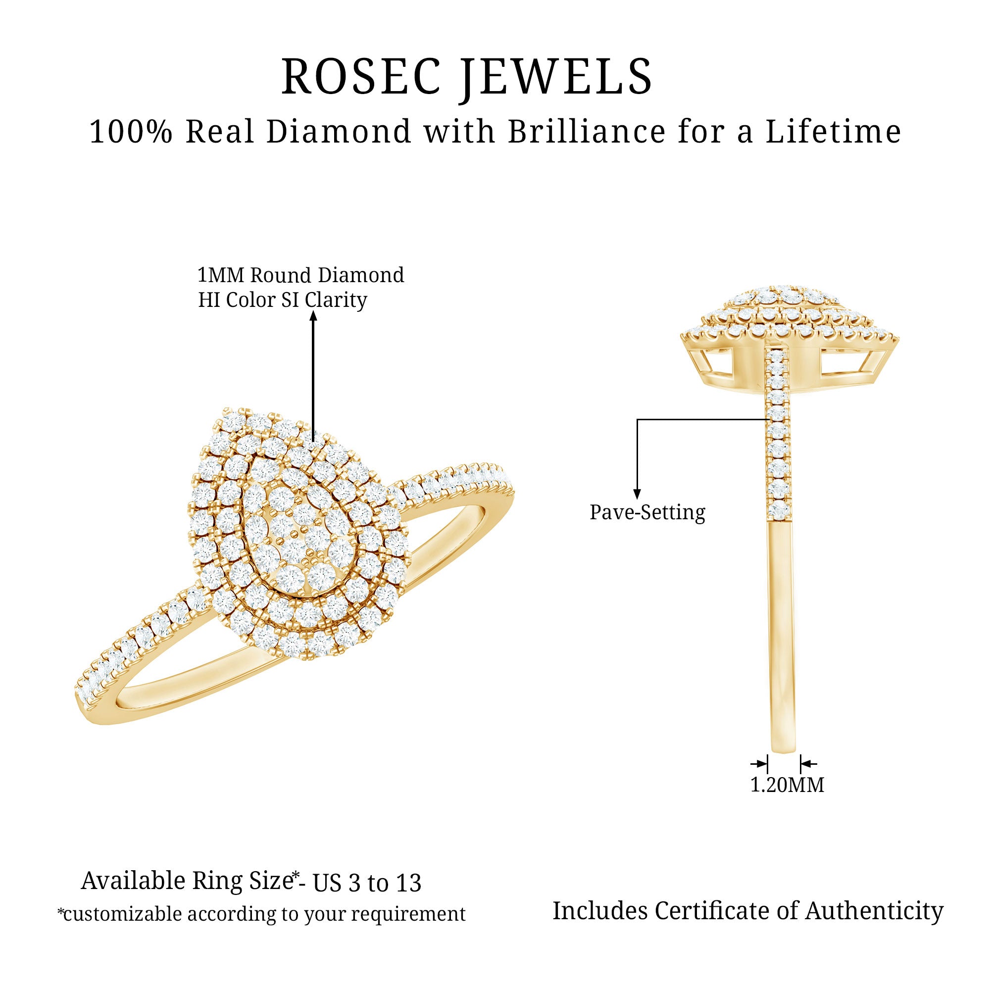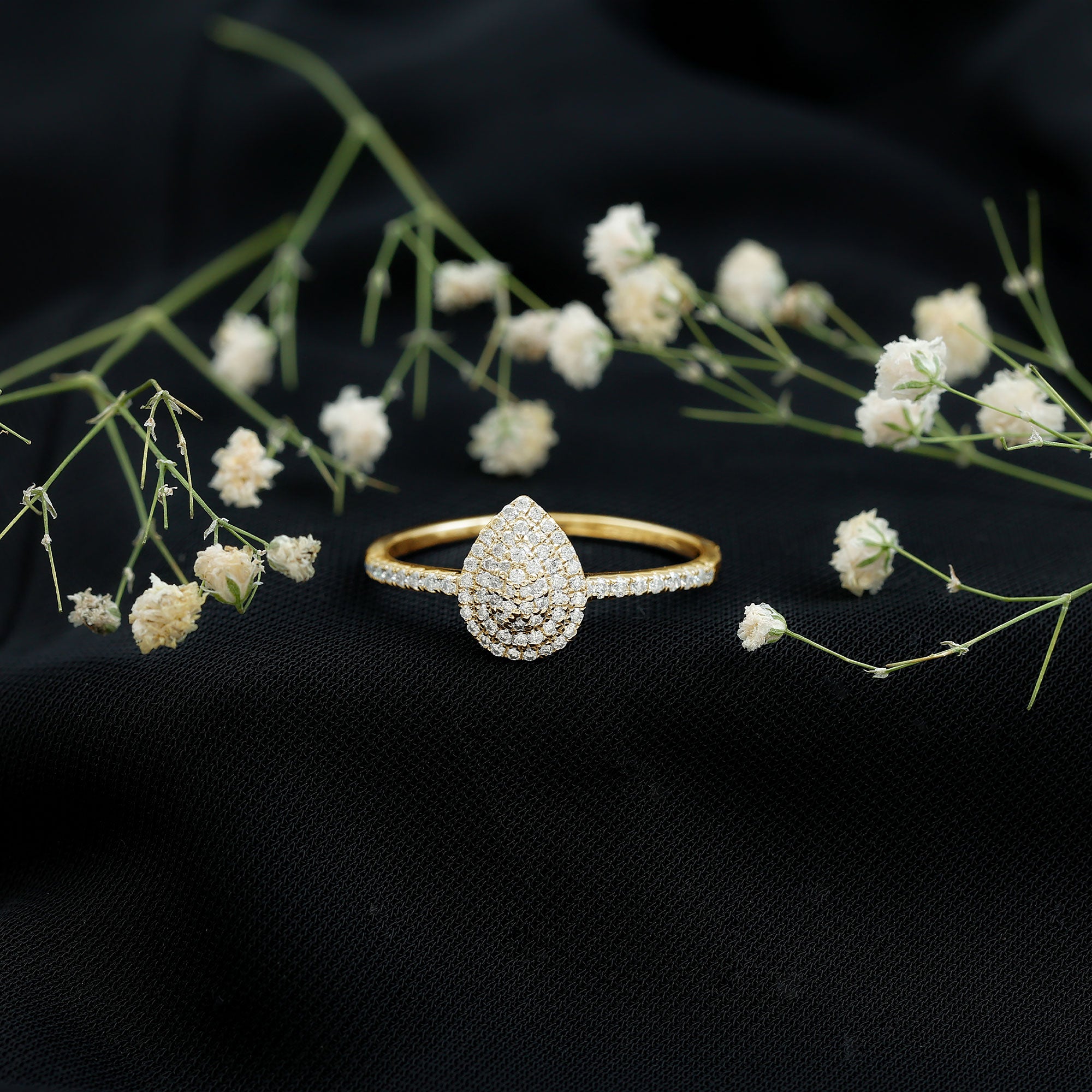 Steal the spotlight with this enchanting Diamond Engagement Ring that showcases the charm with elegance and grace. The epitome of exquisite, stunning beauty has a charming and delicate appeal. This Ring is adorned with Round Shape Diamond in Pave Setting on a Teardrop frame as a Double Halo. To accentuate the shank are the Side stones embedded with Round brilliant cut Diamond accent. Representing tears and joy, it symbolizes the journey of love and the emotions that come with it. Capture hearts with a unique style and deliver a dramatic presence. This Classic Diamond Ring is adorned with Round Shaped Diamond in a cluster form, and the double halo creates a dazzling appeal. As a statement of your love, this Teardrop Engagement Ring optimizes sparkle to shine without distraction. Despite being elegant and eye-catching, it manages to create an aura of excellence as the form gives an elongated appearance to your finger, for a more feminine appearance.