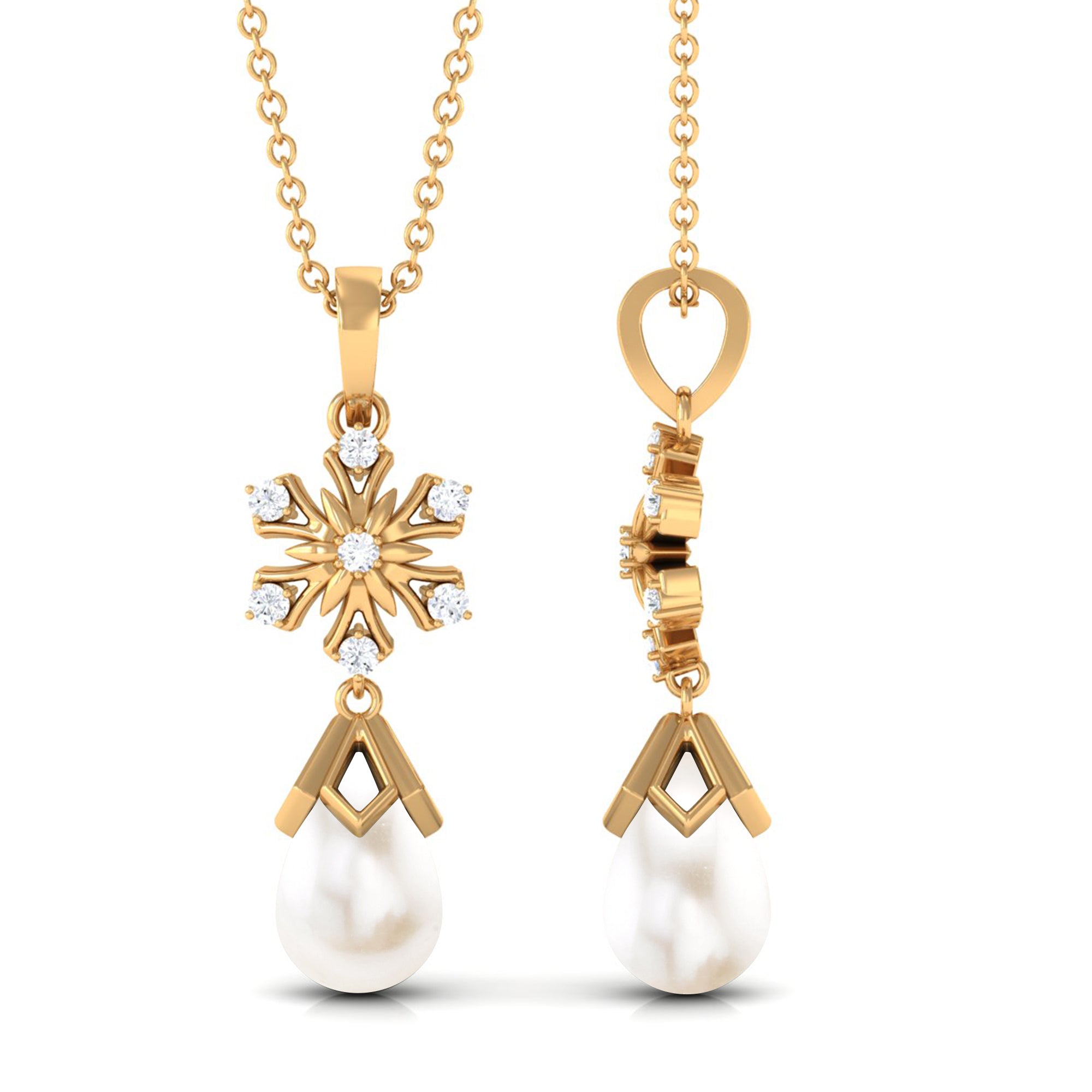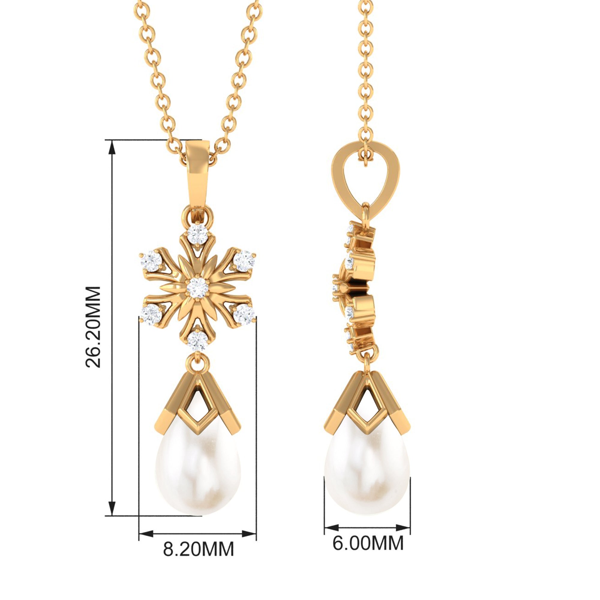 This Dangle Drop Pendant captures the enchanting beauty of winter. Features sparkling Diamonds studded on a snowflake design while a Drop Shape Freshwater Pearl adding a touch of elegance. Adorn your neck with this Pearl Pendant and let it become a cherished part of your jewelry collection, destined to spark conversations and turn heads wherever you go.