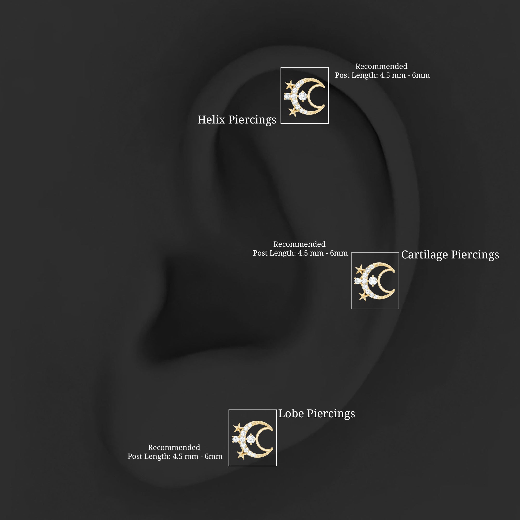 Inspired by the celestial bodies, this Diamond Star and Moon Earring add a touch of magic to your look.The earring features Diamonds in prong setting that sparkle and shine, catching the eye wherever you go.The earring is designed for the Helix Piercing, but can also be worn on multiple piercings like Cartilage, or Upper Lobe, adding a unique and edgy touch to your ear stack.This stunning Star and Moon Earring is versatile and elegant, making them perfect for any occasion.