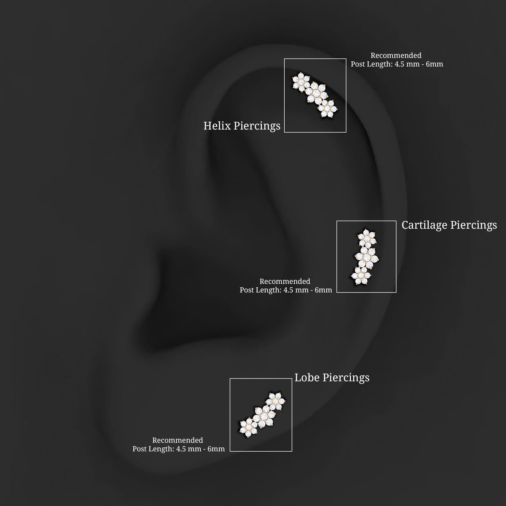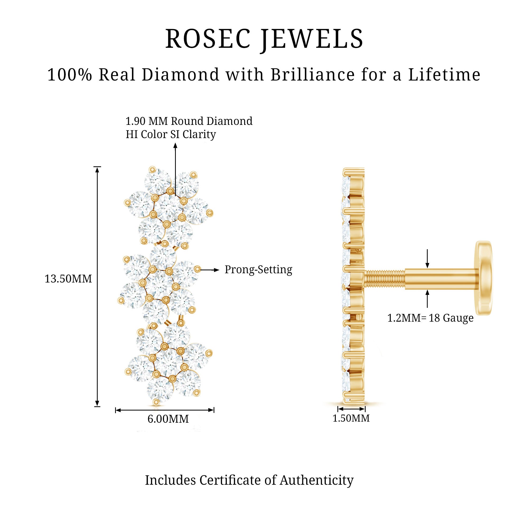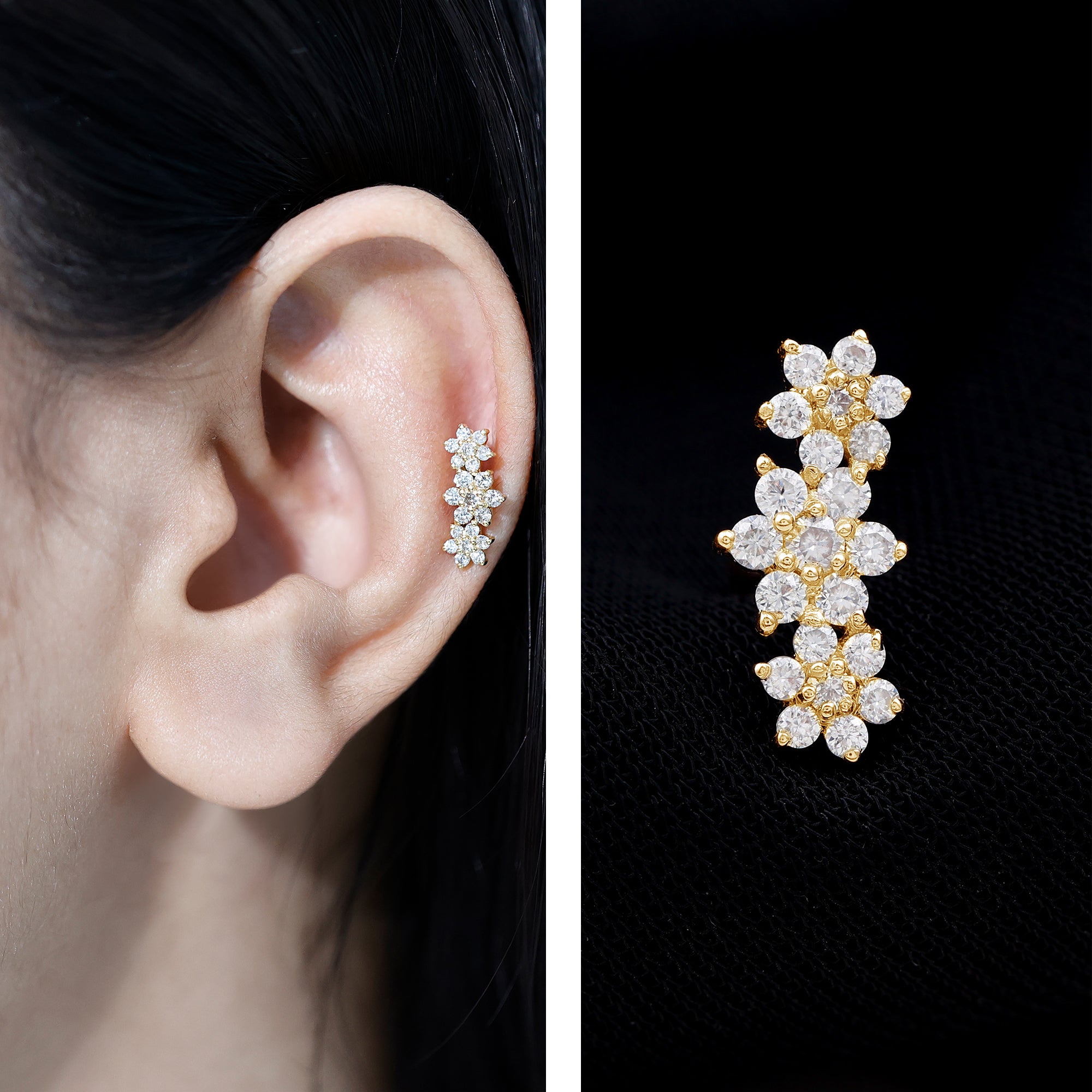 Are you ready to shine with some floral charm? Take a look at our stunning Diamond Flower Earring. It features sparkling Round Diamonds artfully arranged in three floral designs, providing just the right touch of brilliance. Wondering where to show off this floral beauty? You can effortlessly wear this Triple Flower Earring in your Cartilage, Helix, or Upper Lobe. And the best part? It has a Flat Back Closure, so you can rest easy knowing that sparkle will stay put. Plus, if you want to make your girls day unforgettable, this floral crawler earring makes for an ideal graduation gift that will help her shine like never before! It comes in a range of metal color choices and is also available in various metal types. This Ear Piercing Earring includes a certificate of authenticity for the gemstones and arrives in a luxurious storage box. You can pair it with your casual or party outfits to shine like a star. The Diamond Ear Crawler is the simplest way to elevate your style to new heights.