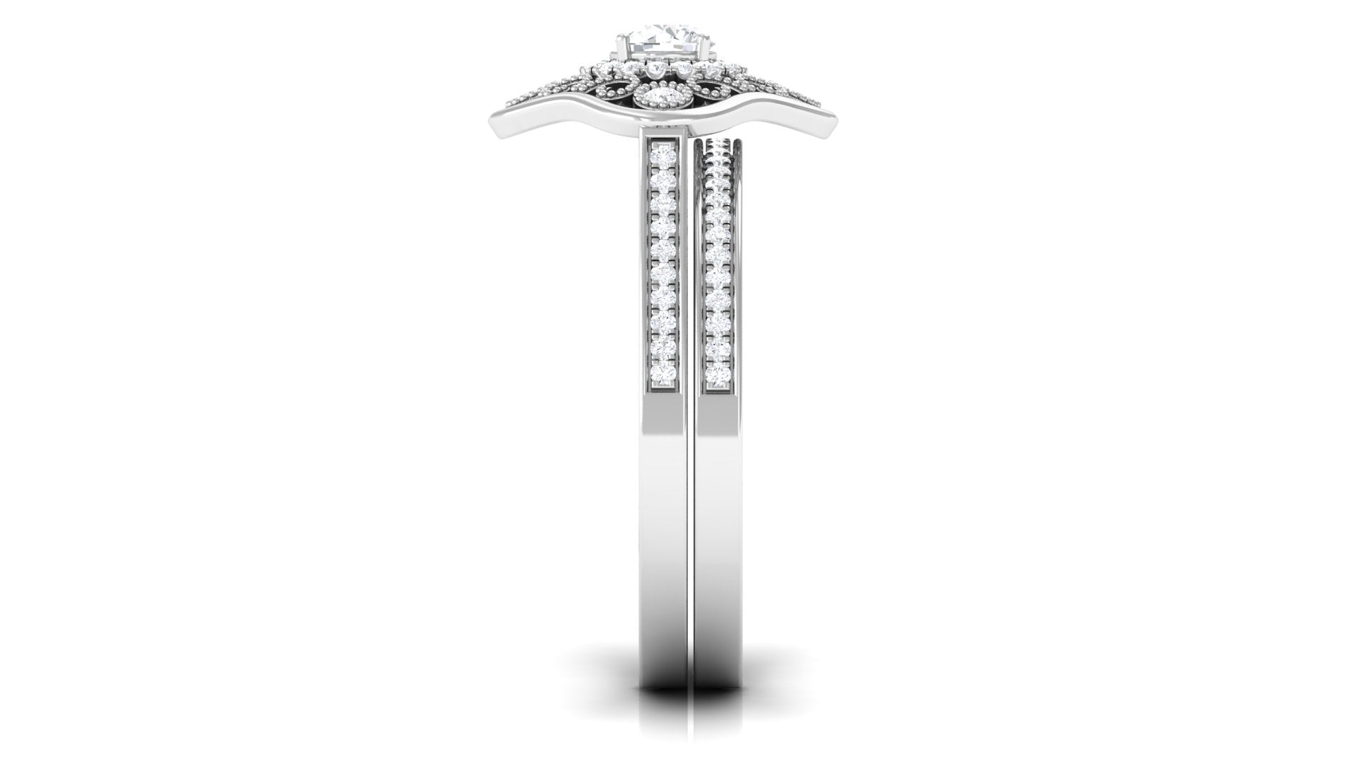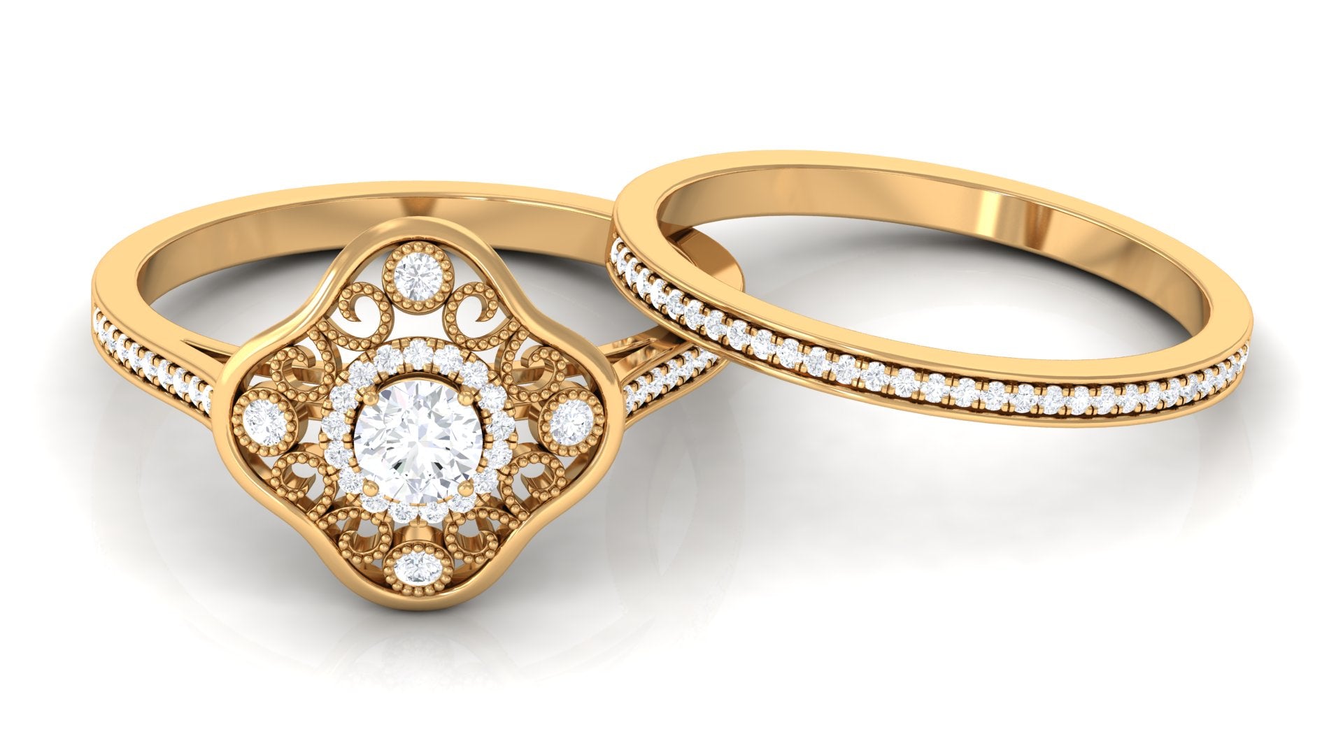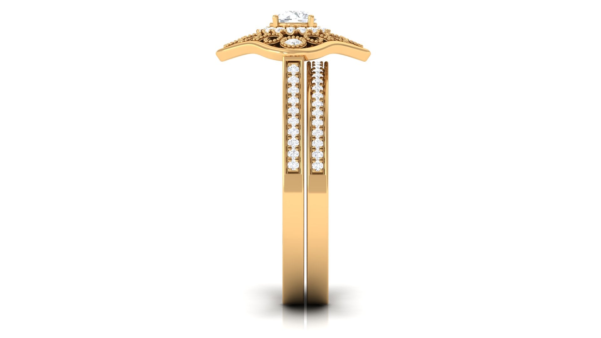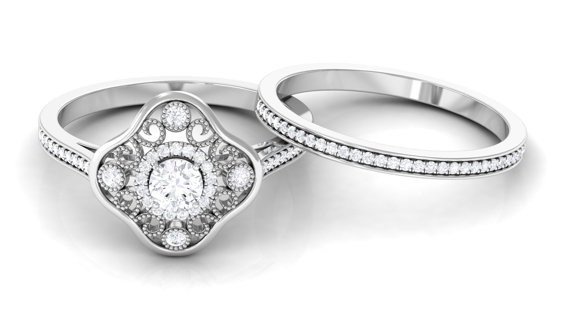 Symbolizing love and commitment, this Diamond Ring Set has a vintage design that makes it a stunning piece of jewelry that is truly inspired by the Art Deco era. Having a glamorous style, this Ring Set has an Engagement Ring with Wedding Band is a timeless and meaningful look that is ready to fall in love with you. The Engagement Ring is adorned with 4 mm Round Shape Diamond in Prong Setting, sitting in the center. Surrounded is the Diamond Halo and the design that would take you back into the bygone eras. The beaded details on the design have a unique aesthetic that makes it a timeless charm. To adorn the shank are Side Stones, giving them look enchanting appearance. To accompany this Vintage Inspired Engagement Ring is the band, which is beautified with round brilliant cut Diamond in a half eternity pattern, making it look like a vintage charm with the timeless allure that blends elegance with an enchanting visual allure. The HI Color SI Clarity Diamond has exceptional quality that endures through the ages and remains cherished as a unique Bridal Ring Set.