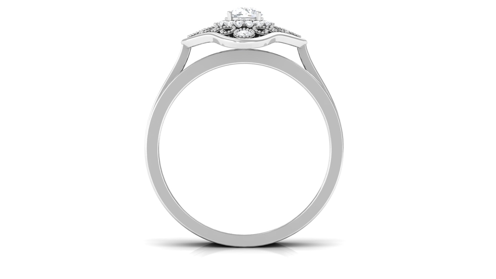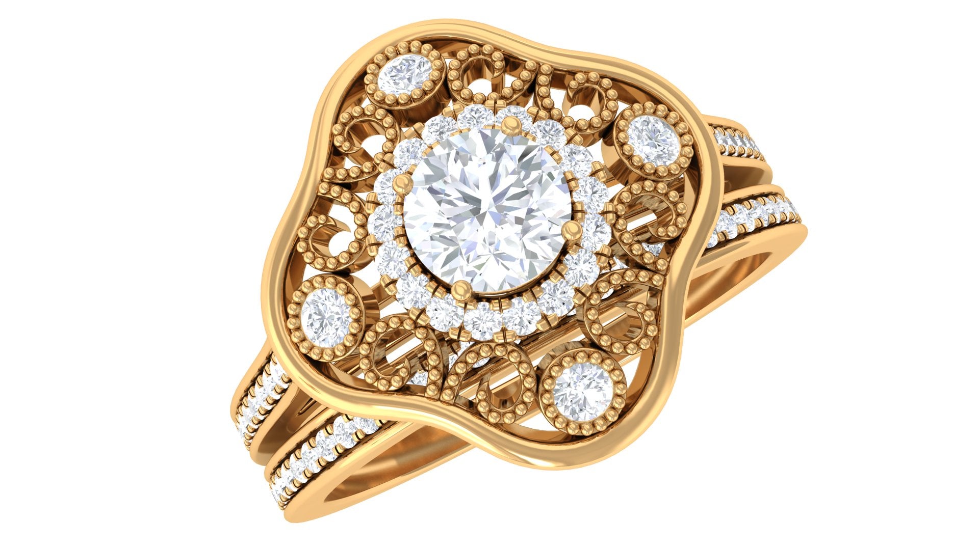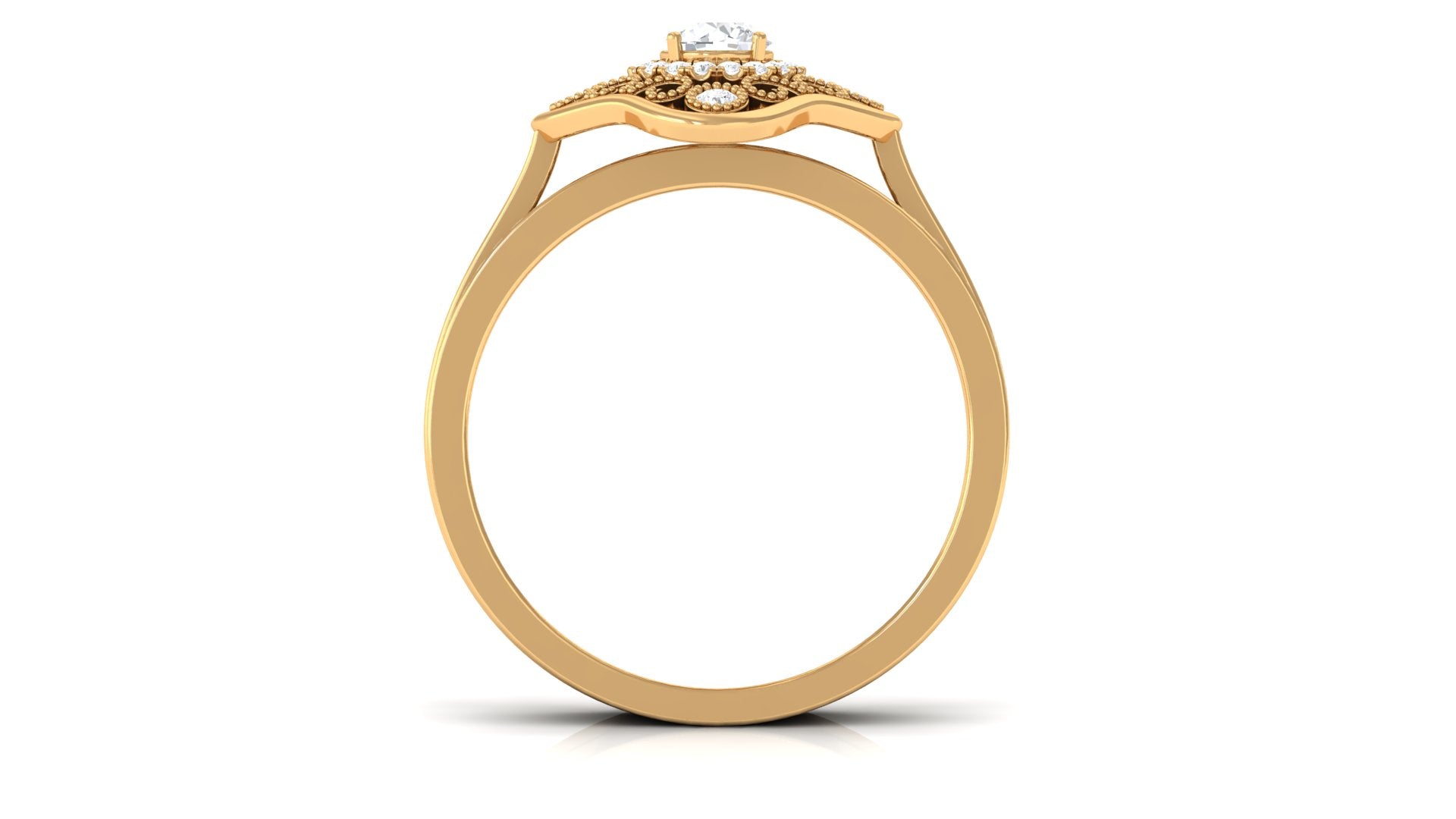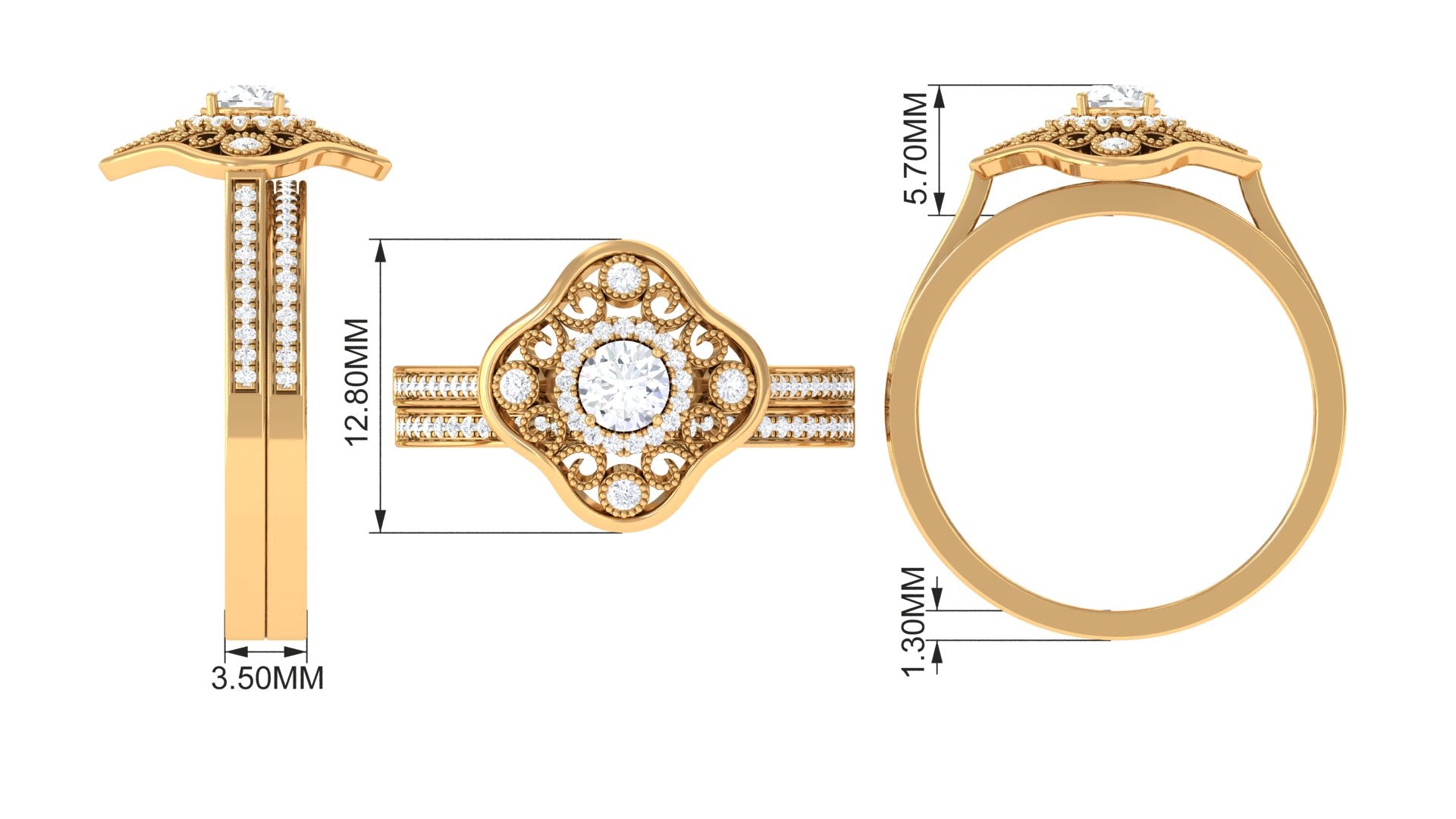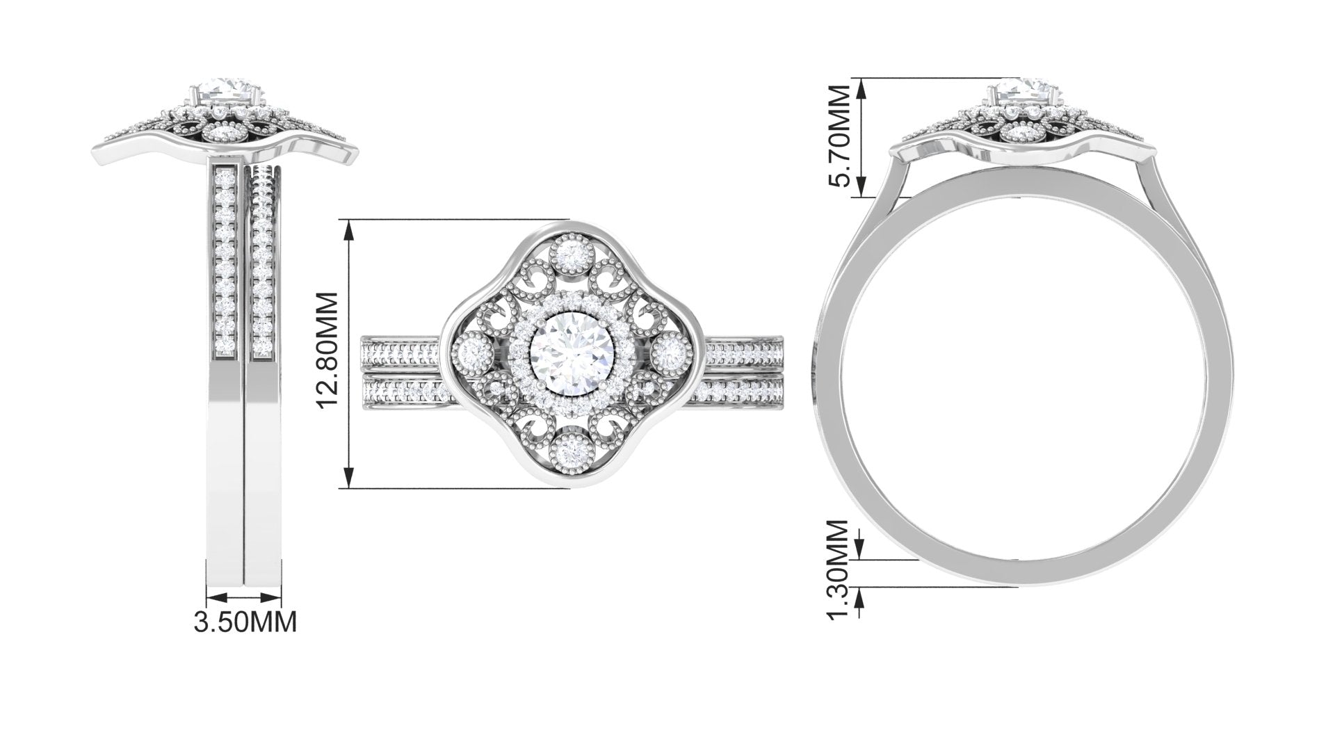 Symbolizing love and commitment, this Diamond Ring Set has a vintage design that makes it a stunning piece of jewelry that is truly inspired by the Art Deco era. Having a glamorous style, this Ring Set has an Engagement Ring with Wedding Band is a timeless and meaningful look that is ready to fall in love with you. The Engagement Ring is adorned with 4 mm Round Shape Diamond in Prong Setting, sitting in the center. Surrounded is the Diamond Halo and the design that would take you back into the bygone eras. The beaded details on the design have a unique aesthetic that makes it a timeless charm. To adorn the shank are Side Stones, giving them look enchanting appearance. To accompany this Vintage Inspired Engagement Ring is the band, which is beautified with round brilliant cut Diamond in a half eternity pattern, making it look like a vintage charm with the timeless allure that blends elegance with an enchanting visual allure. The HI Color SI Clarity Diamond has exceptional quality that endures through the ages and remains cherished as a unique Bridal Ring Set.