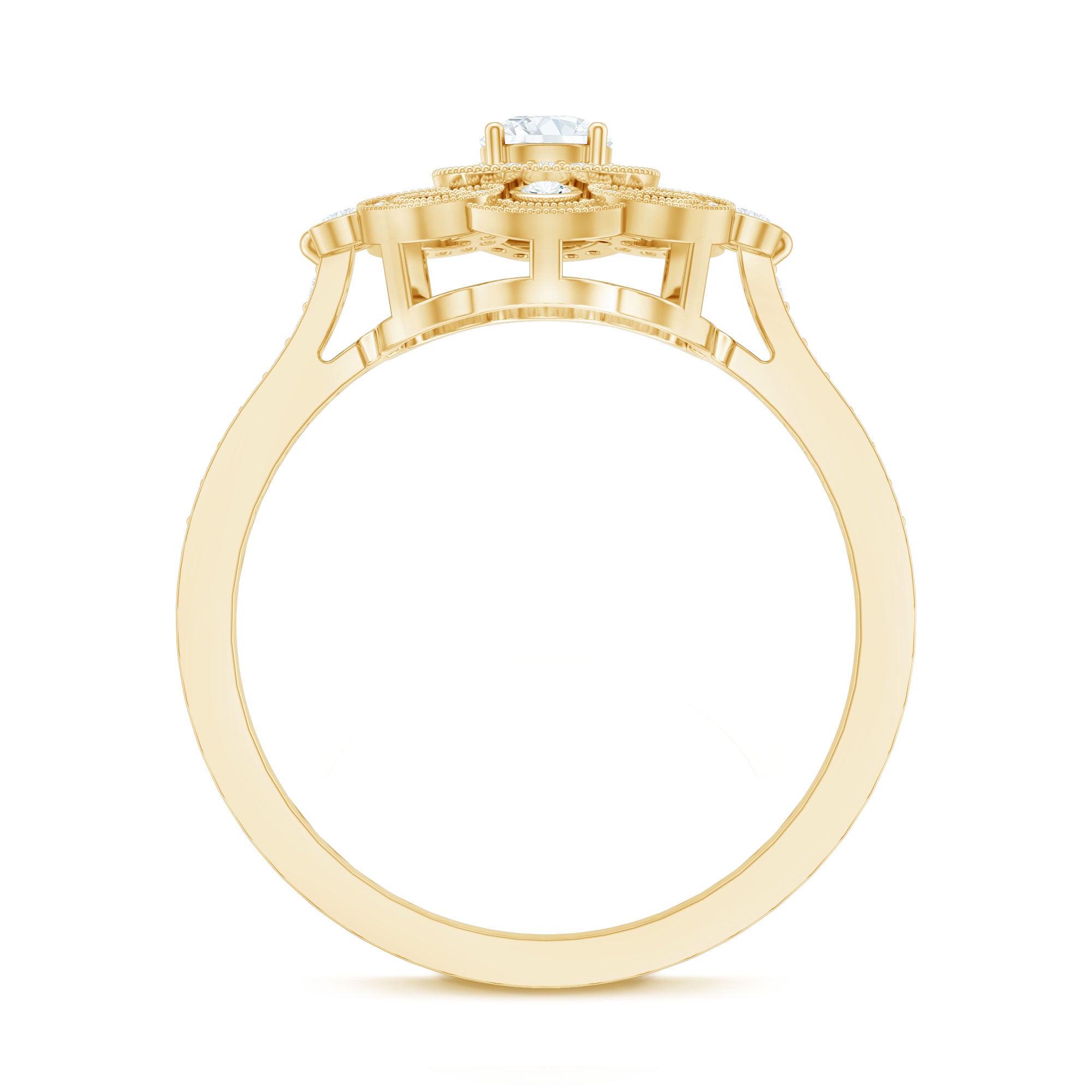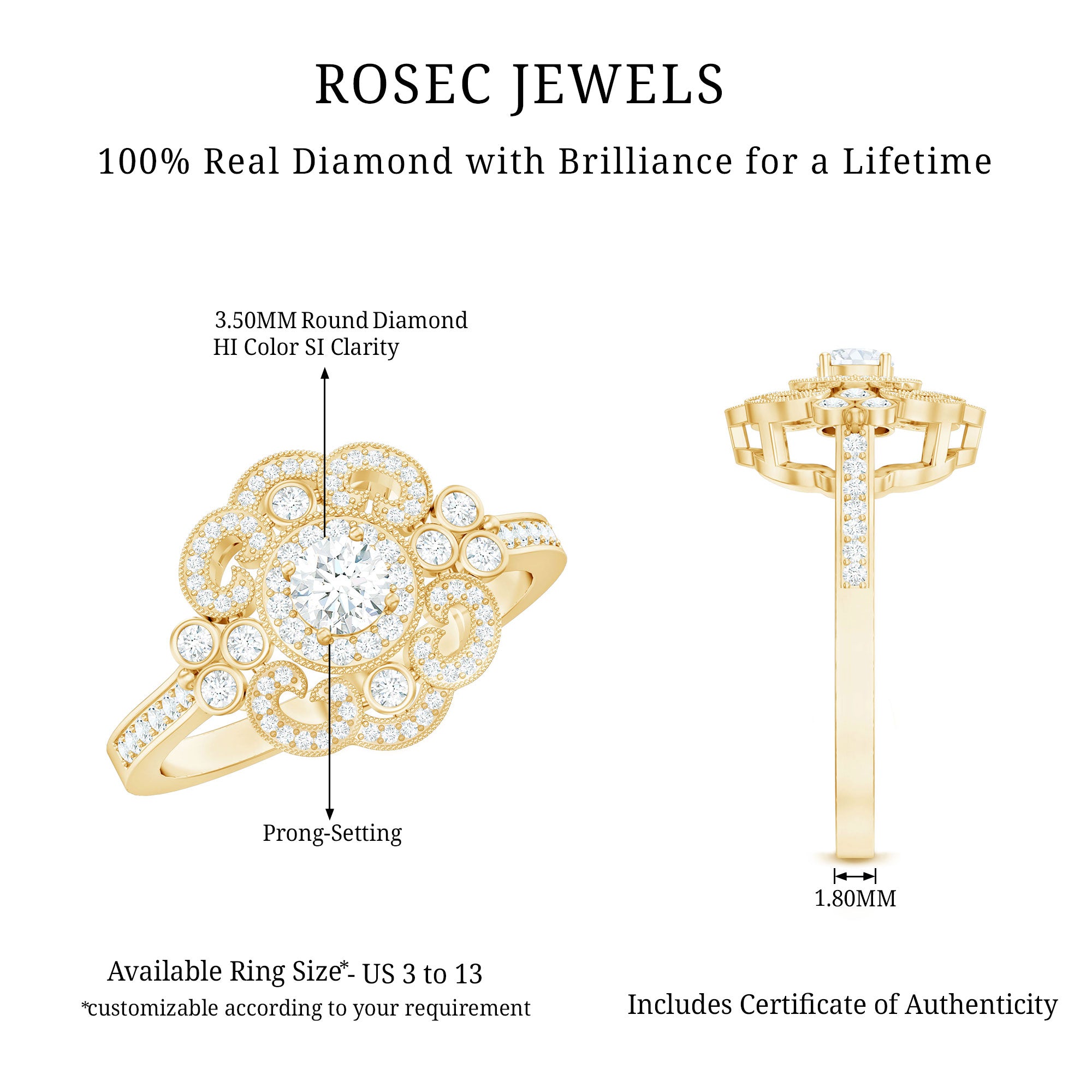 Step back into the enchanting allure of yesteryears with this breathtaking Real Diamond Engagement Ring, crafted to make you dazzle. It features a captivating design, showcasing a round cut diamond, elegantly secured in prong setting at the center, encircled by beaded detailing and smaller stones arranged in a unique pattern that highlights the beauty of this Antique Engagement Ring. Plus, it has side stones adorning the band in the most graceful manner, adding sparkle from every angle. All the diamonds in this Vintage Style Engagement Ring are of HI-SI Quality, ensuring they are both brilliantly sparkling and undeniably stunning. With its timeless charm and contemporary shine, this Diamond Art Deco Ring serves as a lovely symbol of everlasting love. Make a bold statement with this classic piece that merges traditional elegance with vintage allure. This beautiful Vintage Diamond Ring will enhance any outfit, providing a touch of refined shine and sophistication. Furthermore, it comes in a range of metal colors and purity options, letting you select what best fits your style.