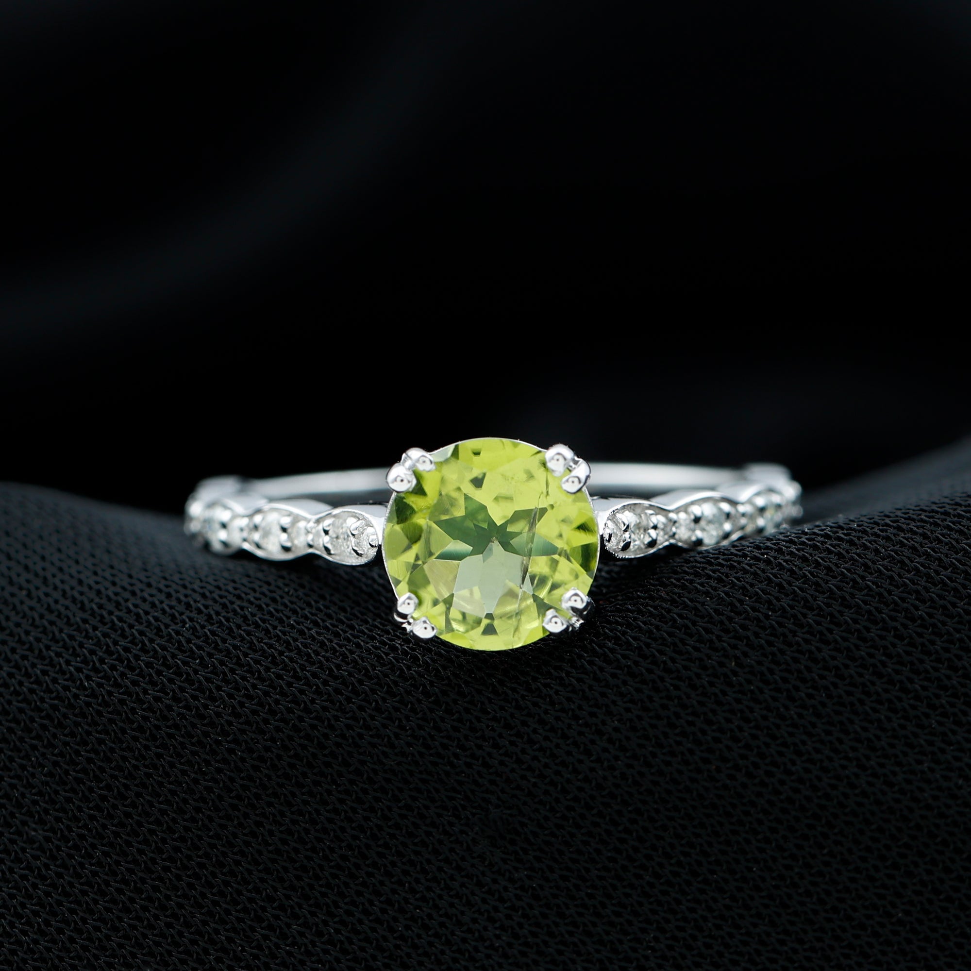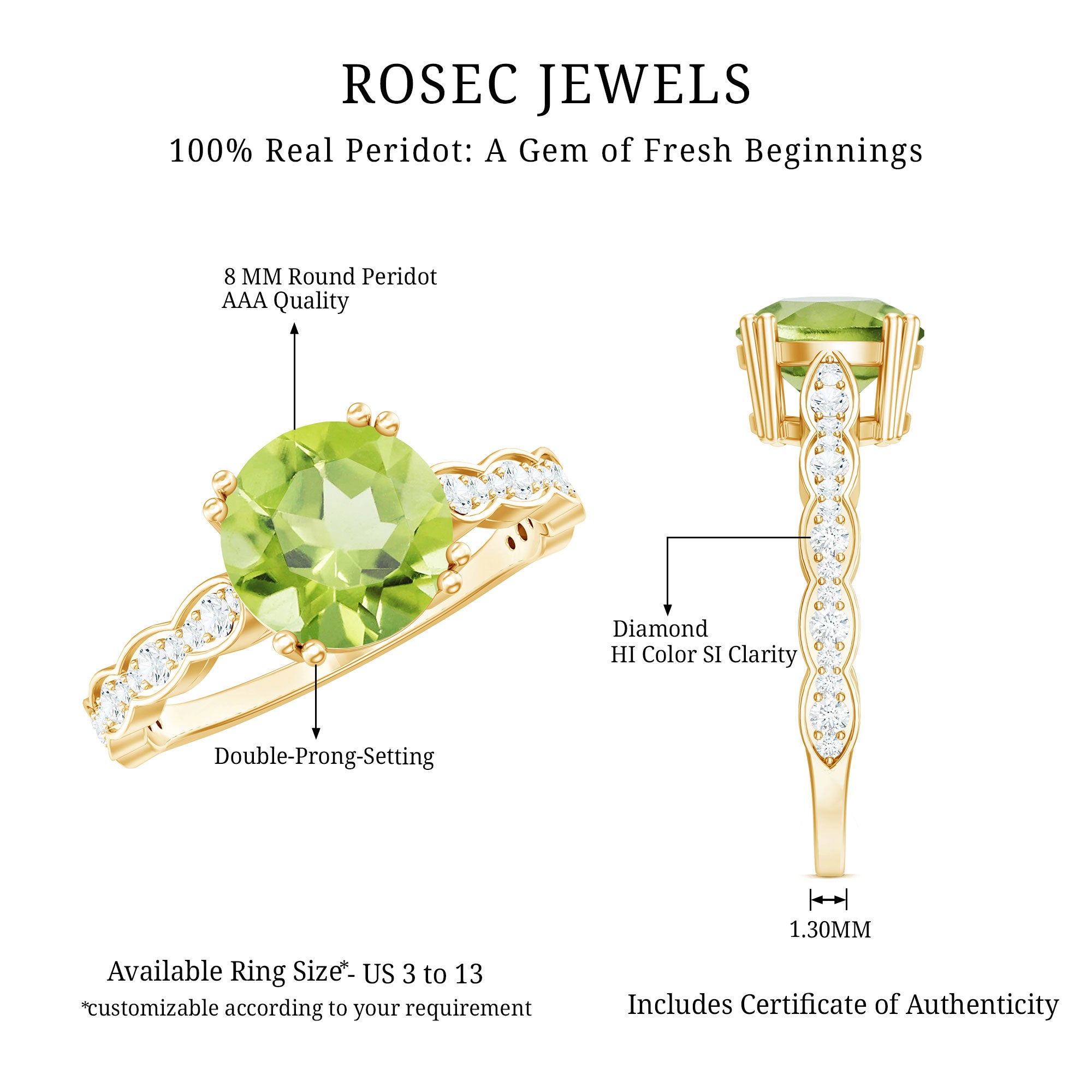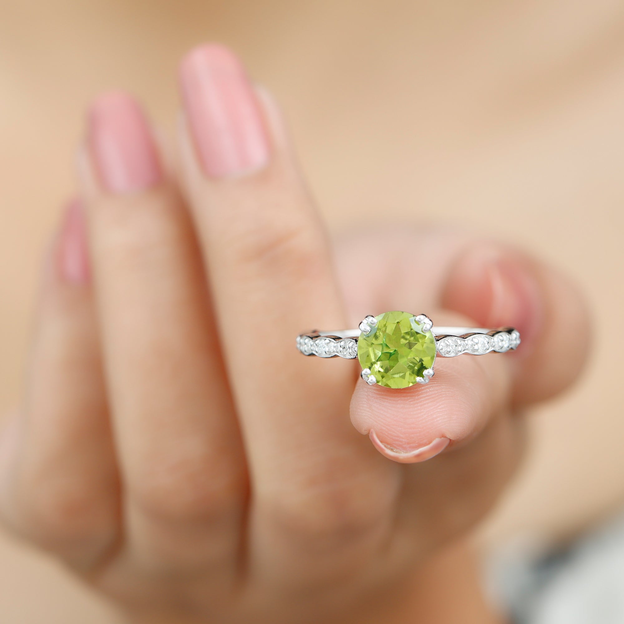 The Solitaire Engagement Ring is a lovely piece encased with 8 MM Round Shaped Peridot as a Solitaire in Double Prong Setting and the Unique Design is set with Diamond as Side Stones. Grab this Beautiful Ring for your Lady Love as a Gift.