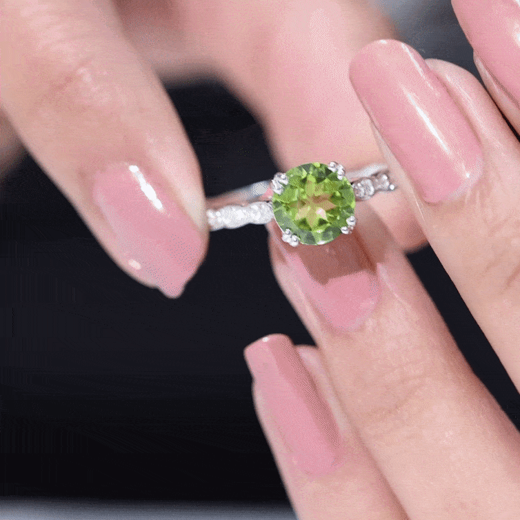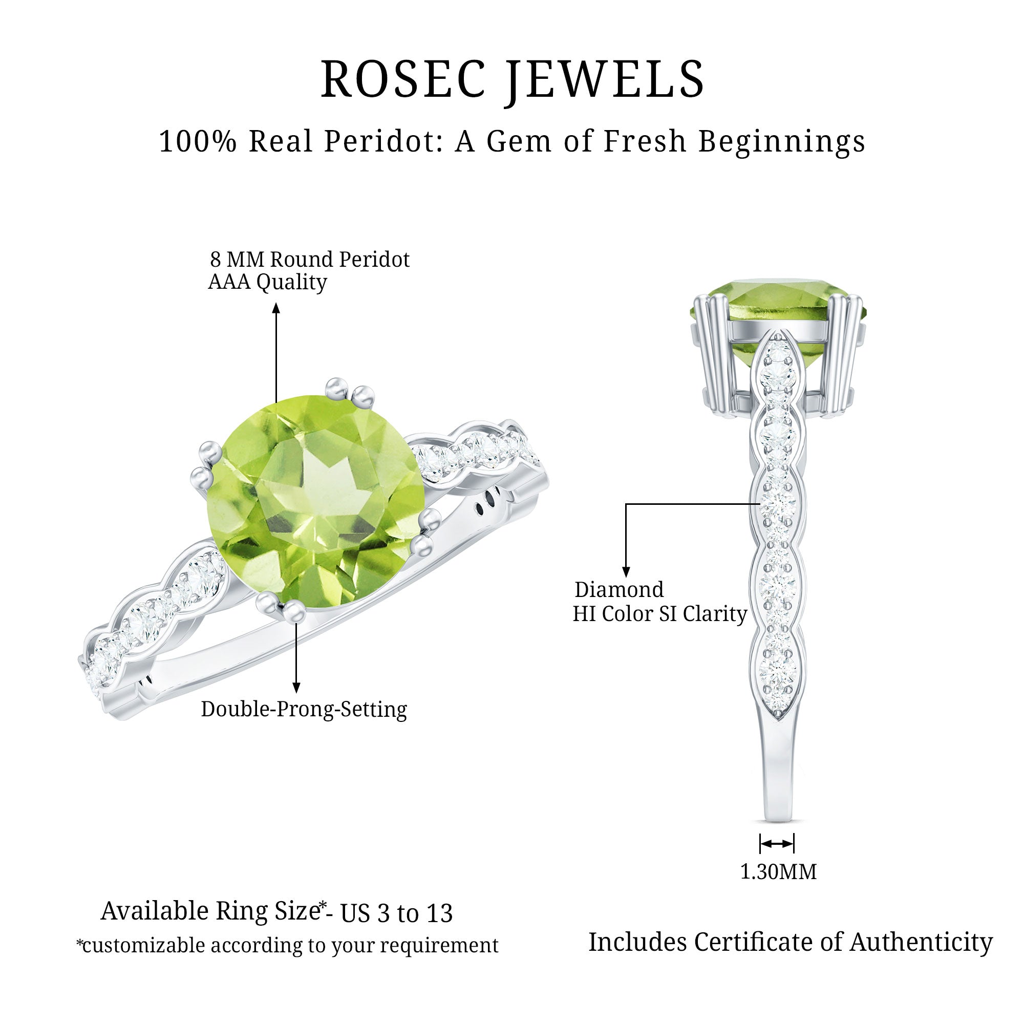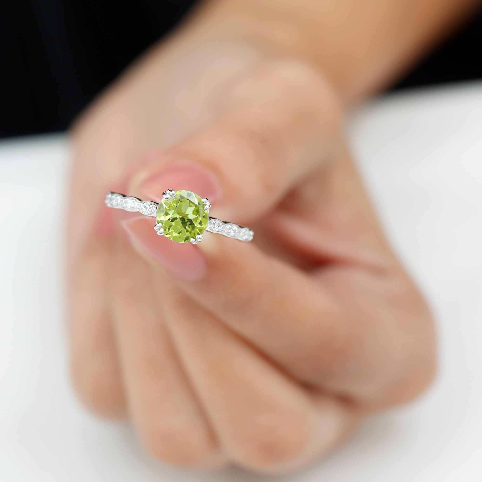 The Solitaire Engagement Ring is a lovely piece encased with 8 MM Round Shaped Peridot as a Solitaire in Double Prong Setting and the Unique Design is set with Diamond as Side Stones. Grab this Beautiful Ring for your Lady Love as a Gift.