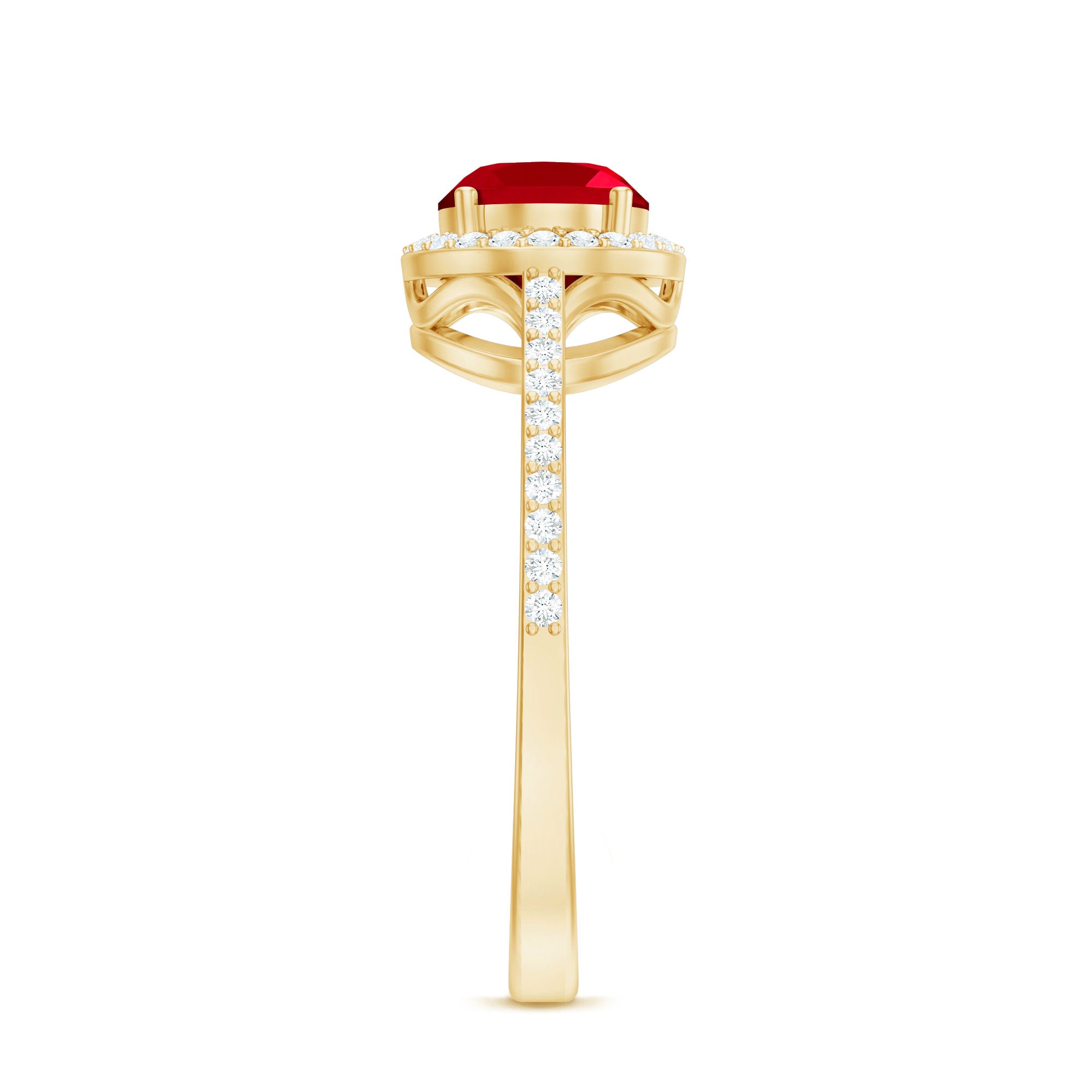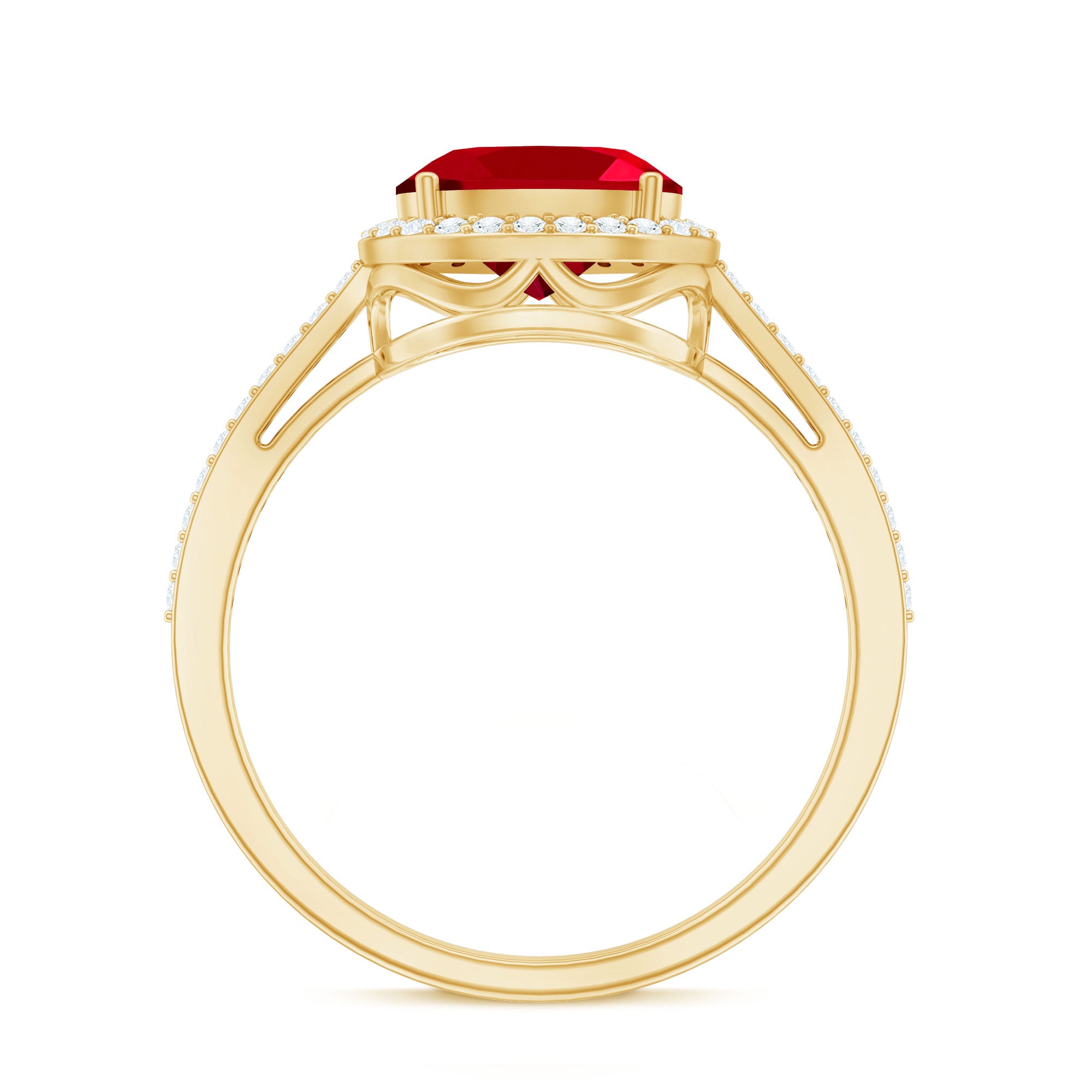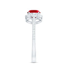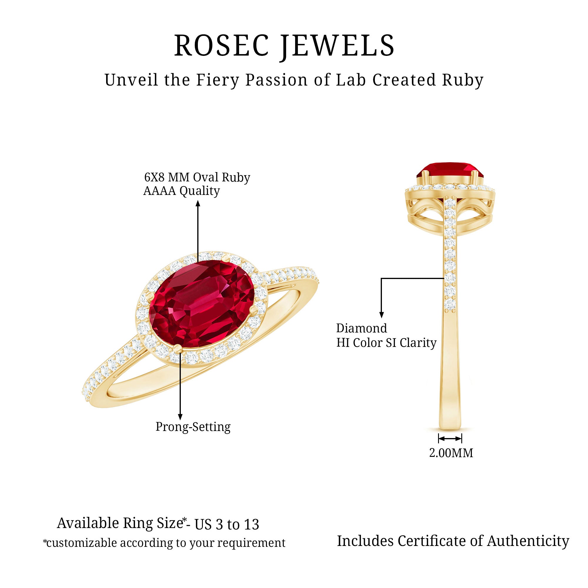 Step into modern elegance with this stunning Lab Created Ruby Engagement Ring, designed to shine with beauty and meaning. At its center lies a 6X8 MM oval shaped lab grown ruby, set horizontally in an elegant east west style for a fresh and modern look. The ruby’s red color symbolizes love and passion, making it a perfect choice for a heartfelt promise. Surrounding the center stone is a sparkling halo of round diamond stones that enhance the ruby’s brilliance and add a touch of glamour. Additional diamond side stones along the band create extra sparkle, making the Oval Shaped Engagement Ring glow beautifully from every angle. This Lab Made Ruby and Diamond Ring combines timeless elegance with a unique and modern twist. Its sleek design and shimmering details make it perfect for the bride who loves a balance of classic beauty and contemporary style. Crafted with care and precision, the smooth band ensures both comfort and durability for everyday wear. Whether for an engagement, anniversary, or special occasion, this East West Engagement Ring is a true symbol of love and devotion. Available in various sizes for a perfect fit, this exquisite Oval Halo Ring is sure to become a treasured piece that tells your love story with grace and sparkle.