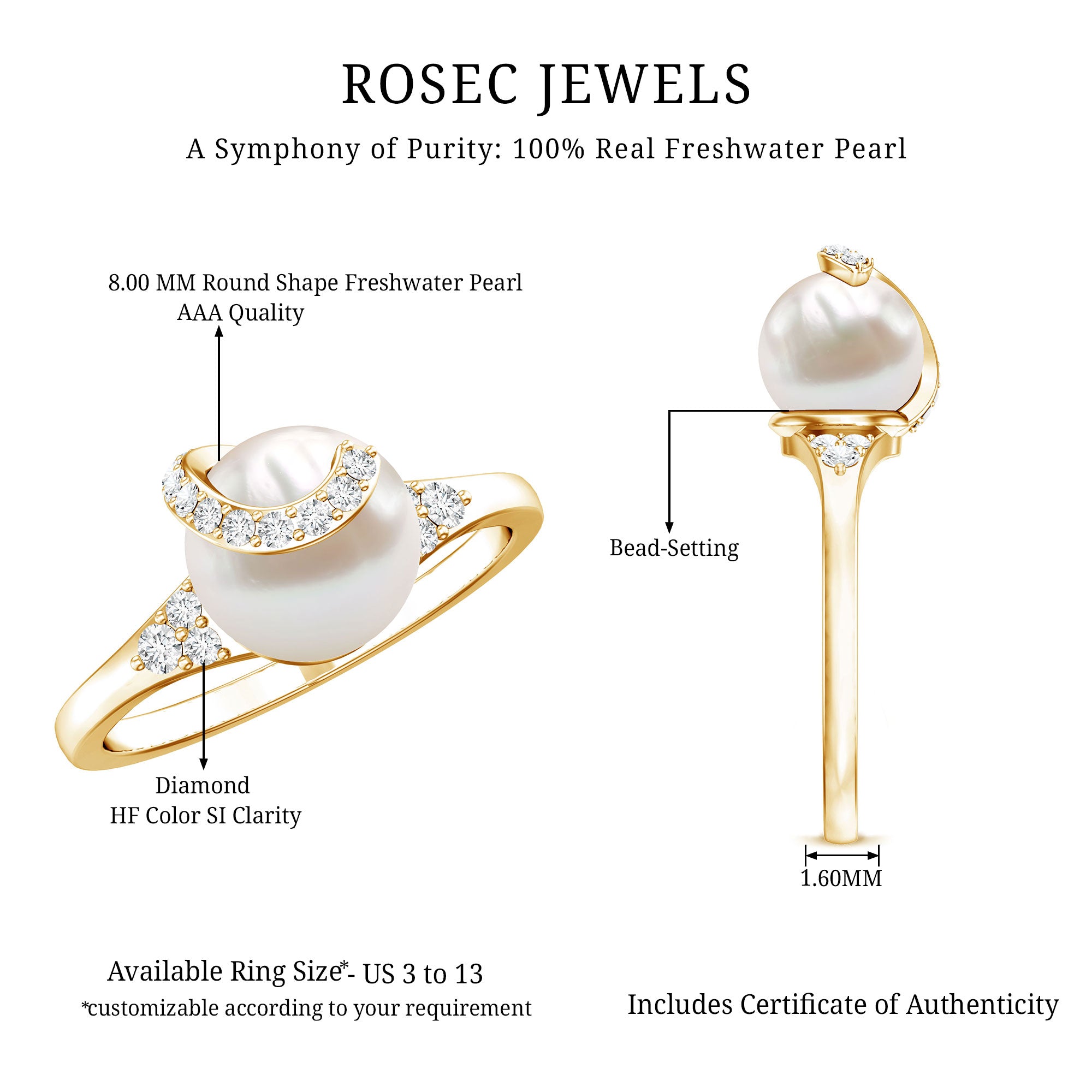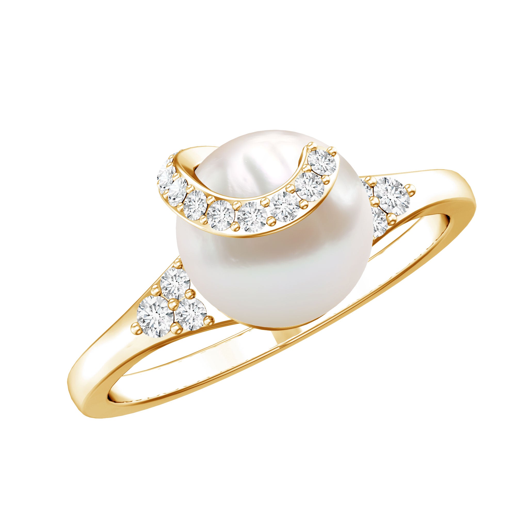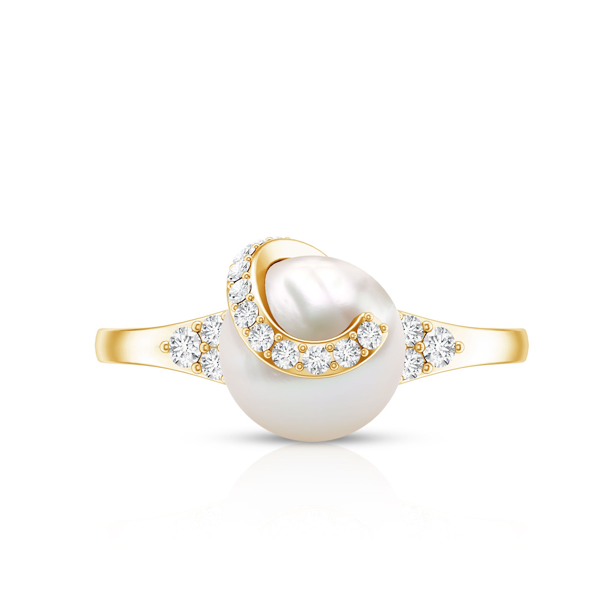 A classic piece with timeless appeal this Pearl Solitaire Engagement Ring is adorned with the brilliant Round Shape Freshwater Pearl with Round Diamond set on Trio and on above the pearl. This Freshwater Pearl Ring is crafted in Gold. This charming White Freshwater Pearl and Diamond Ring make a trendy and elegant choice for your big day.