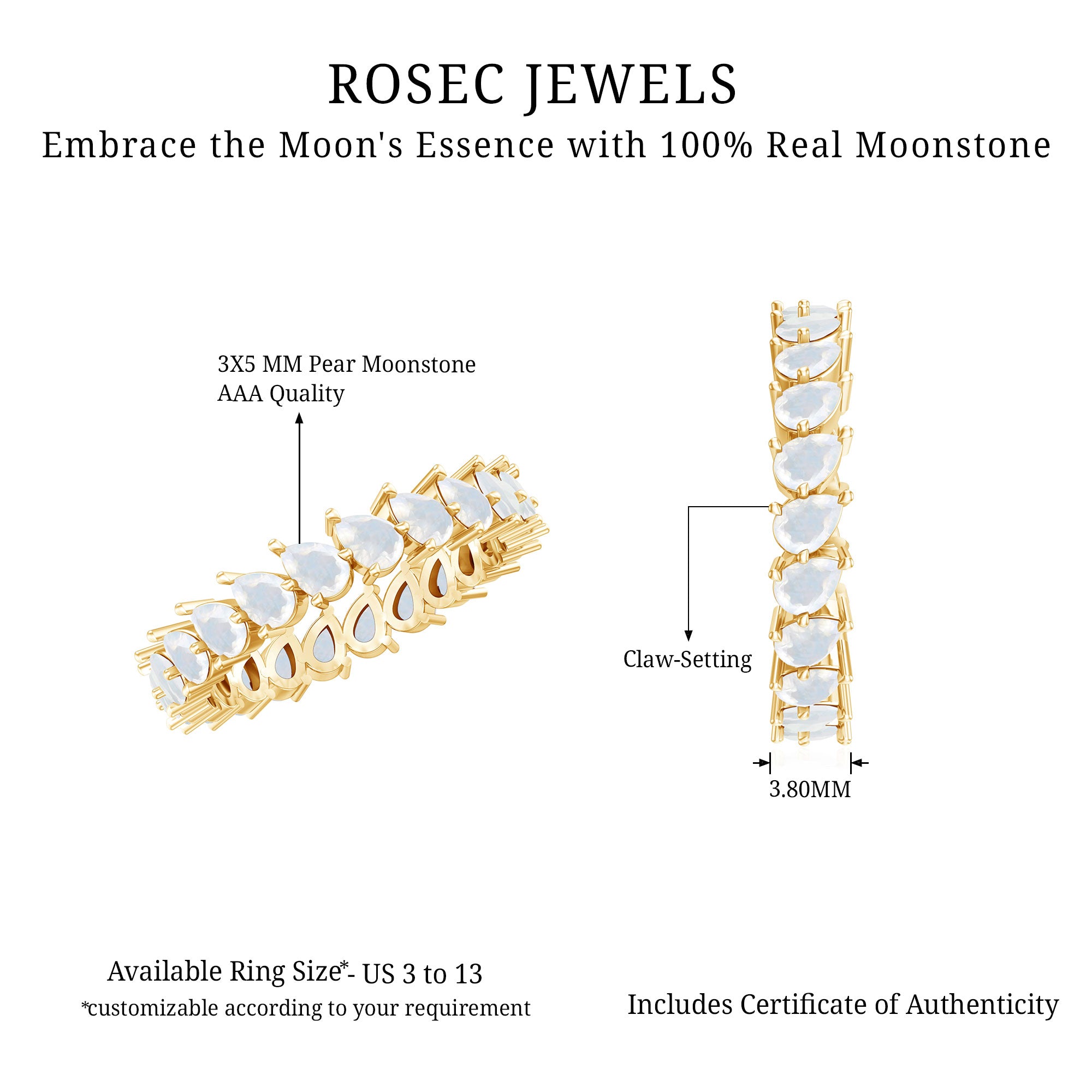 Celebrate her uniqueness and youthful charm with this stunning eternity ring. The Pear cut moonstones are delicately set in a claw setting, exuding simplicity and elegance. Mark her birthday with a special touch by gifting this exquisite June birthstone ring. Its timeless design and enchanting beauty will make her feel truly cherished and loved.