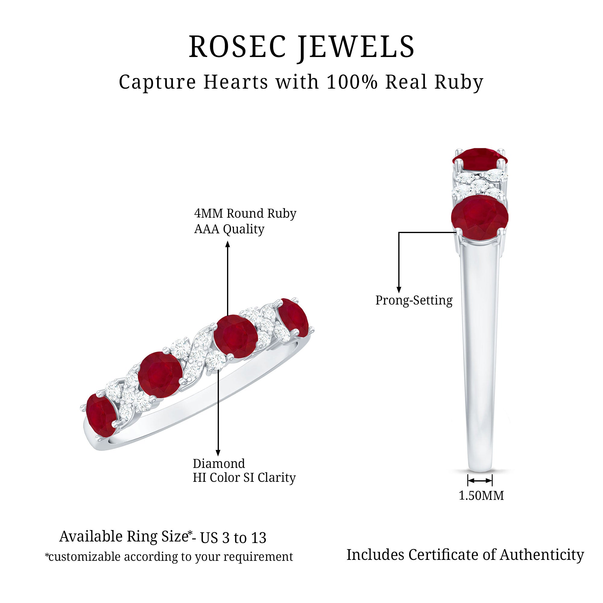 Gift her a Ruby XOXO Half Eternity Ring and shower her with the kind of hugs and kisses that she never has to let go of! Bringing together a bold pop of color and lots of sparkles, it features Round Shape Ruby and Diamond mounted together in an alternating pattern partially over the band, held by Prong Setting. From making a striking statement on its own to breathing life into your dream ring stack when worn along with other pieces, this Certified Ruby and Diamond Ring can do it all and more.