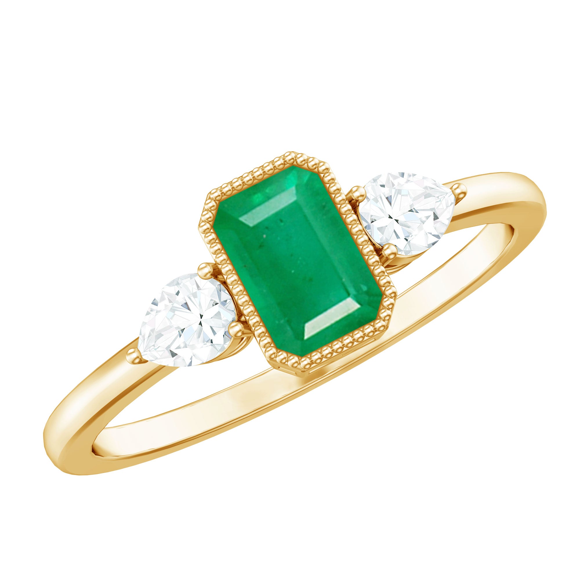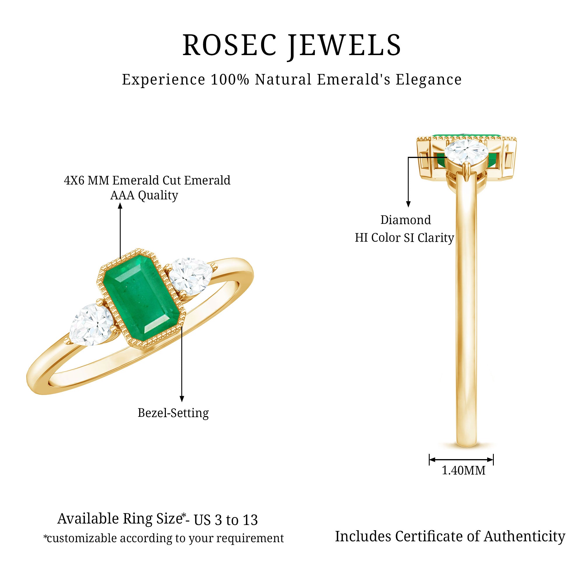 This gorgeous Emerald Engagement Ring features a astonishing 4x6mm emerald cut emerald as its centerpiece. The emerald is elegantly set in a classic yet bezel setting, with breathtaking diamonds adorning the band. This Emerald and Diamond Ring exudate worldliness and timeless beauty, making it the perfect choice for someone who appreciates trendy designs. The rich green hue of the emerald symbolizes love, renewal and growth, making it an ideal choice for an engagement ring or a commitment ring. Verdant hue of the emerald is spotlight by sparkling pear shape Diamond accents, establishing a striking contrast and enhancing this outstanding pieces appeal. This Bezel Engagement ring, which was painstakingly designed and beautifully crafted, is the ideal option for anyone looking for a stylish and one-of-a-kind piece of jewelry that commemorates their love in a very special way. This Emerald Cut Engagement Ring will be treasured for a lifetime due to its timeless yet contemporary charm.