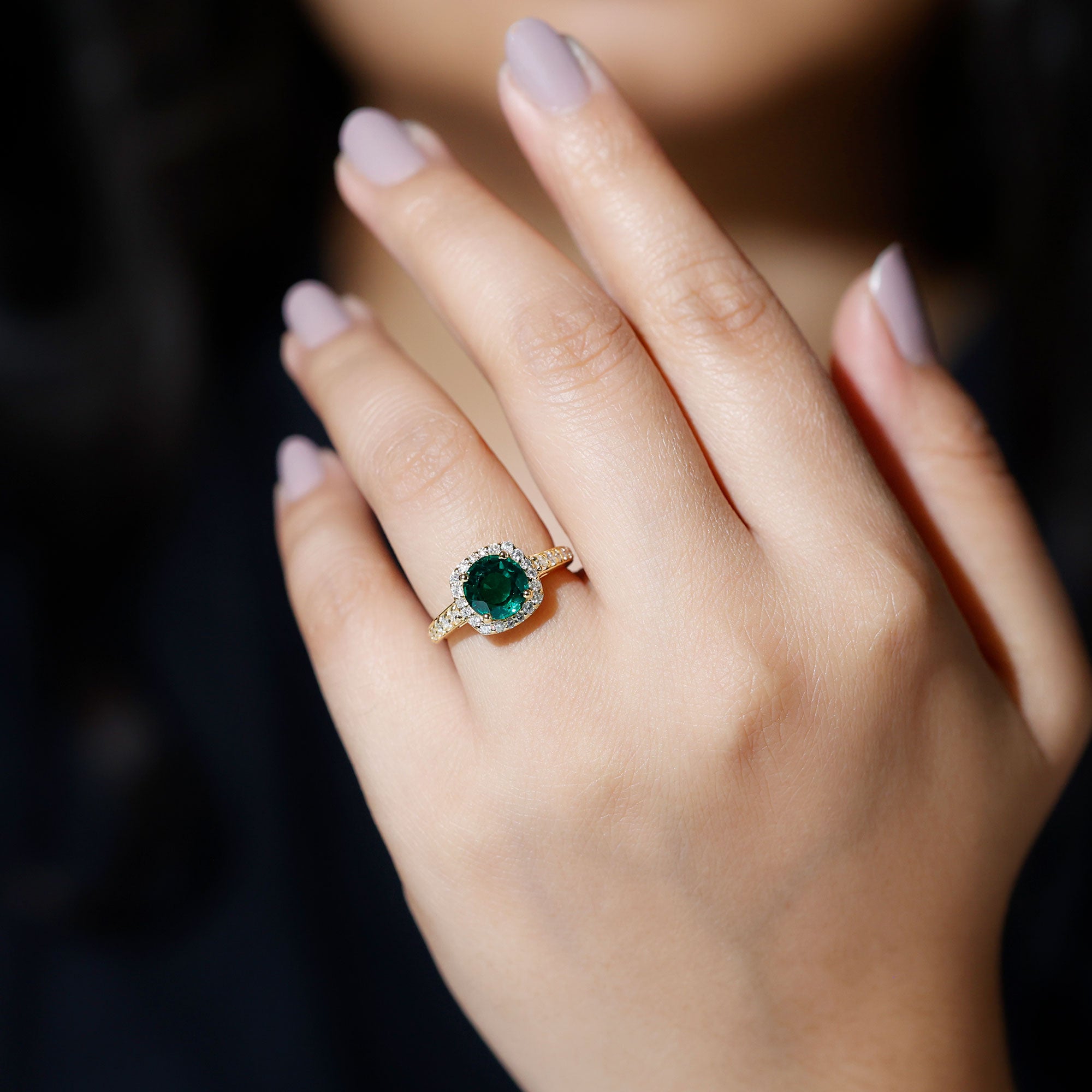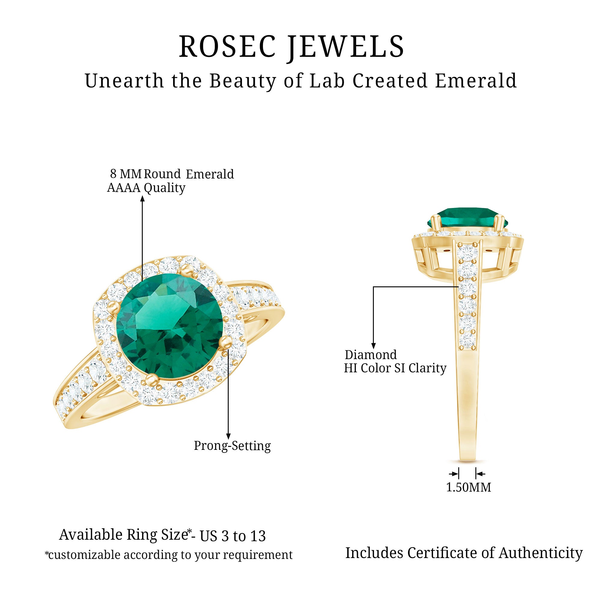 Discover the perfect blend of vintage charm and modern brilliance with this Lab Grown Emerald Engagement Ring. Designed to capture hearts, this Vintage Style Engagement Ring features a stunning 8 mm Round Lab Created Emerald, radiating a rich green hue. Surrounding the AAAA Quality Lab Emerald is a delicate Halo of sparkling Diamond, designed to amplify its color and brilliance while adding a touch of classic elegance. This Emerald Halo Engagement Ring is adorned with additional Diamond side stones, carefully placed to enhance the intricate design of the ring and create a timeless appeal. Handcrafted with meticulous attention to detail, this Lab Emerald Diamond Engagement Ring captures the romance of a bygone era while embracing today’s ethical standards. Its intricate design makes it a standout piece, perfect for the bride who cherishes history, elegance and unique style. Packaged in a Signature Jewelry Box and available in various ring sizes, this Lab Grown Emerald Ring is ready to symbolize a love that is both timeless and forward-looking, a true celebration of commitment.