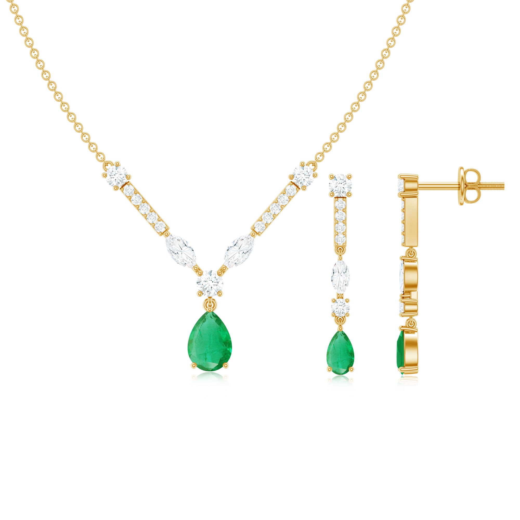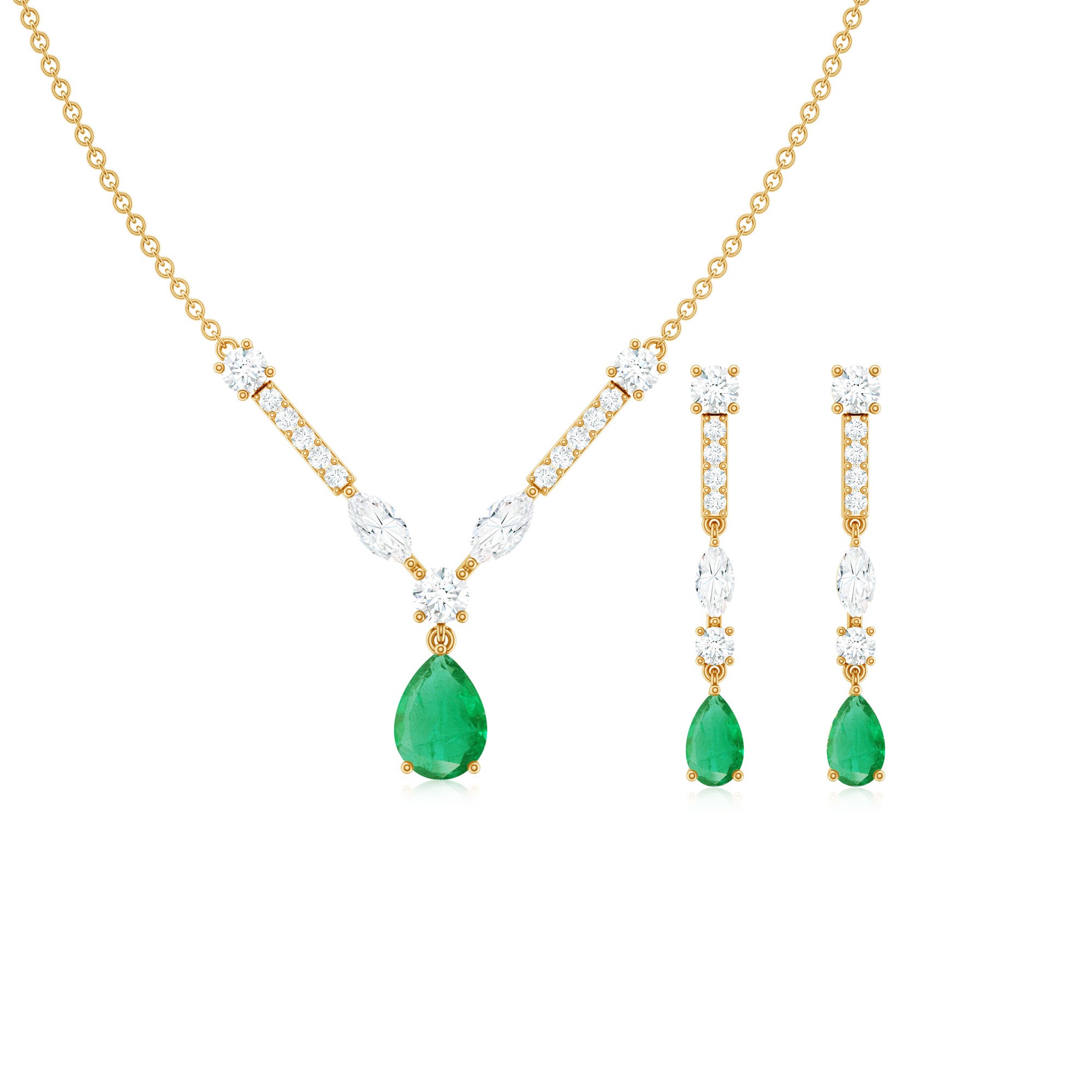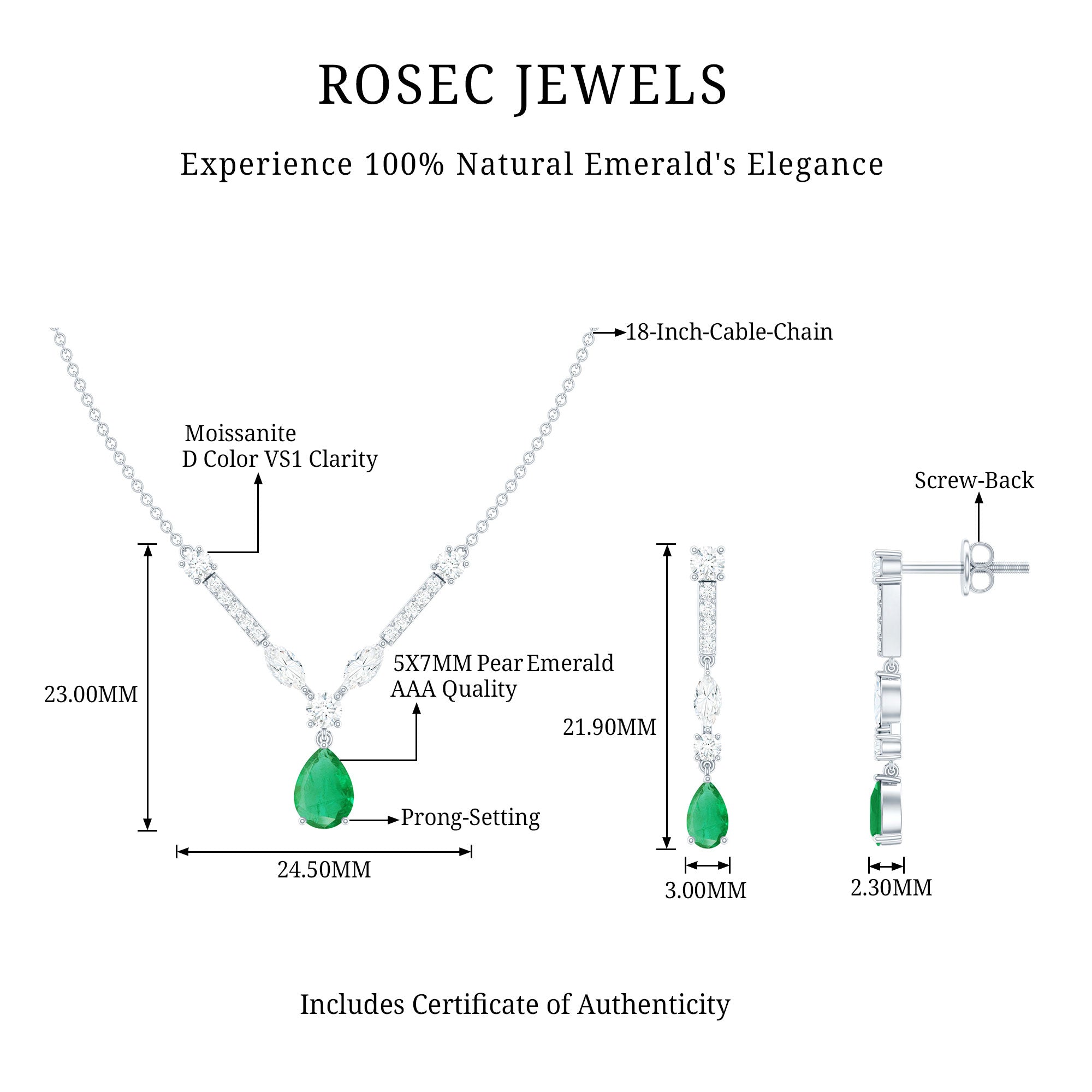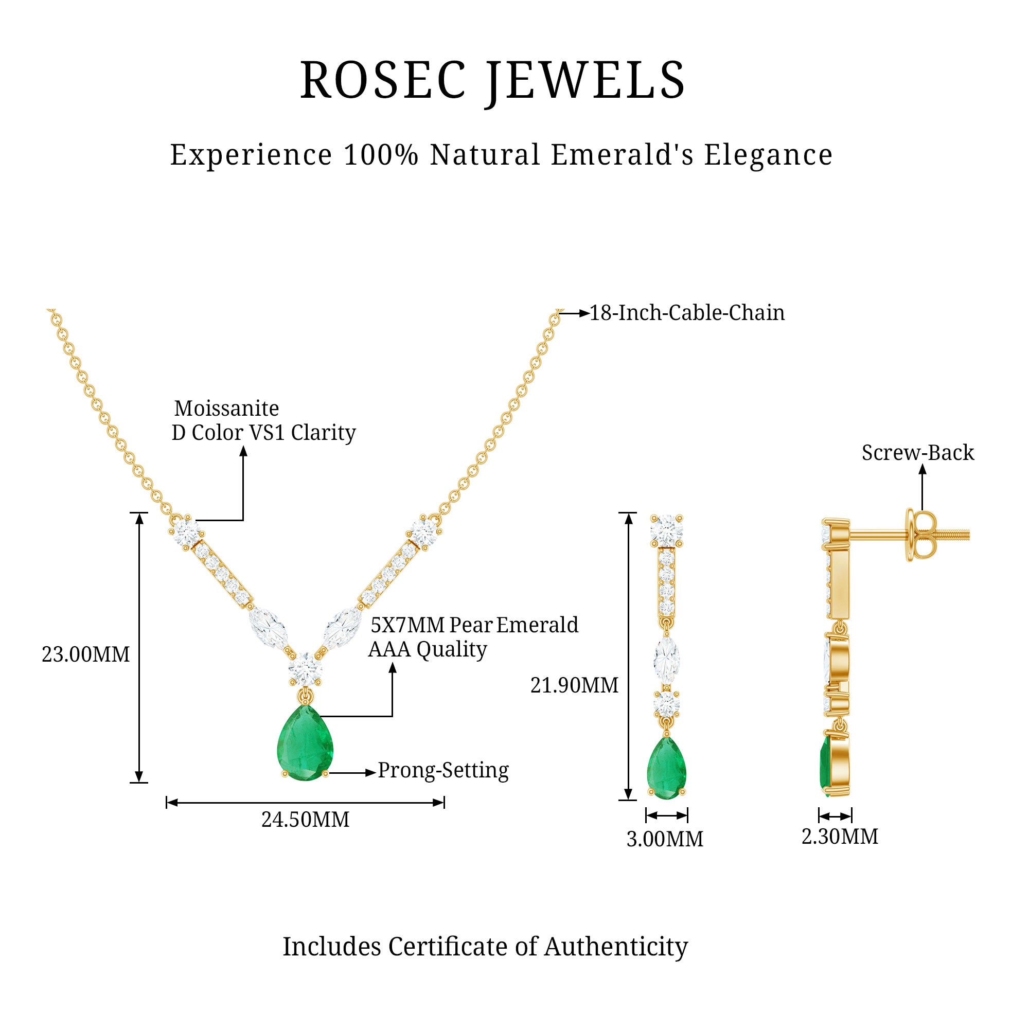 Looking for the perfect Necklace Earrings jewelry set to adorn your bride-to-be on your wedding day? Look no further than this stunning Emerald Jewelry Set. Featuring a gorgeous Pear Cut Emerald stone set in a secure Prong Setting and accented with sparkling Moissanite on both the pendant and drop earrings, this drop jewelry set is sure to make a statement. The elegant Emerald Pendant and Earrings Set is both beautiful and timeless and is sure to become a cherished piece in your loved ones jewelry collection. With a total weight of 2.25 Carat and AAA Quality certification, all of the gemstones in this set have undergone rigorous quality checks to ensure their beauty and durability. Order now to give the gift of luxury and elegance to your beloved.