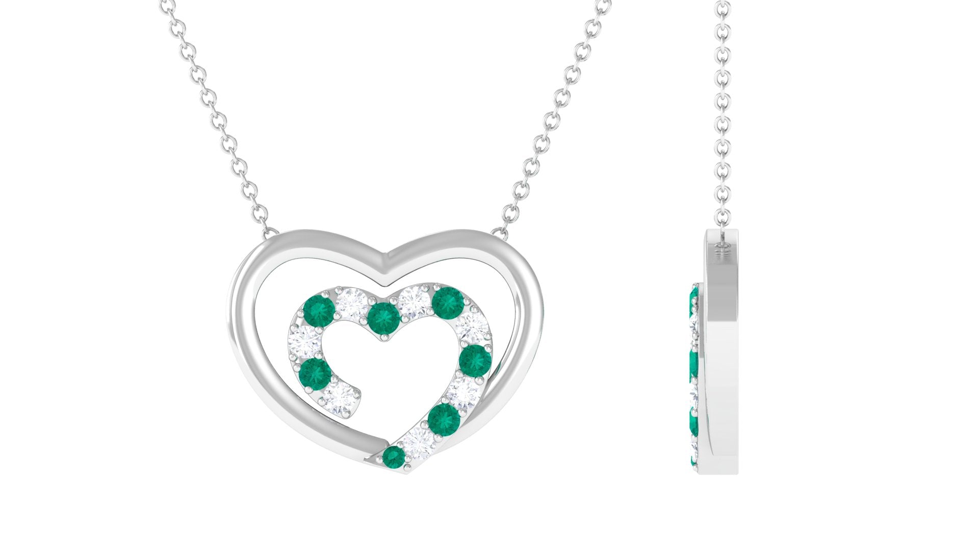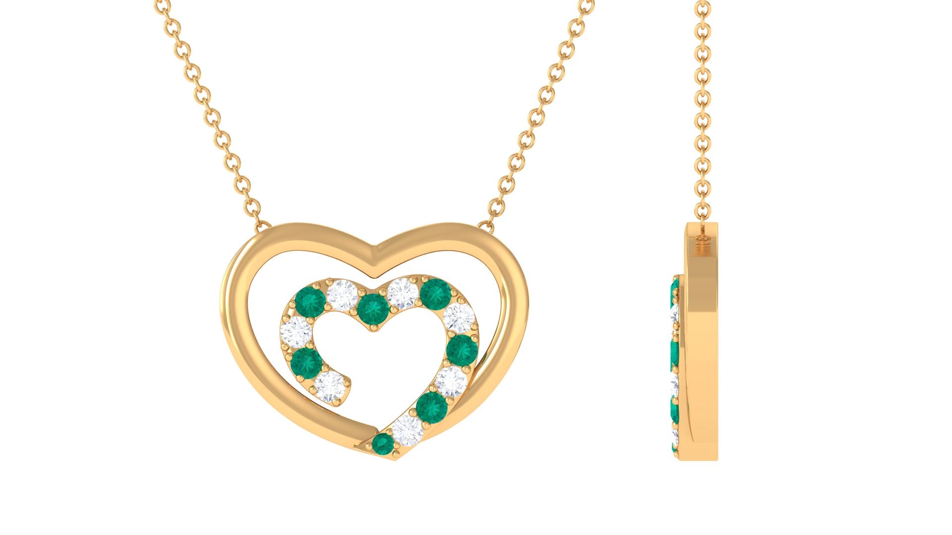 This exquisite heart necklace features twin open hearts, crafted in shimmering gold and encrusted with dazzling moissanite stones and luscious emerald gemstones. The delicate design creates a sense of elegance and romance, making this emerald necklace a perfect gift for a loved one or a cherished addition to any jewelry collection. With its exquisite craftsmanship and stunning combination of precious gems, this emerald gold necklace is sure to impress.