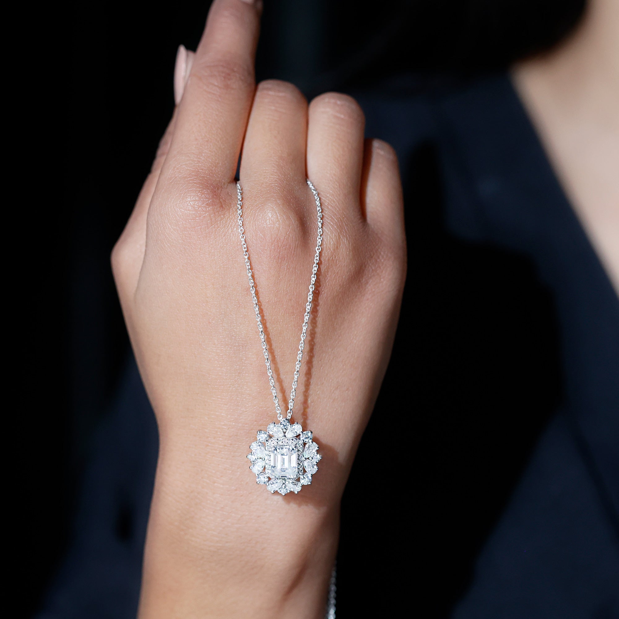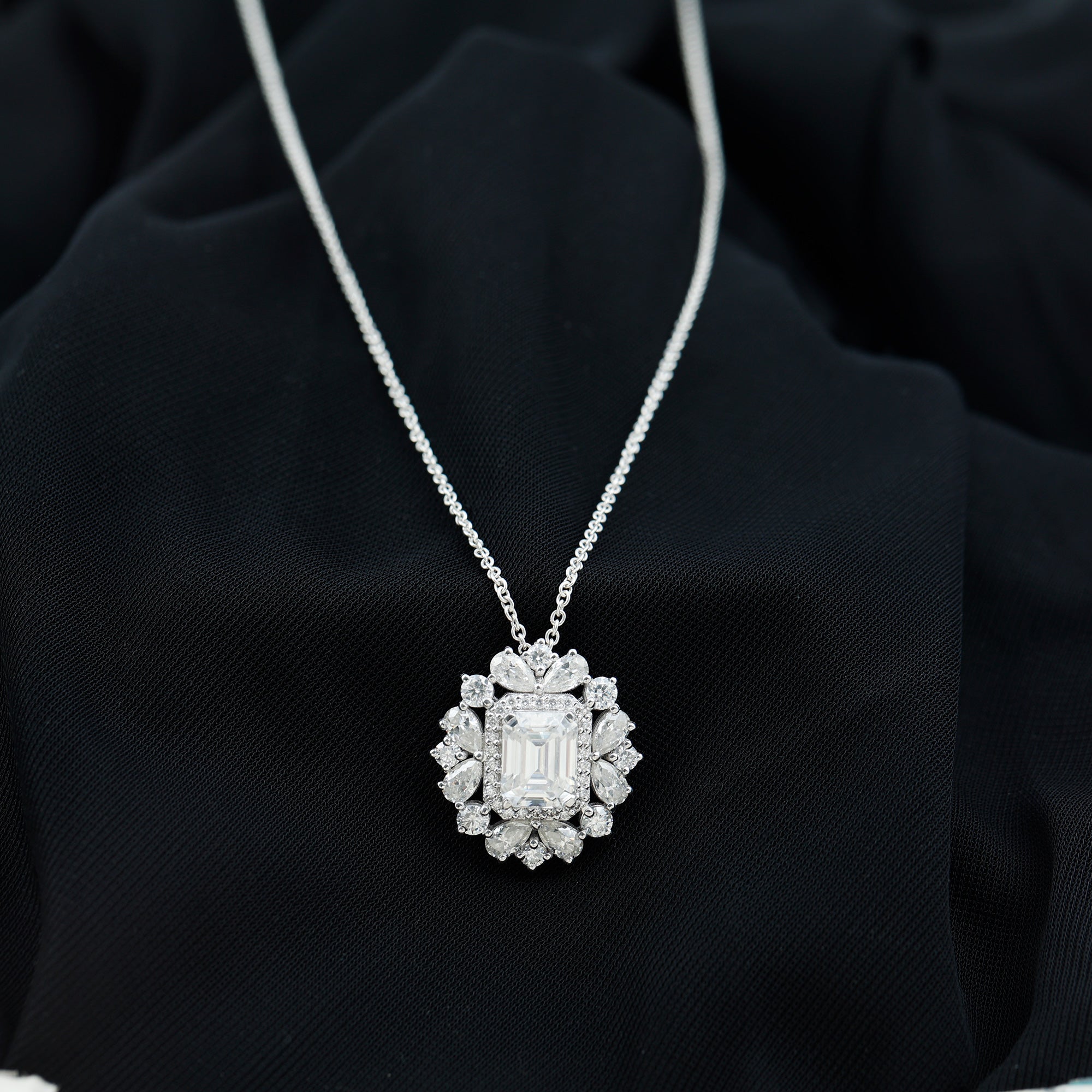 Make your D-Day look perfect with this Moissanite Pendant Necklace that is precisely crafted for your special day. This Statement Pendant features a 7X9 MM Emerald Cut Moissanite of D-VS1 as a center stone and surrounded by a double halo of Round, Pear, and Round Shape Smaller Gemstones that amplify the beauty of the pendant. This Halo Pendant Necklace can be styled as a single statement necklace or can be worn as a stack with minimal necklaces for a layered look. The unique design and breathtaking allure of this Emerald Cut Necklace make it just perfect for the bridal set. Also, you can present it to the bride-to-be to depict your affection towards her.
