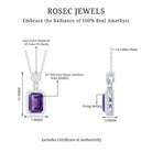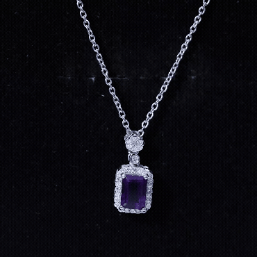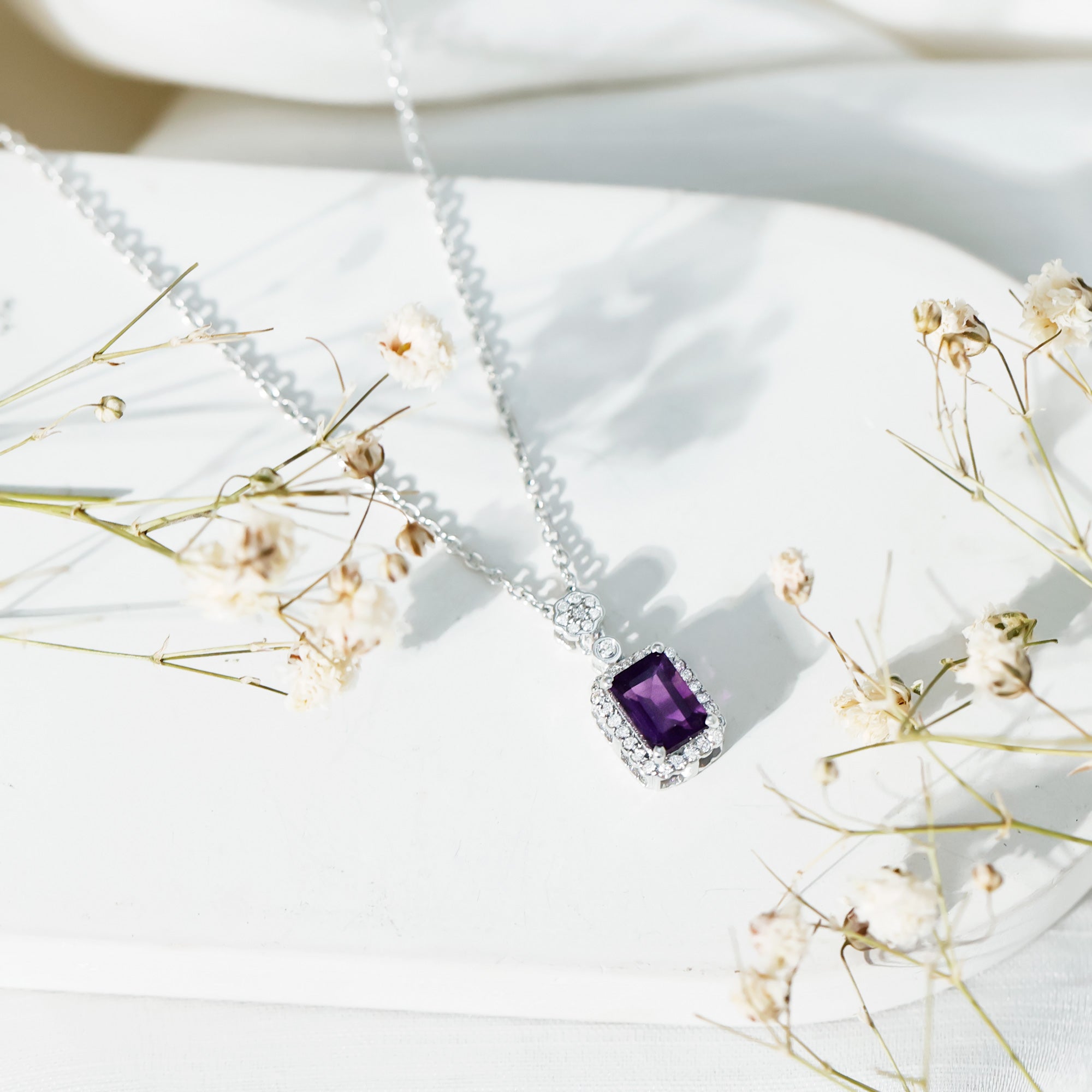 This Amethyst Pendant Necklace is all about graceful details and effortless charm. Designed with care in white gold plated silver, it features a beautiful 5X7 MM emerald cut amethyst at the center, held securely in prong setting. Surrounding the main stone is a delicate halo of sparkling round lab grown diamonds, creating a frame that adds just the right amount of brilliance. The floral inspired detail right above the main stone is adding a touch of natures beauty. Dangling from a strong and lightweight chain, this Vintage Art Deco Necklace sits comfortably and looks elegant with any outfit, whether you are dressing up for a wedding or just want to add something extra to your everyday style. The AAA quality amethyst pairs beautifully with the sparkle of the EF color VS clarity lab created diamonds. Together, the combination gives off a quiet luxury feel. This Amethyst and Diamond Necklace is a lovely choice for someone who enjoys detailed jewelry that stands out in a soft, refined way. It is perfect for special moments, thoughtful gifting, or simply treating yourself to something timeless.