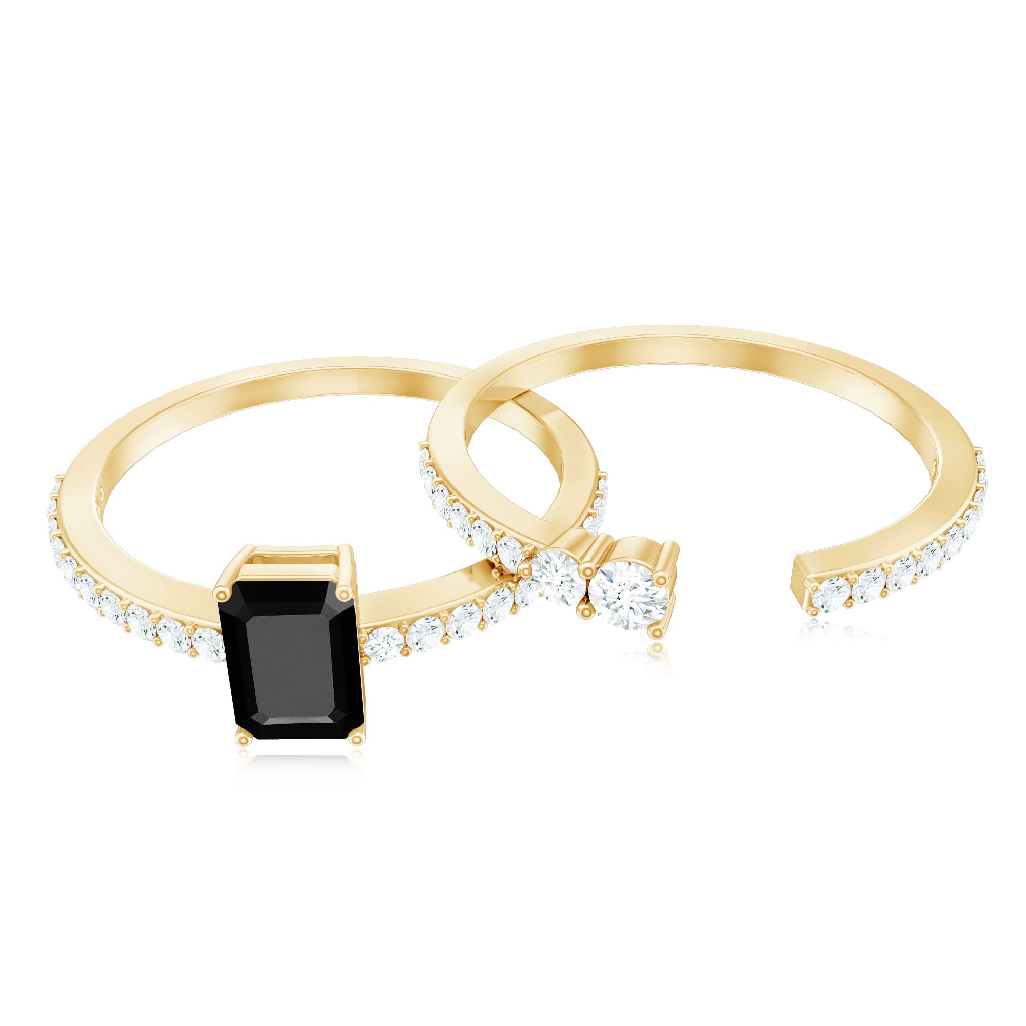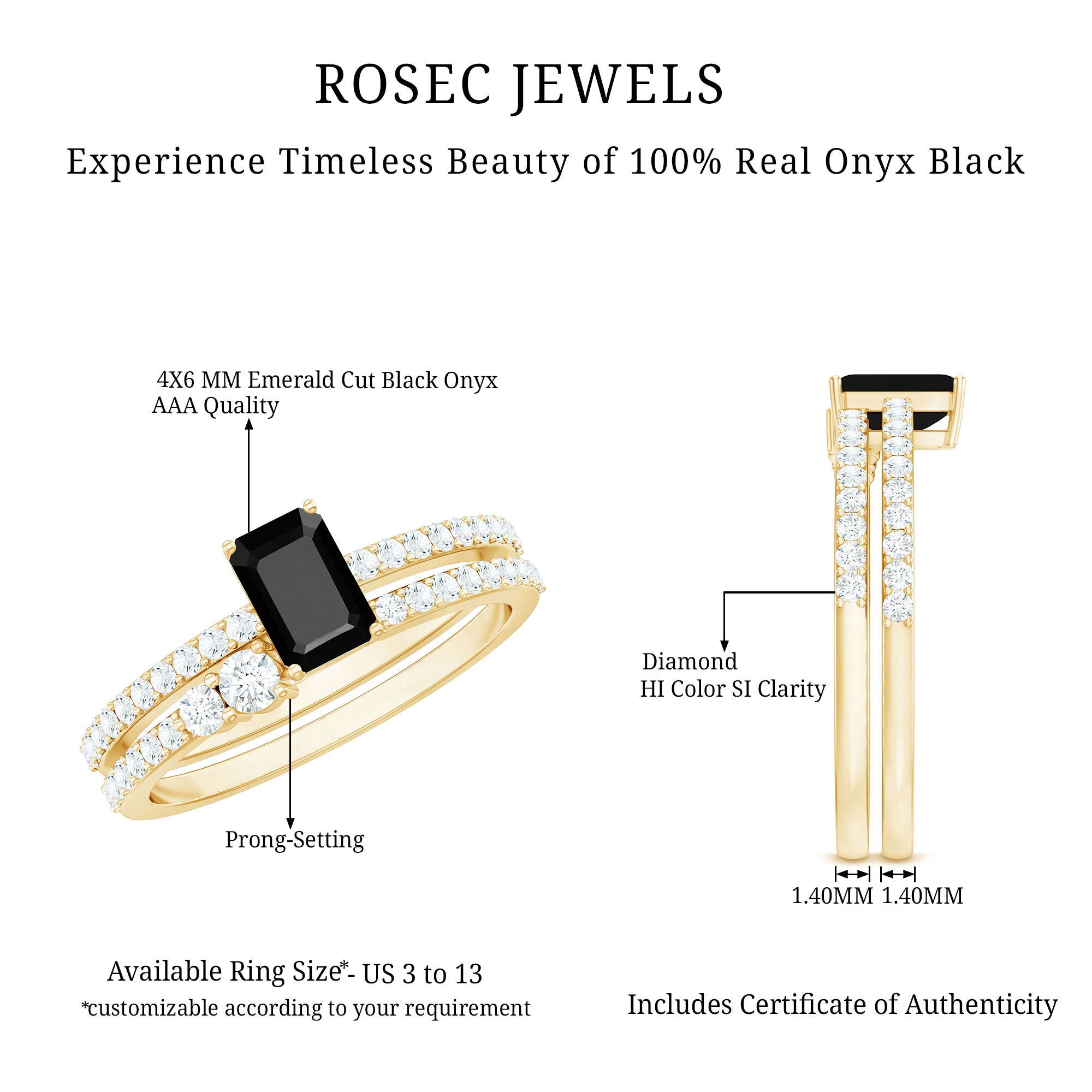 Elegant sparkle and modern style come together in this beautiful Black Onyx Wedding Ring Set. Designed for those who love simple yet meaningful jewelry. At the center of the engagement ring is a 4X6 MM emerald cut black onyx of AAA quality, securely held by prongs, while round cut sparkling diamonds decorate the band as side stones. Paired with it is an open cuff wedding band, uniquely designed to gently hug the main ring. The band is lined with round cut diamonds that sparkle brightly with every movement. Each diamond is hand picked and of HI-SI quality, adding a soft contrast to the dark onyx and bringing the perfect balance of shine and elegance. Together, this Emerald Cut Bridal Set creates a complete look that is stylish yet subtle, making it perfect for everyday wear or special moments. This Onyx and Diamond Wedding Set is a beautiful symbol of commitment. Available in various sizes and crafted for comfort, this Stackable Bridal Ring Set comes ready to gift in a lovely jewelry box. Its timeless charm and thoughtful design make it a lasting piece she will treasure forever.