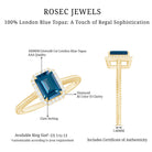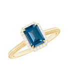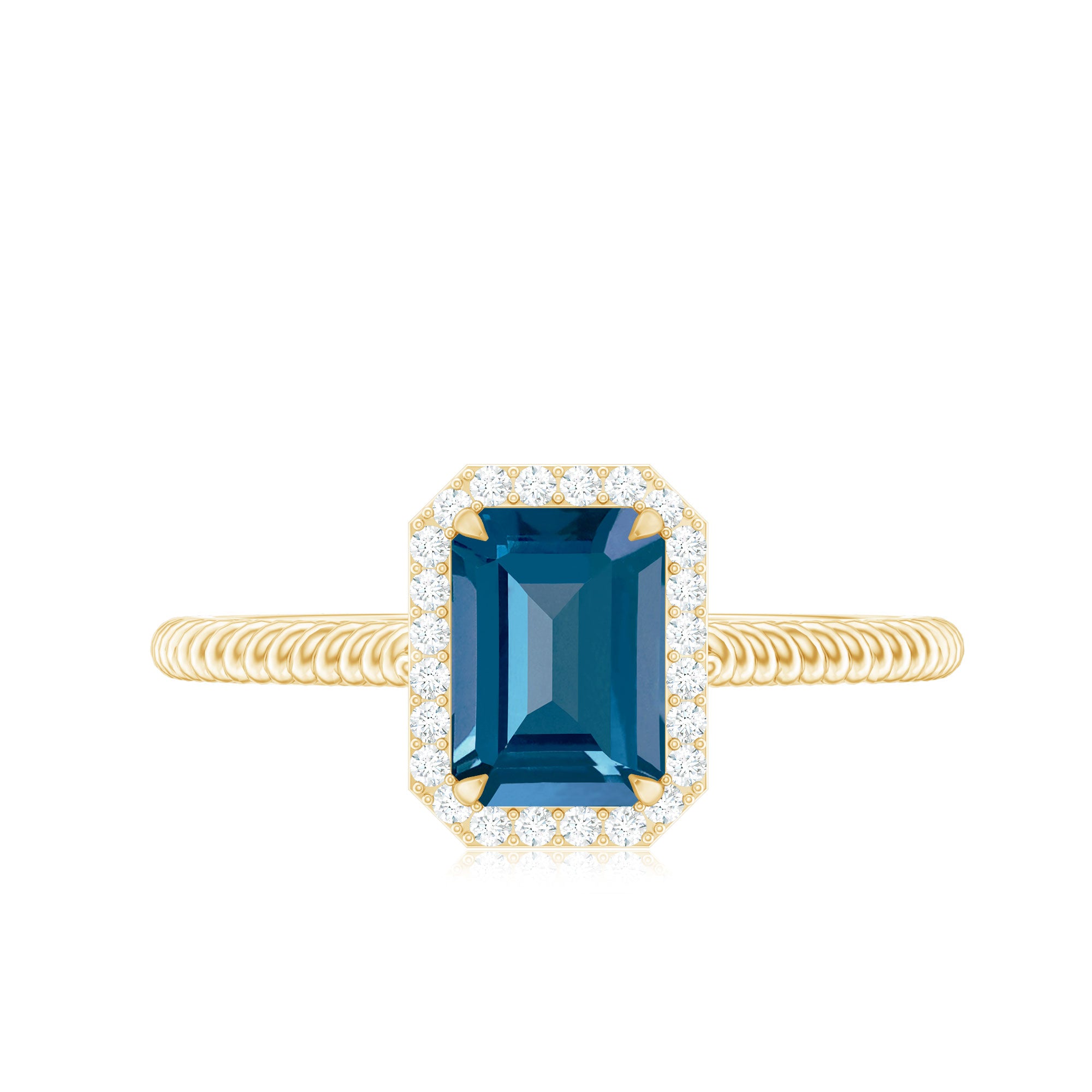 She wont be able to take her eyes off this stunning London Blue Topaz and Diamond Ring. It features a 6X8 MM emerald cut London Blue Topaz, held firmly in claw setting and surrounded by a sparkling round cut diamond halo, adding soft brilliance to the bold center stone. What makes this Emerald Cut Blue Topaz Ring stand out is the twisted rope detailing that decorates the band. This subtle twist gives the Halo Engagement Ring a vintage-inspired feel, while still keeping it modern and fresh. The soft curves in the metal bring a graceful flow to the design, adding charm. Perfect for an engagement, a promise ring, or a meaningful gift, this piece offers a timeless shape with thoughtful details that make it unique. Its elegant appearance and gentle sparkle make it a wonderful choice for someone who loves refined style with just the right amount of flair. Available in US sizes 3 to 13, it is made to fit comfortably and comes beautifully packaged in a jewelry box. Whether you are buying it for someone special or treating yourself, this London Blue Topaz Engagement Ring brings together simplicity, elegance, and a story worth telling, one that you will love to wear every day.