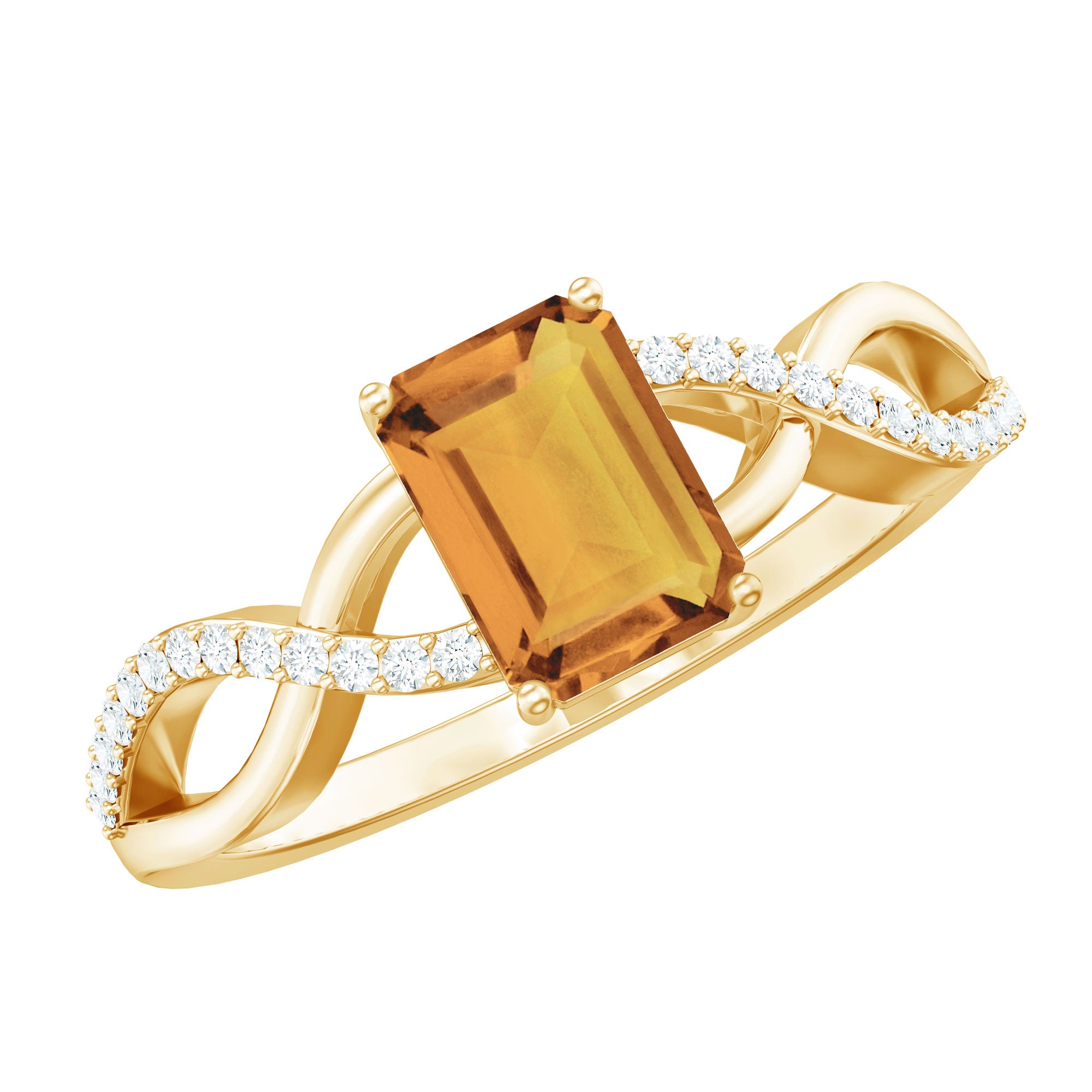 Discover your soul in the form of perfect Engagement Ring. The Citrine Engagement Ring has intricate design of crossover gold shank, embellished with Emerald Cut Citrine in the center as solitaire and Round Diamond accent, creating a romantic look that has timeless beauty. This Citrine Ring is crafted in gold for a sumptuous appeal.