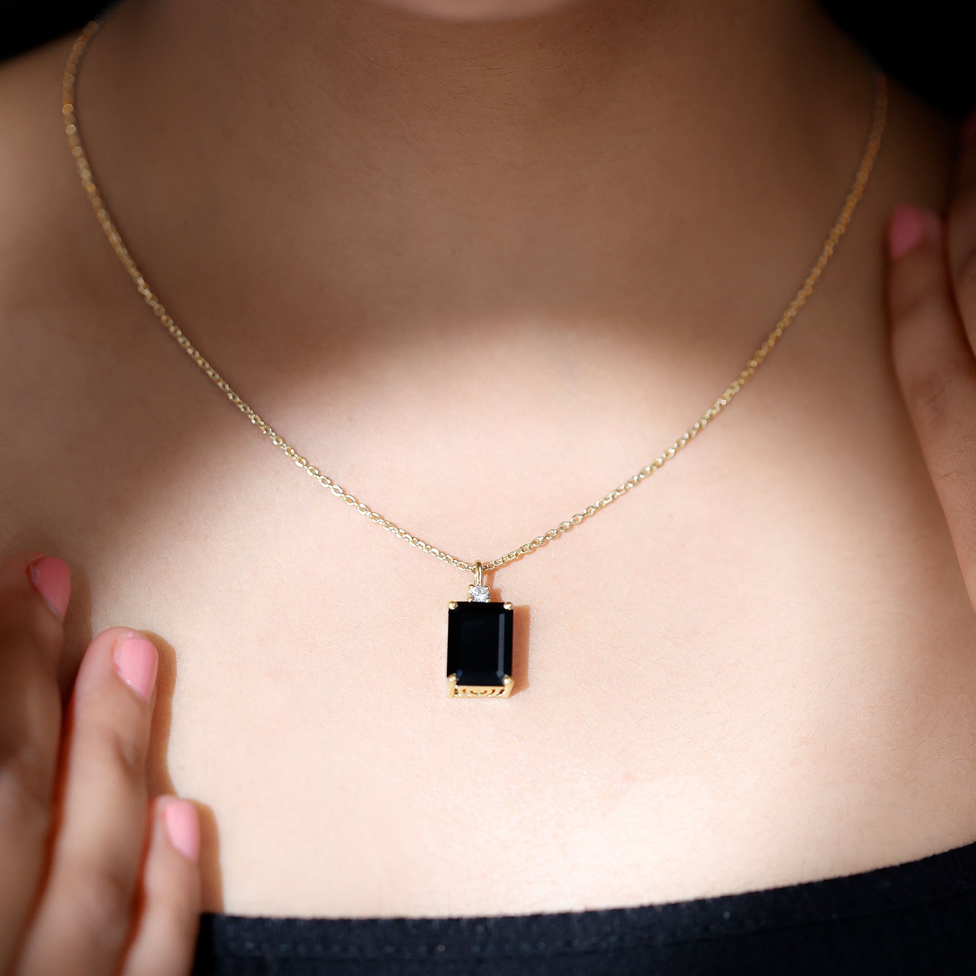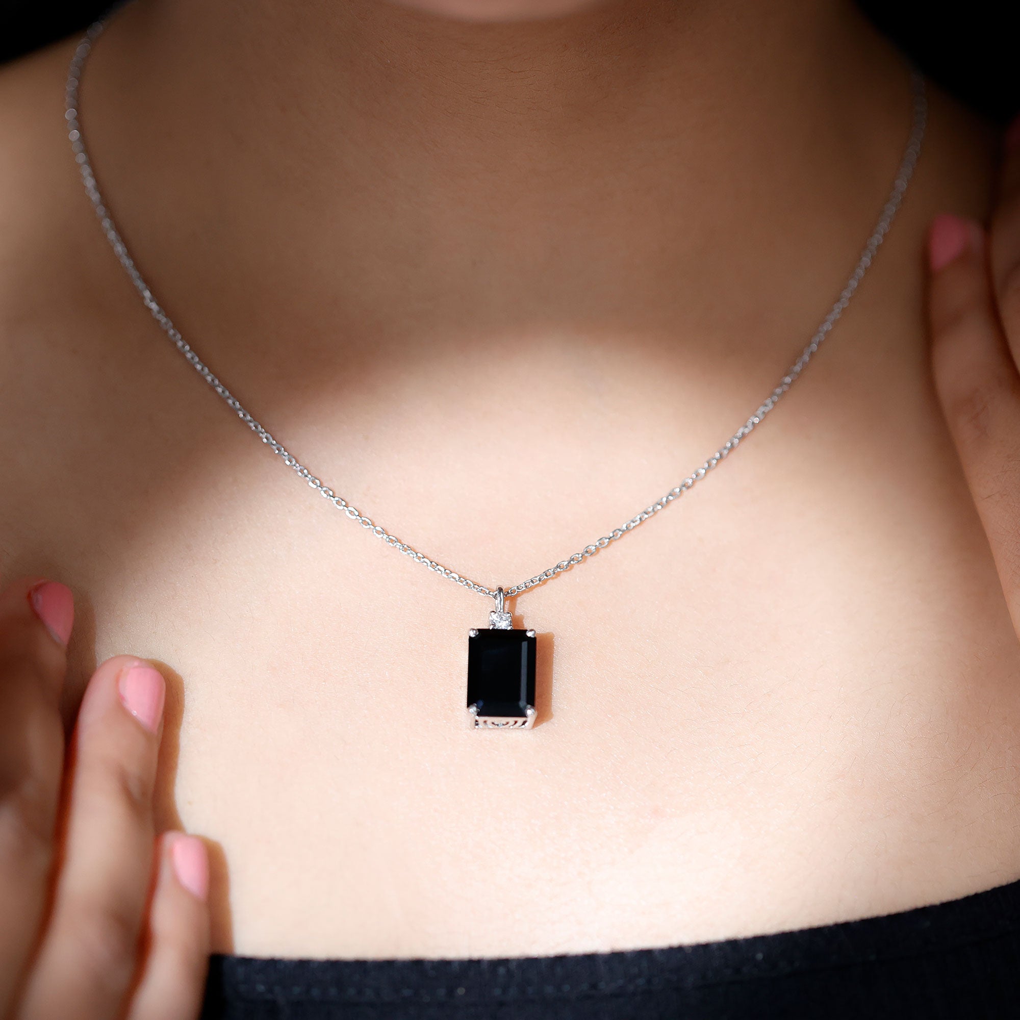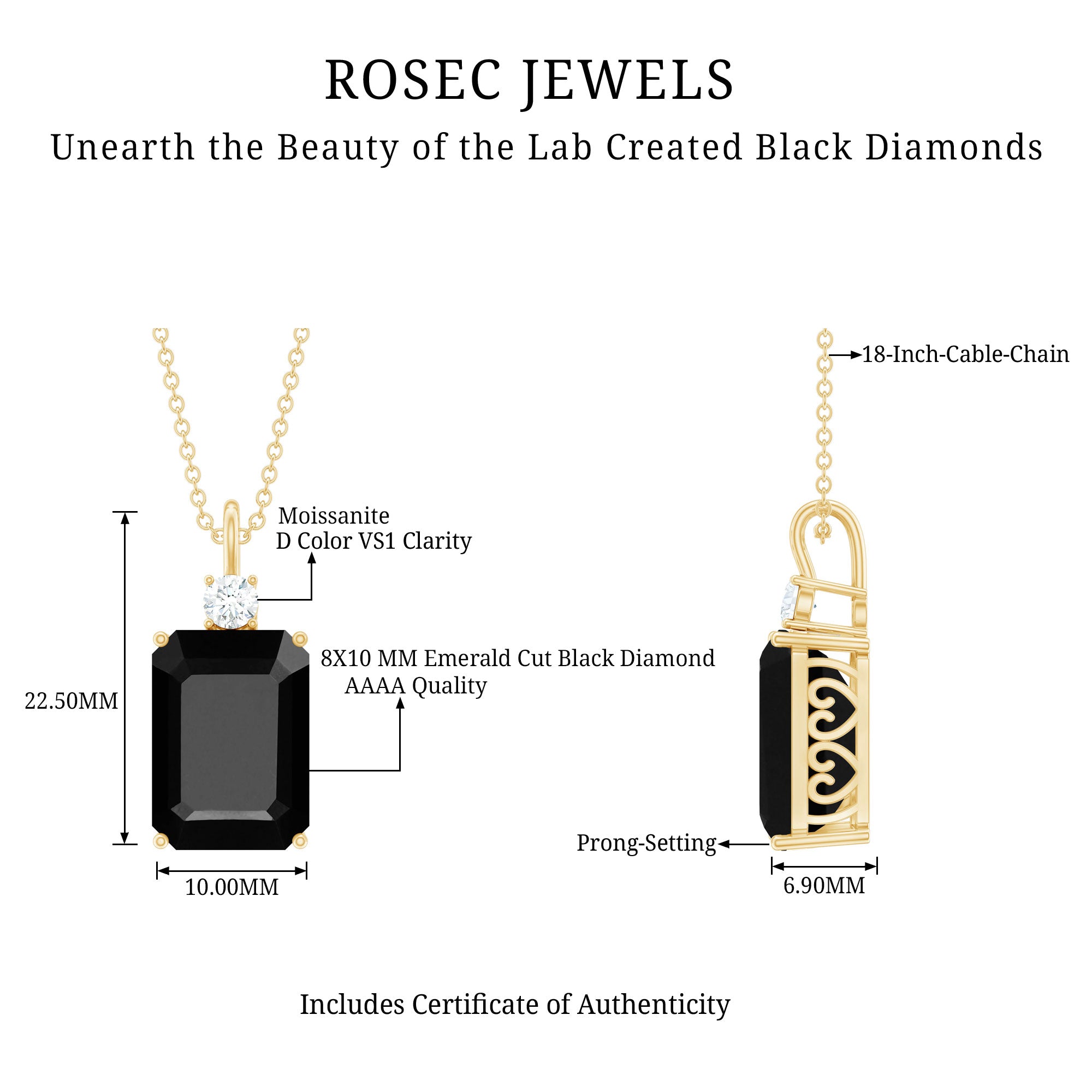 This marvelous Solitaire Pendant Necklace will amaze her with its sparkle. Featuring an Emerald Cut Lab Created Black Diamond while Round Shape Moissanite studded on its top secured in Prong Setting. As a valentine gift, give your loved one this Minimalist Necklace because it will be a wonderful addition to her jewelry collection.