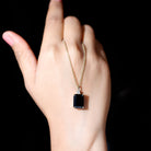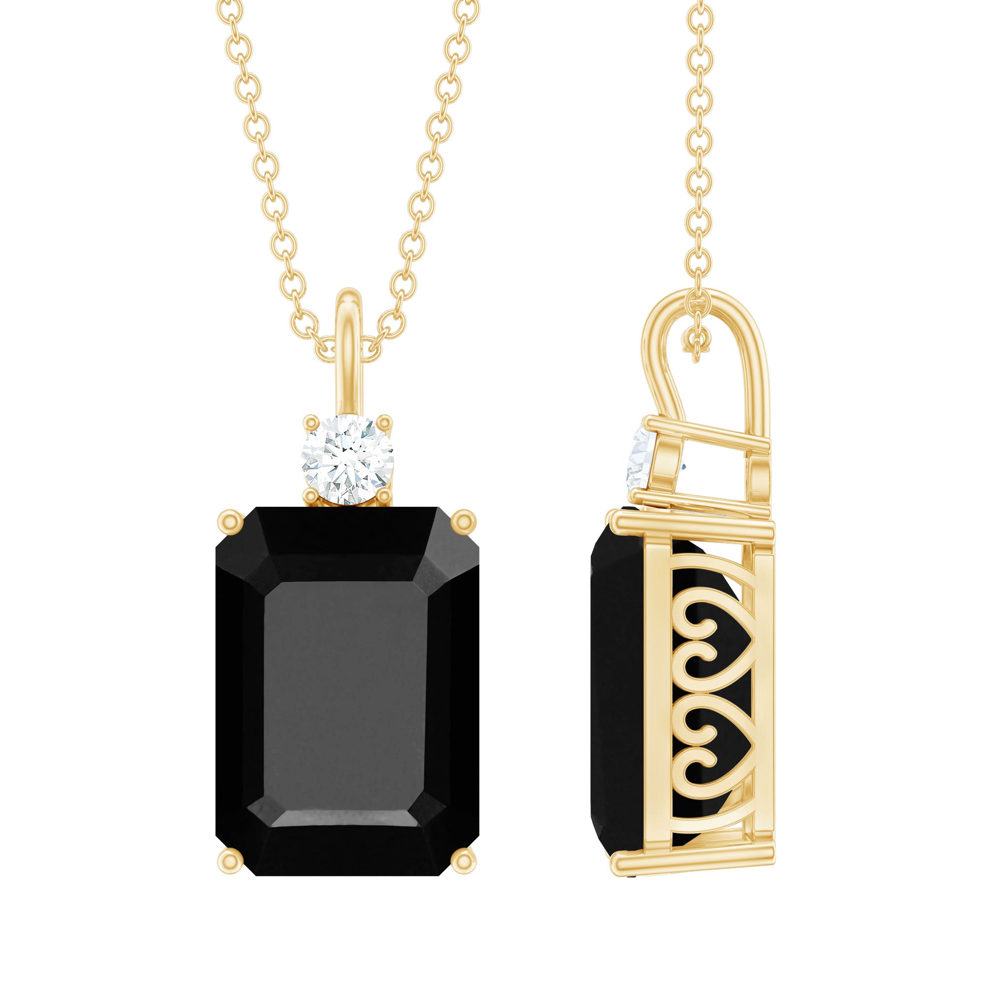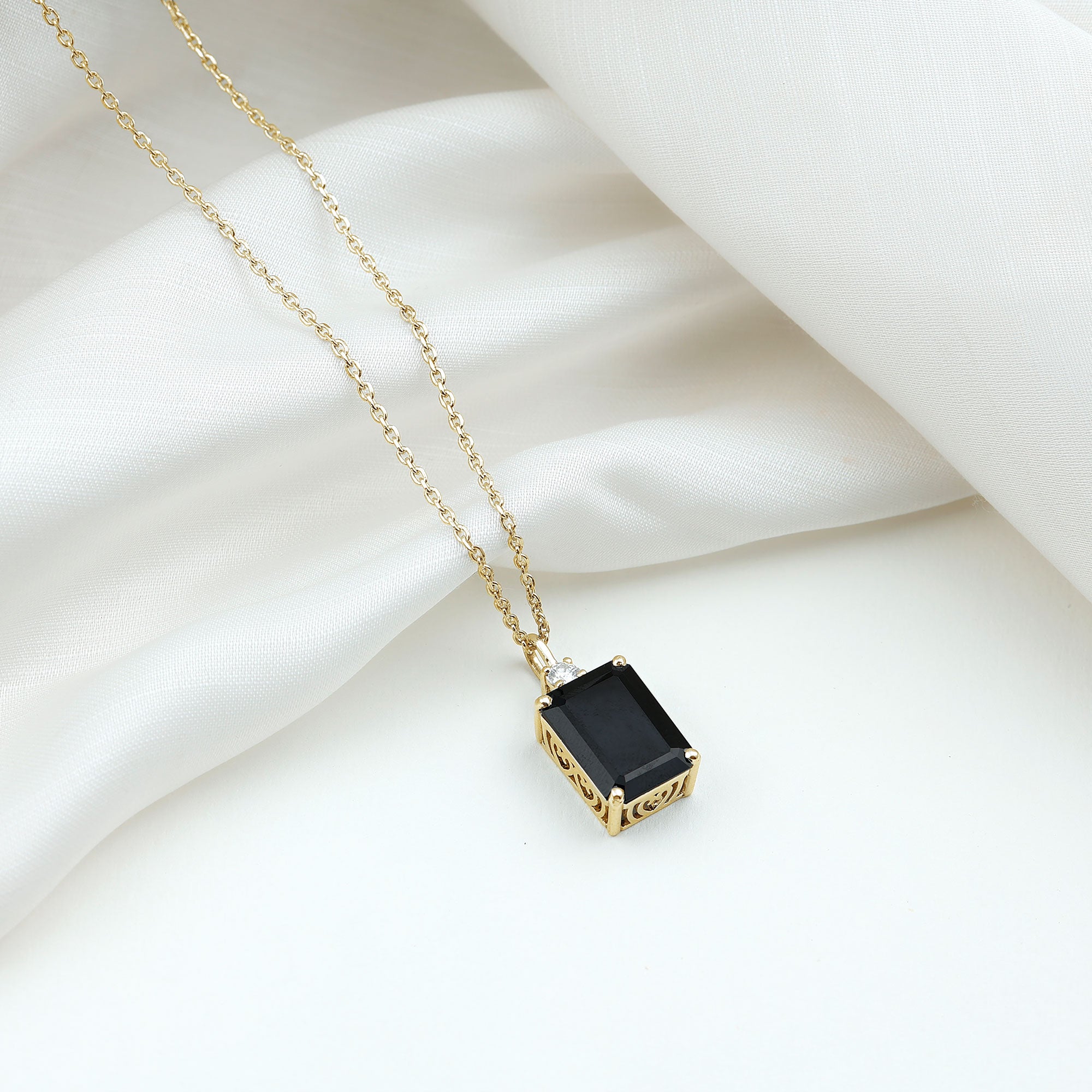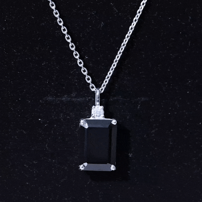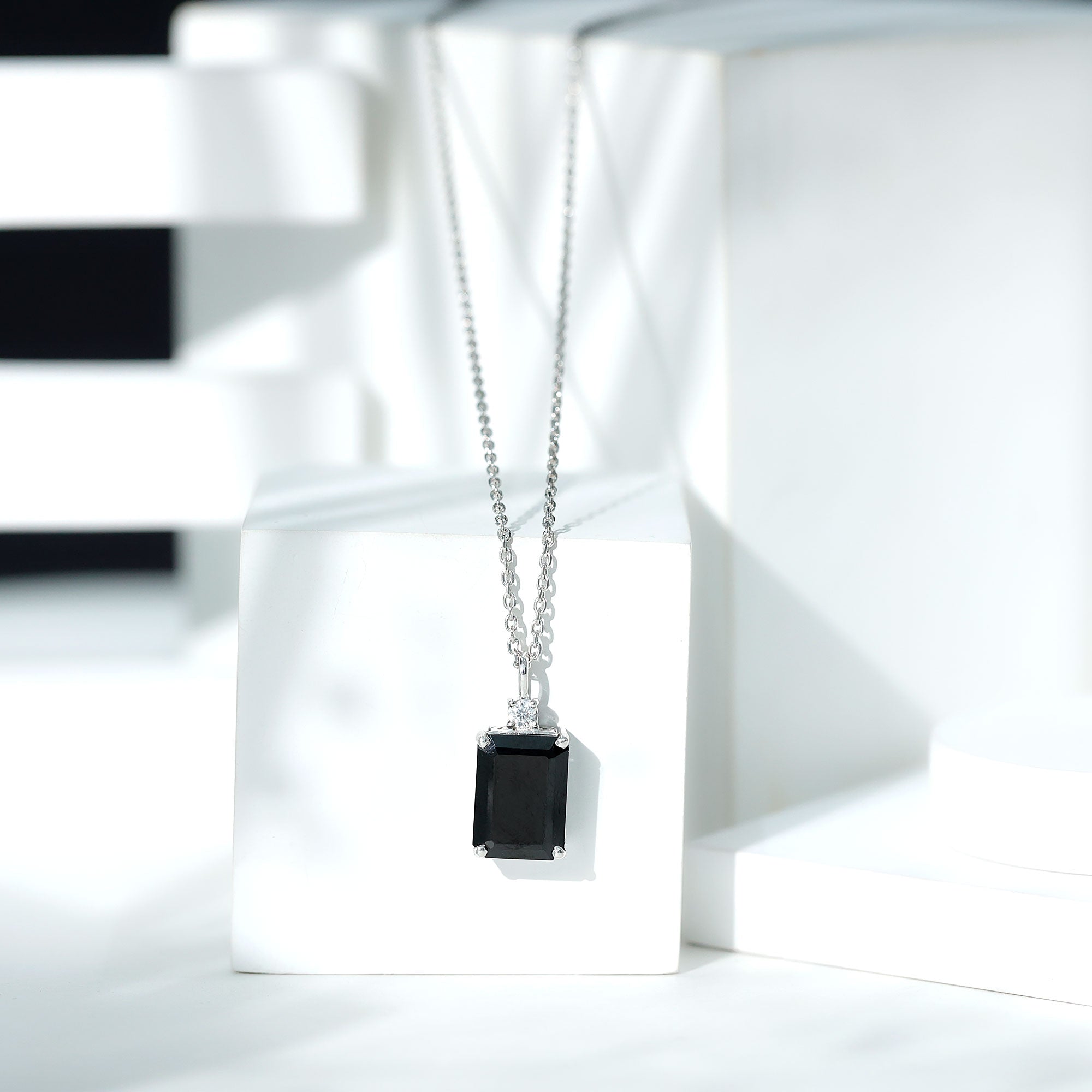 This marvelous Solitaire Pendant Necklace will amaze her with its sparkle. Featuring an Emerald Cut Lab Created Black Diamond while Round Shape Moissanite studded on its top secured in Prong Setting. As a valentine gift, give your loved one this Minimalist Necklace because it will be a wonderful addition to her jewelry collection.