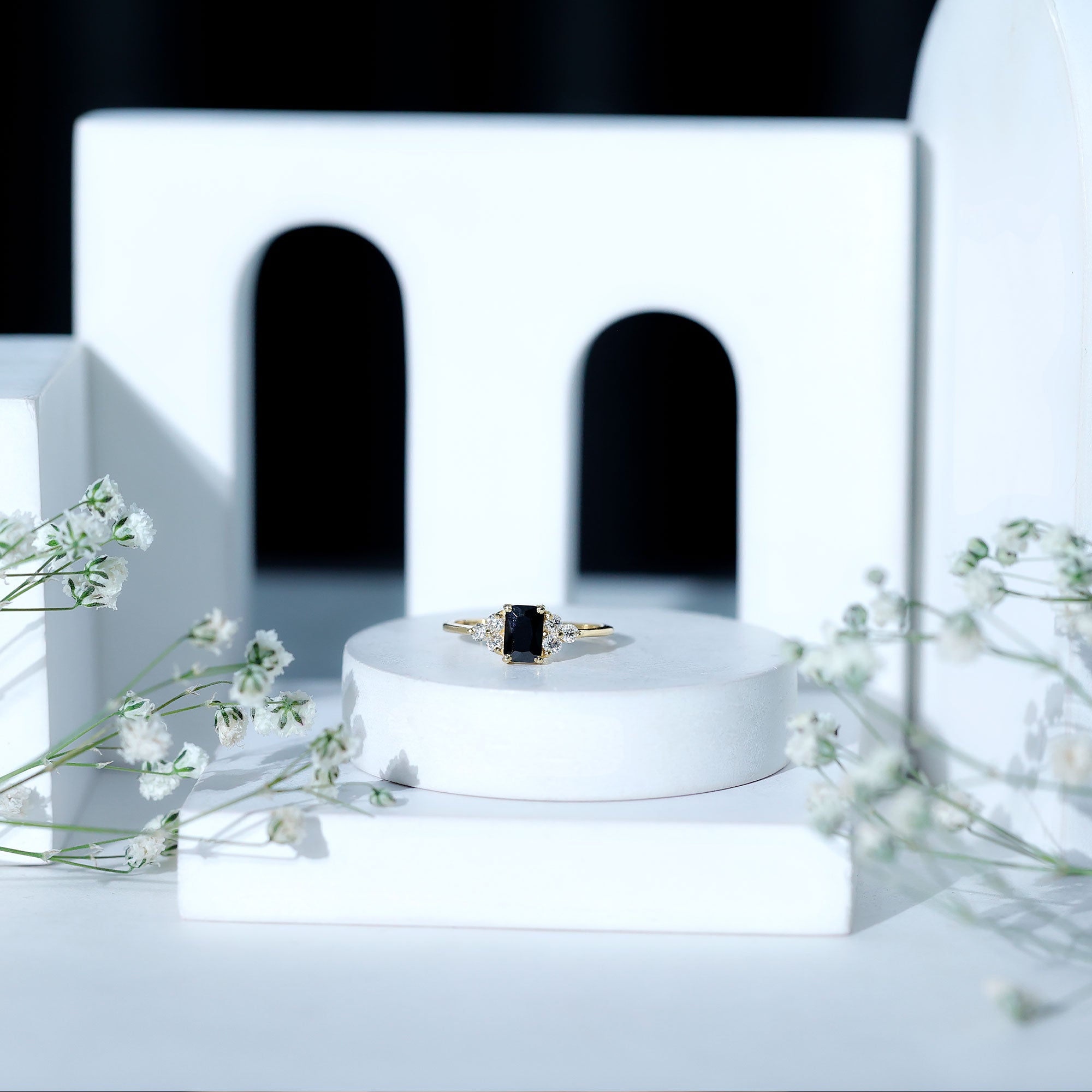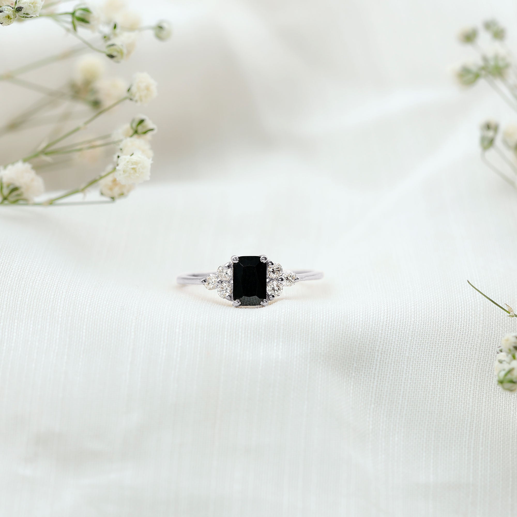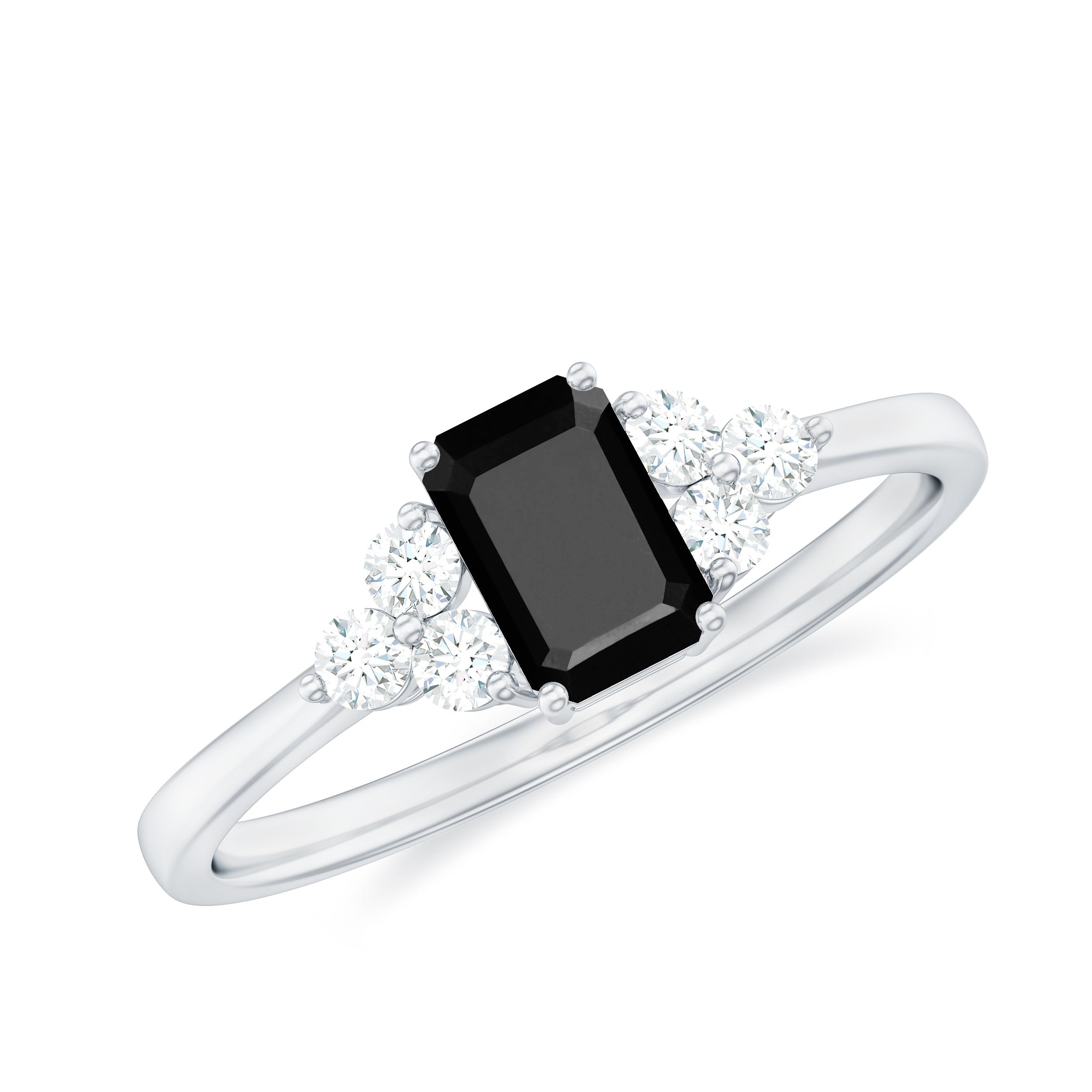 Emerald Cut Created Black Diamond Solitaire Ring with Diamond Trio