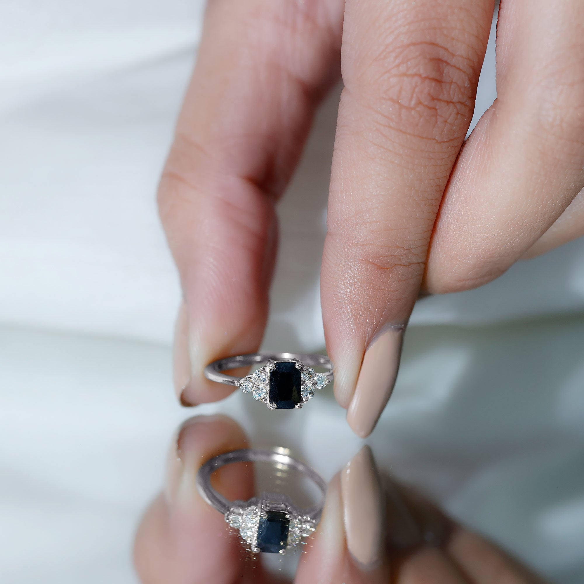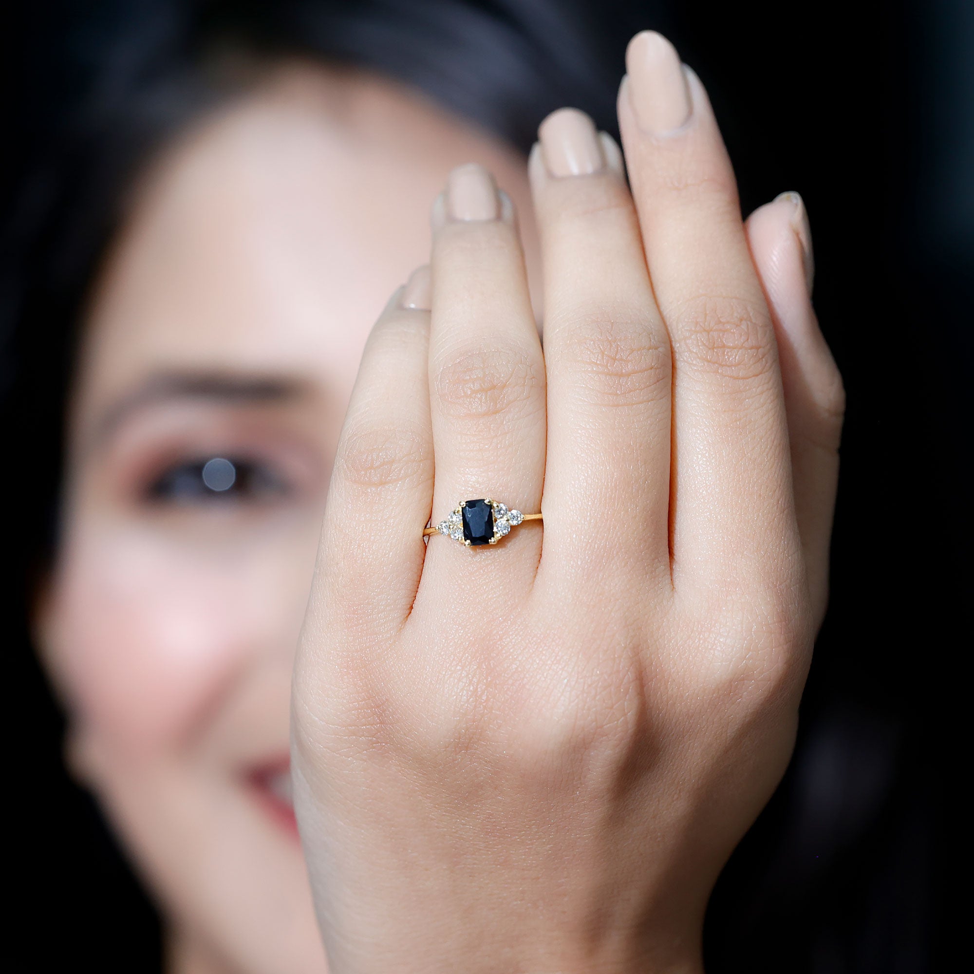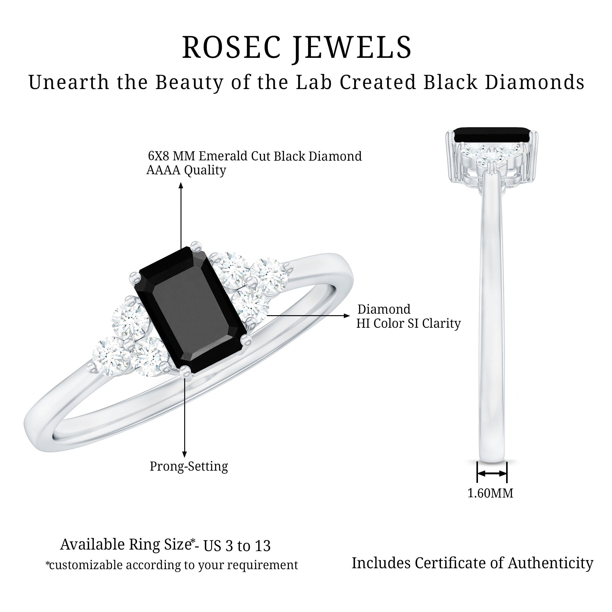 Indulge in the allure of this amazing Solitaire Ring adorned with an Emerald Cut Created Black Diamond in a Prong Setting, complemented by Round Shape Diamond. It exudes opulence and elegance. Elevate your style and adorn yourself with this stunning piece.
