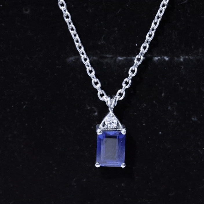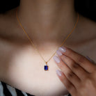 Indulge in the elegance of our solitaire pendant, showcasing a captivating emerald-cut created blue sapphire held securely in a classic prong setting. The mesmerizing created blue sapphire is beautifully complemented by a shimmering round moissanite, drawing attention to the fascinating hue of the center stone. Completing its exquisite look is a crisscross bale that adds a touch of sophistication.