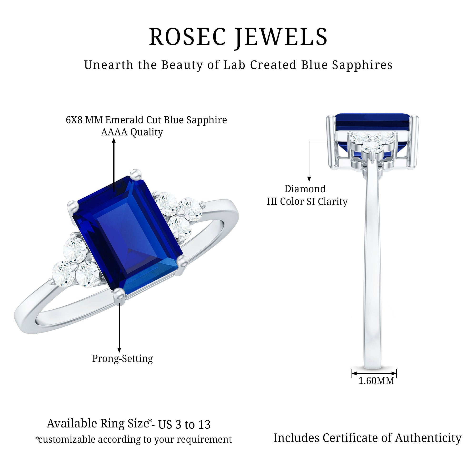 You dreamt of presenting your women something different from the traditional rings for engagement and out Lab Grown Blue Sapphire Ring, flanked by trios of sparkling round diamonds, seems ending your search. Designed to allure, this Promise Engagement Ring is featuring with 6x8mm Emerald Cut Lab Created Blue Sapphire set as center stone in a four-prong with round shape diamond trio cluster on both sides. This Lab Grown Blue Sapphire Ring has AAAA quality created sapphire with HI color SI clarity diamonds. This Emerald Cut Sapphire Ring is available in US sizes from 3 to 13 delivered in a signature jewelry box. This Blue Sapphire Engagement Ring is ideal for complementing wedding bands, or other eternity styles, providing countless opportunities to personalize your appearance. Having timeless appeal, this Created Sapphire Engagement Ring captivates admires with the mesmerizing blue hue and has a classy way to showcase your love with the trio of diamonds.