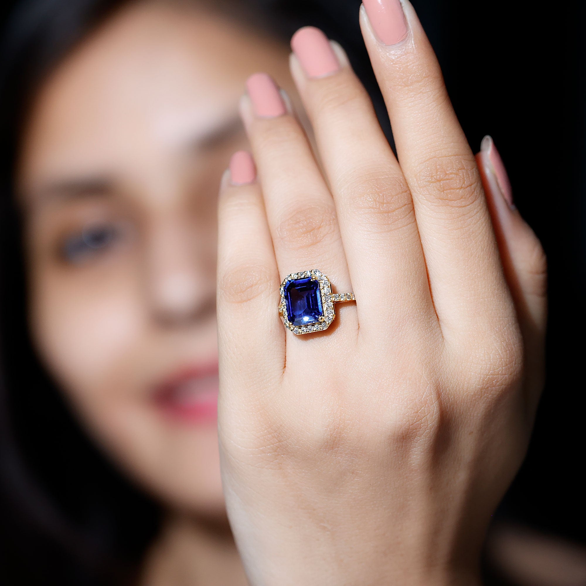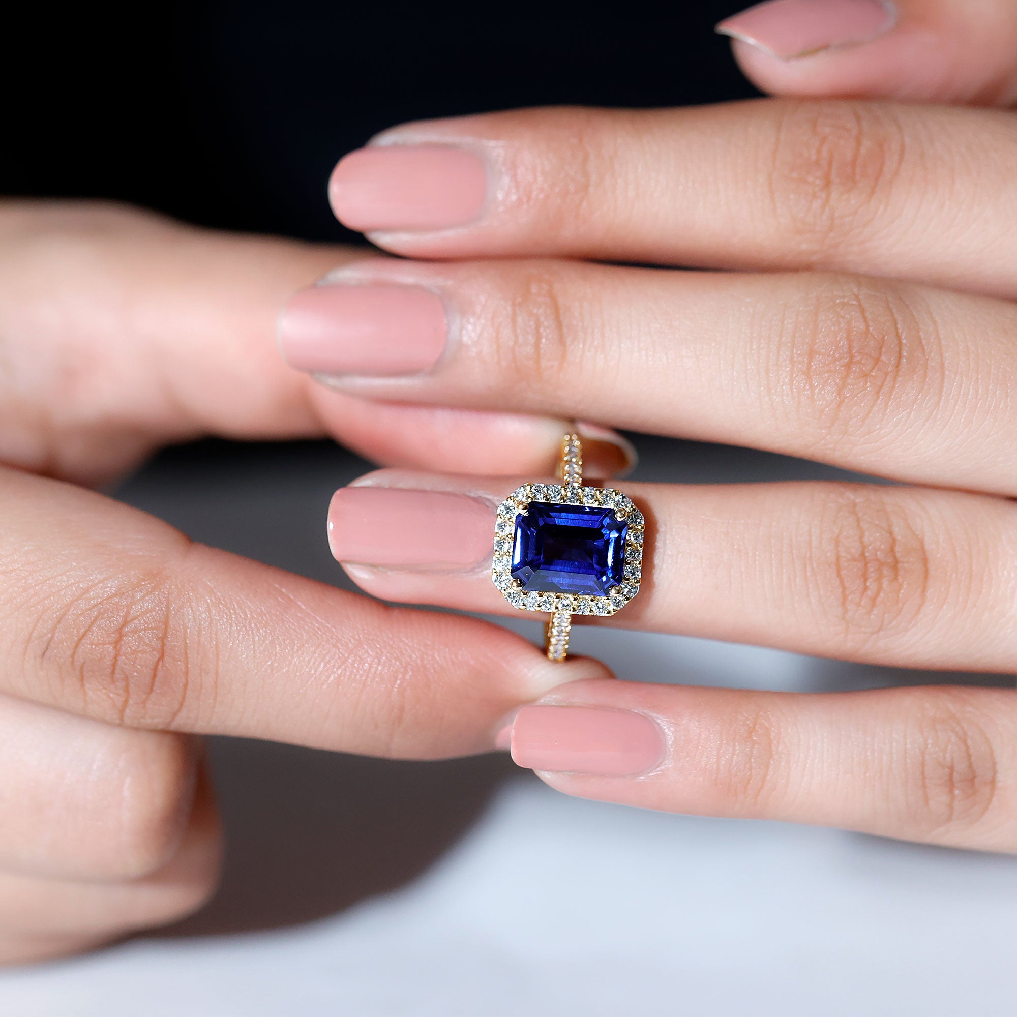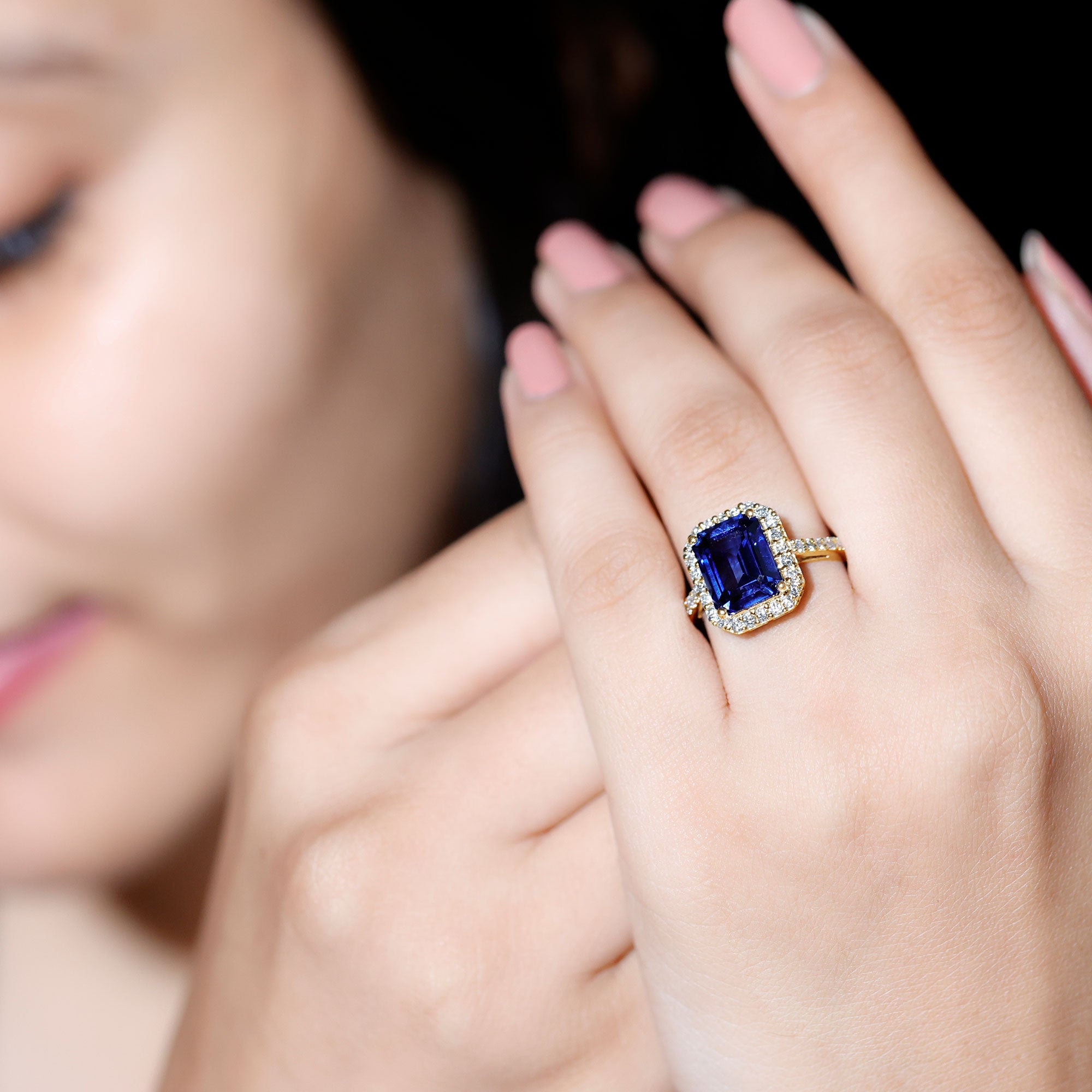 Get this gorgeous Engagement Ring decorated with Emerald Cut Lab Grown Blue Sapphire as a Solitaire in 4 Prong Setting, while dainty Round Diamond studded on the shank of the ring for extra allure. Let your partner fall in love with you a little more by gifting her this mesmerizing Lab Grown Blue Sapphire Ring as a Birthday Gift, Anniversary Gift, or Valentines Day Gift for Her.