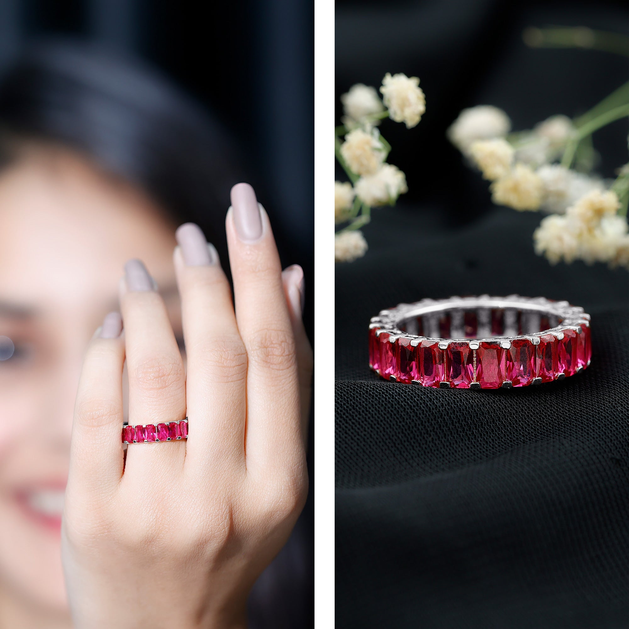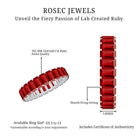 * Adorn your hand with this eye catching Red Ruby Band Ring and make a bold statement while complementing your look.* Multiple Lab Created Ruby in Emerald Cut are set closely over the unending circle in Shared Prong Setting, making a perfectly classy Full Eternity Ring.* The Elongated Emerald Cut Ruby Band is a Wide Ring which is self enough to grab all eyes, but it can also be stacked with a Sleek Stacking Ring to create more stylish look.* The striking Red Color of this Certified Ruby Eternity Ring will add compliments to your look for special dates, cocktails nights, random parties.