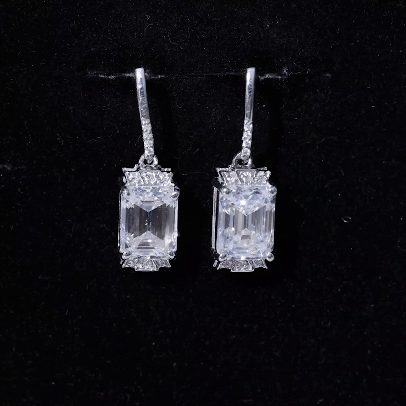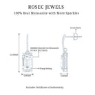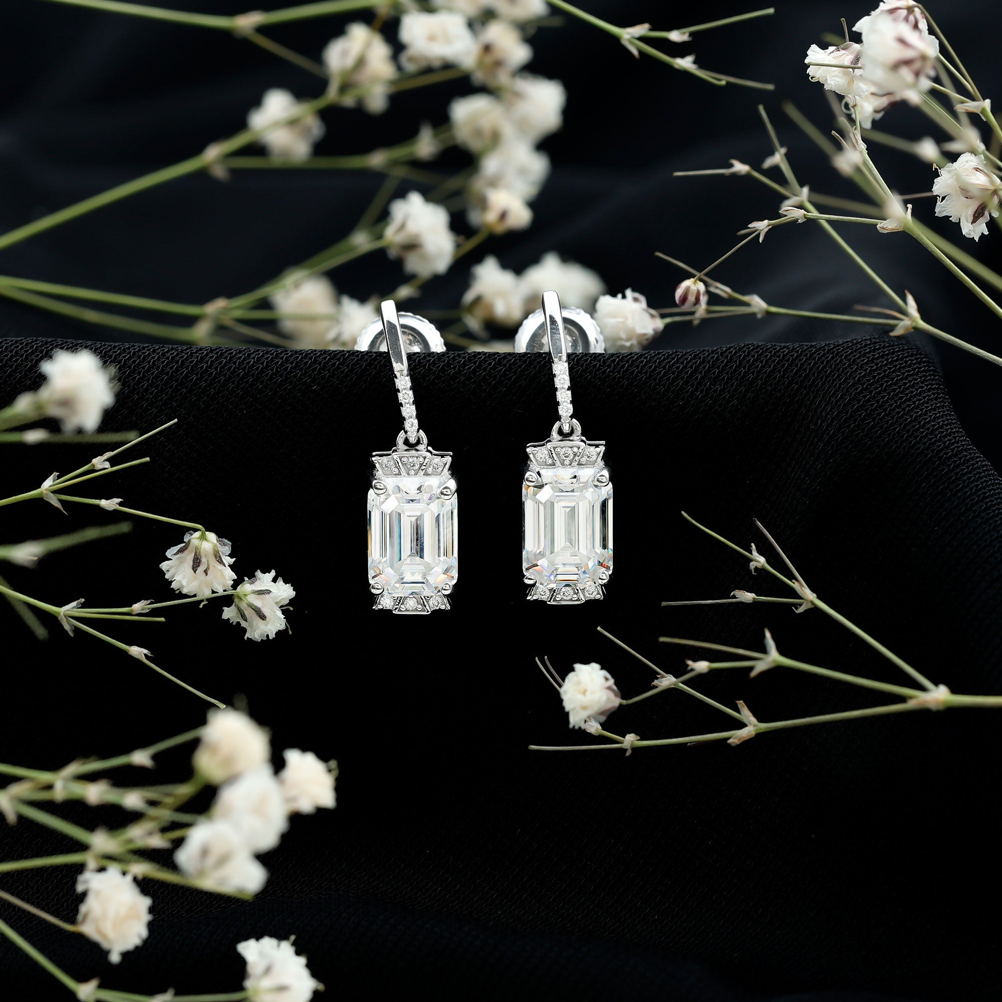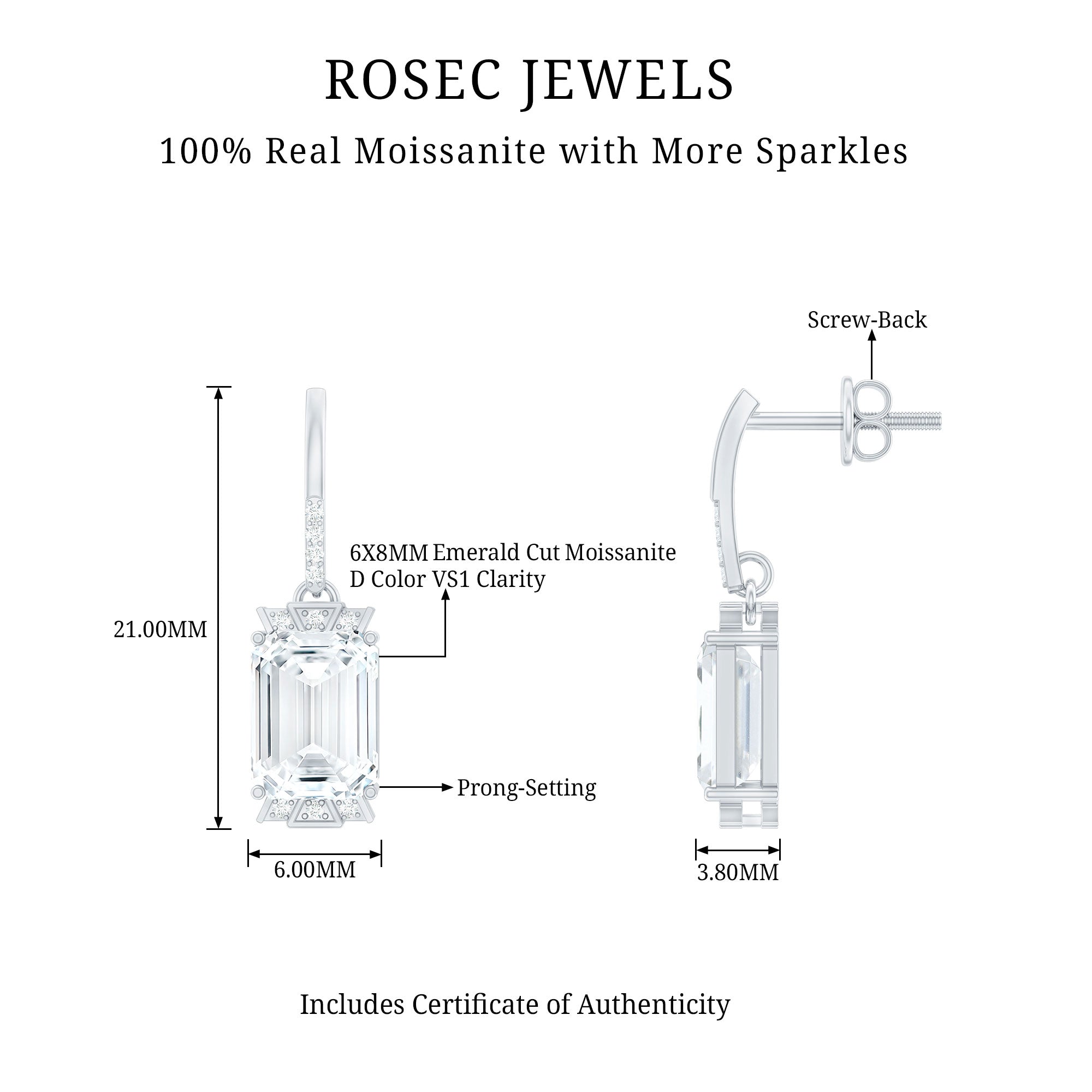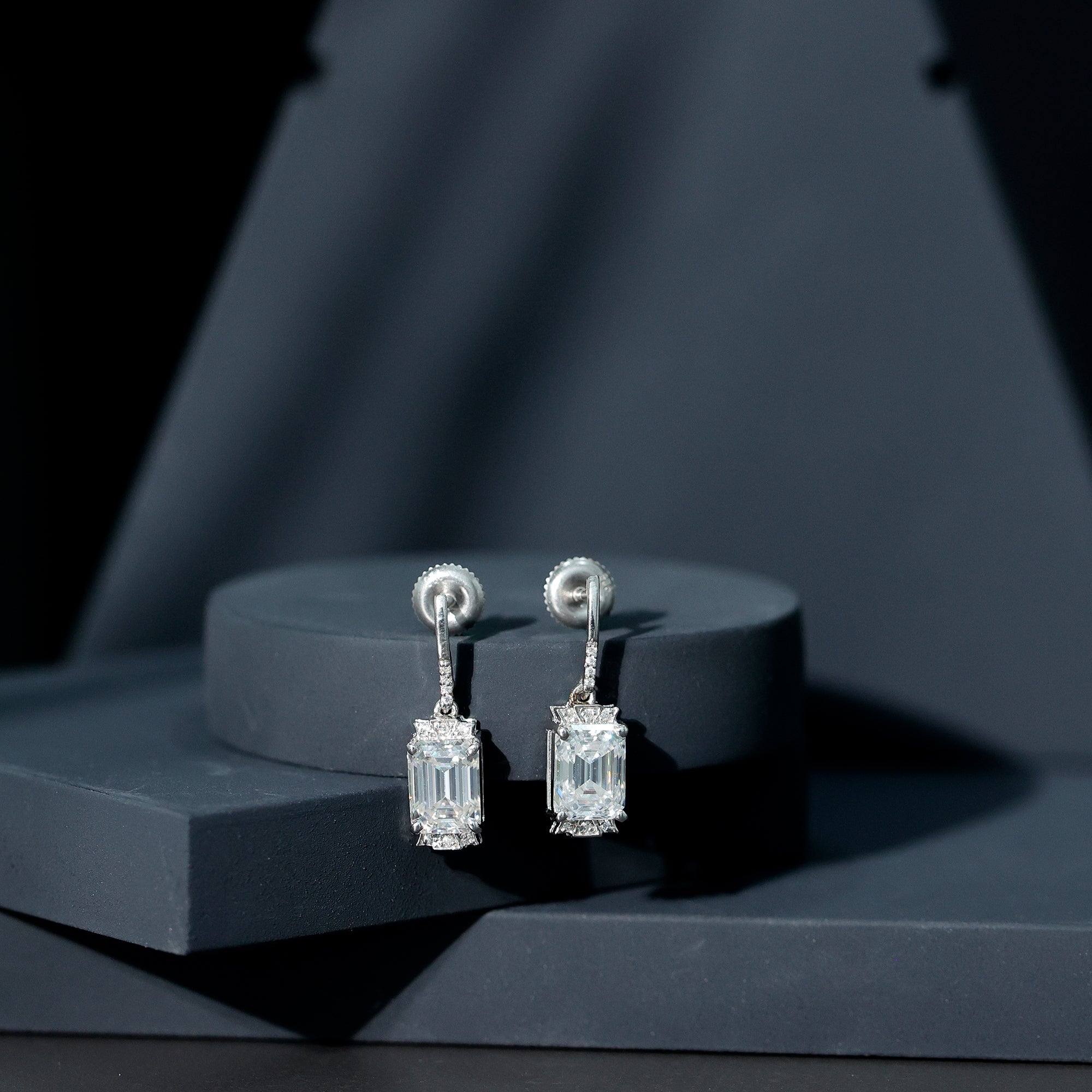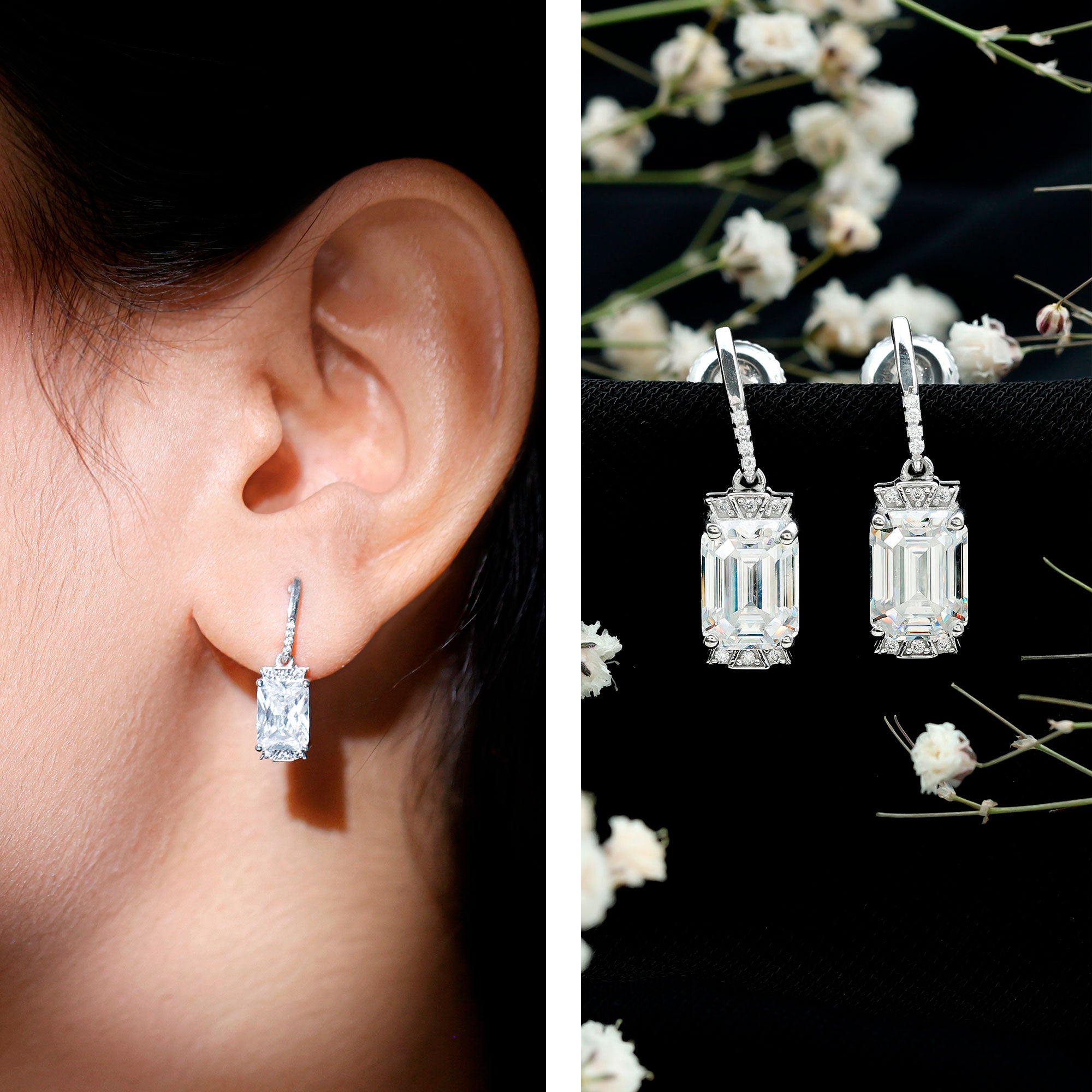 These Moissanite Dangle Earrings are a perfect piece to complete your look for special day. The earrings feature 6X8 MM Emerald Cut Moissanite securely placed in Prong Setting and embedded in 14K White Gold Plated Silver. Round Shape petite Moissanite is decorated on the top which amplifies the appealing look of these earrings making them perfect for special occasions. These 1 Carat Earrings behold the classic shine of D-VS1 Quality Moissanite that embraces your persona and grabs all attention. Get yourself these Emerald Cut Earrings that will be shipped to you in the premium quality velvet pouch.
