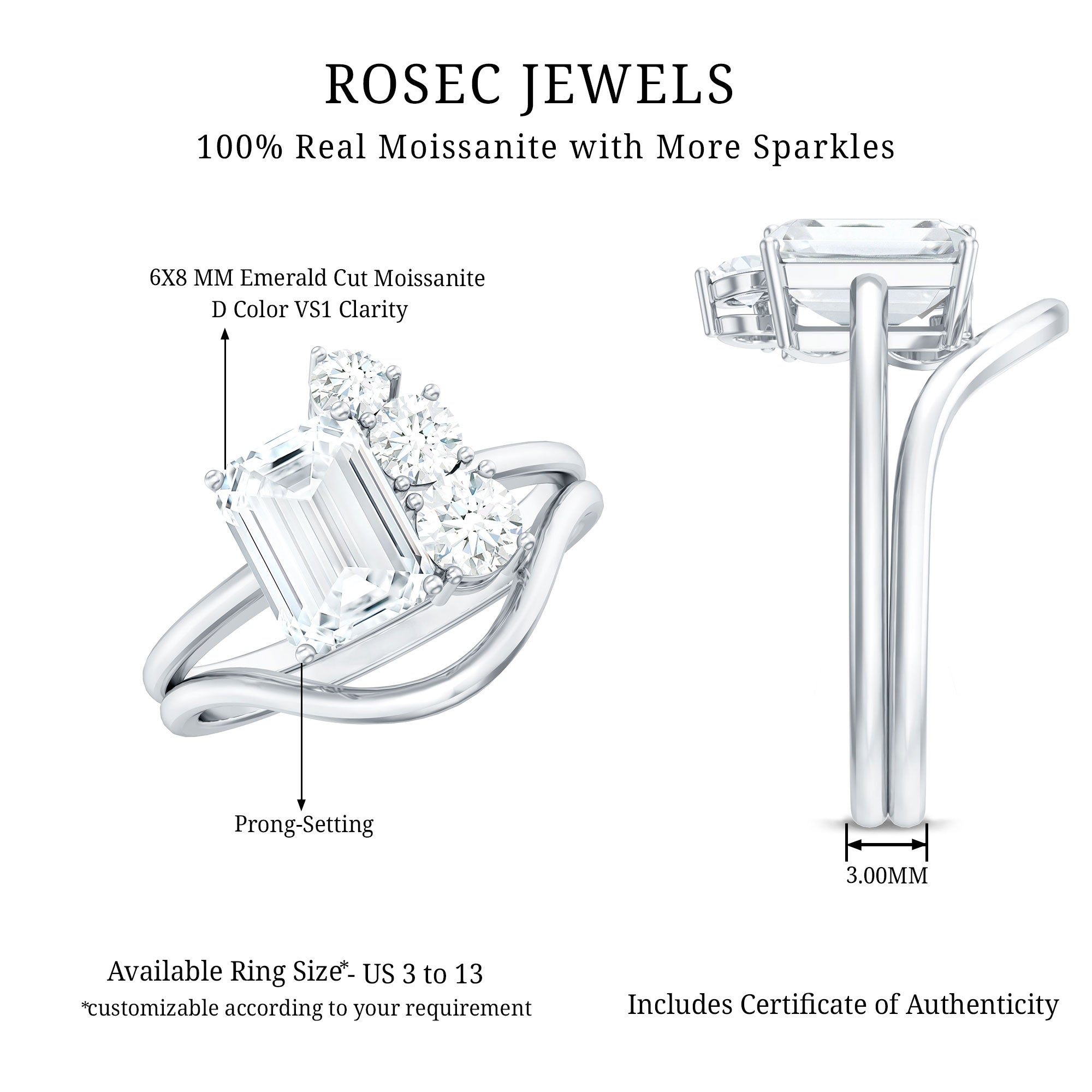 Make your special moment even more unforgettable with this stunning Moissanite Engagement Ring Set. Crafted with care and designed to shine, this two piece ring set brings elegance, sparkle, and meaning together in a simple, graceful design. The engagement ring features a 6X8 MM emerald cut moissanite at the center, flanked by three round cut moissanites on one side. The stones are set in secure prong setting that lifts them beautifully, allowing light to pass through and enhance their natural shine. All moissanites used are of D-VS1 quality, meaning they are bright, clear, and full of sparkle. Paired with a sleek, curved wedding band, the Bridal Ring Set creates a soft, flowing design that fits comfortably on the finger. This Emerald Cut Wedding Ring Set is perfect for those who love a mix of classic elegance and modern simplicity. Whether you are proposing or exchanging vows, this Engagement Ring with Wedding Band Set is a beautiful way to mark the beginning of your journey together. Available in your choice of metal finishes and ring sizes, it comes ready in a signature box, ideal for gifting or treasuring for yourself.