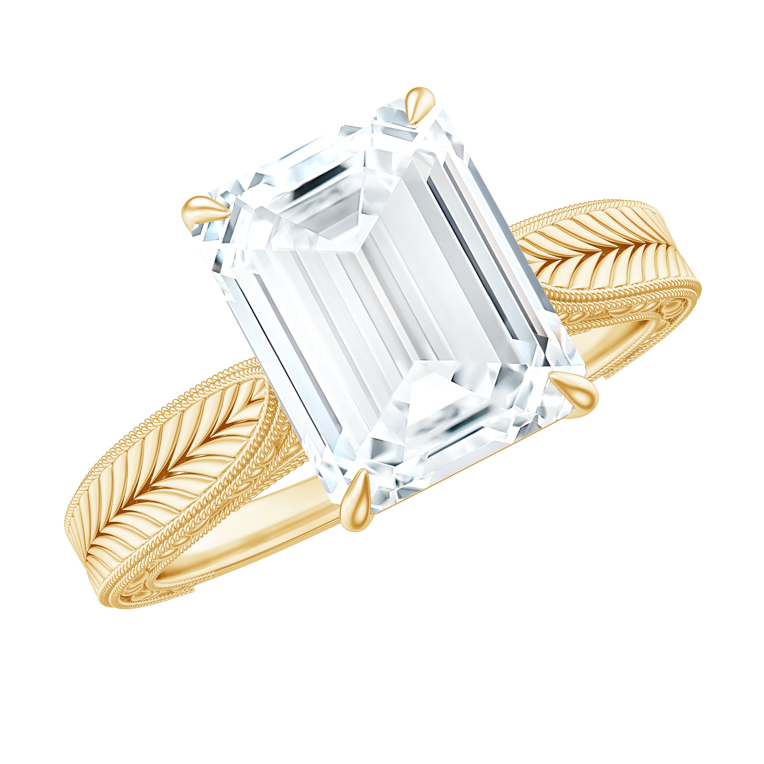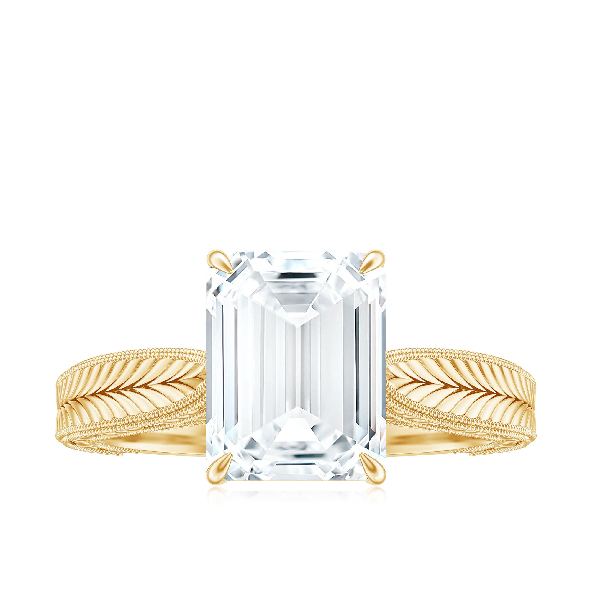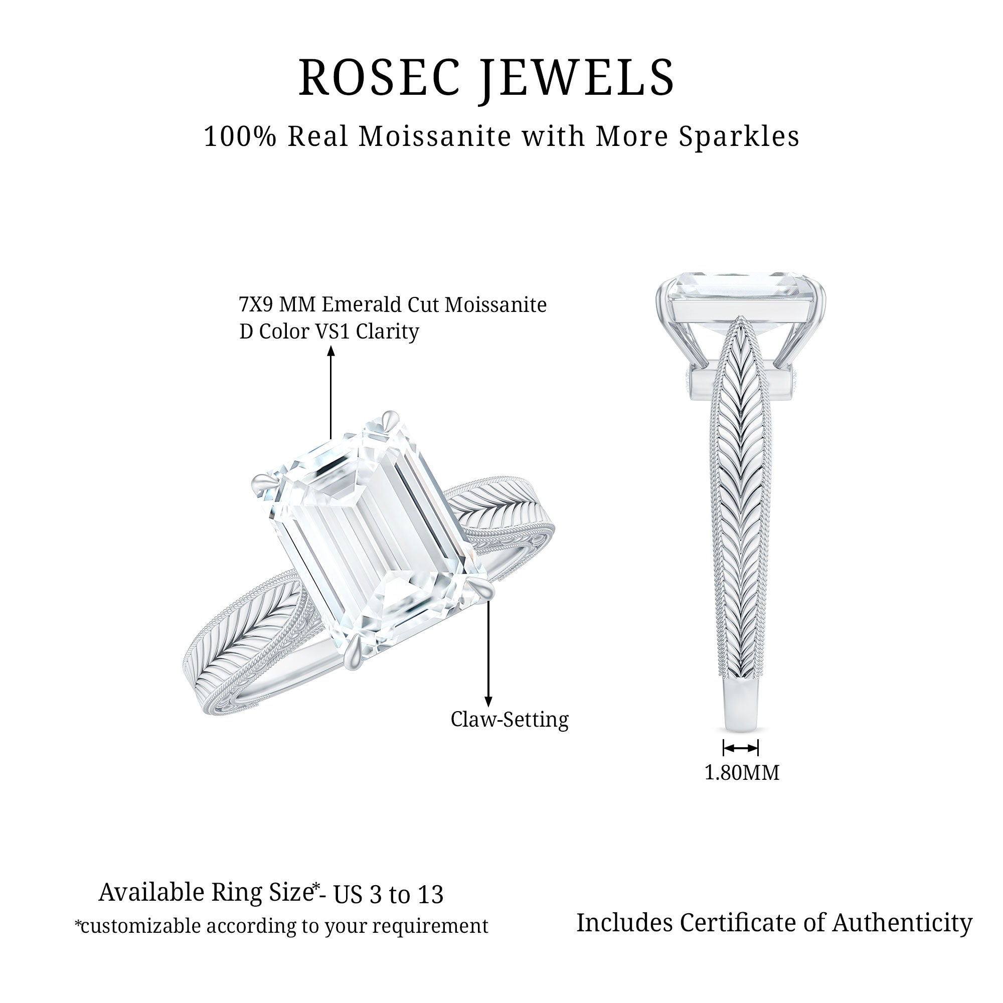 This outstanding Solitaire Engagement Ring combines timeless charm with a hint of modern sophistication. At its heart lies a dazzling 7x9MM Emerald Cut Moissanite in Claw Setting, radiating a captivating sparkle. The Pinched Band showcases exquisite Vintage twisted rope-like detailing and Engraved Patterns that provide depth and texture, making it feel like a treasured heirloom. To add an extra special touch, Round Shape Hidden Moissanite stones are nestled just below the center stone, offering a soft glow from every angle. Made with D-VS1 Quality Moissanite stones, this Emerald Cut Engagement Ring delivers exceptional brilliance while being a responsible choice. This 3 Carat Moissanite Ring is an excellent choice for those who value vintage elegance while maintaining a modern aesthetic. It is perfect for proposals, anniversaries, or commemorating a special occasion, guaranteeing that this Vintage Moissanite Ring will leave a lasting impression. Offered in US sizes 3 to 13 and delivered in an exquisite jewelry box, it is prepared to become a cherished element of your love story.