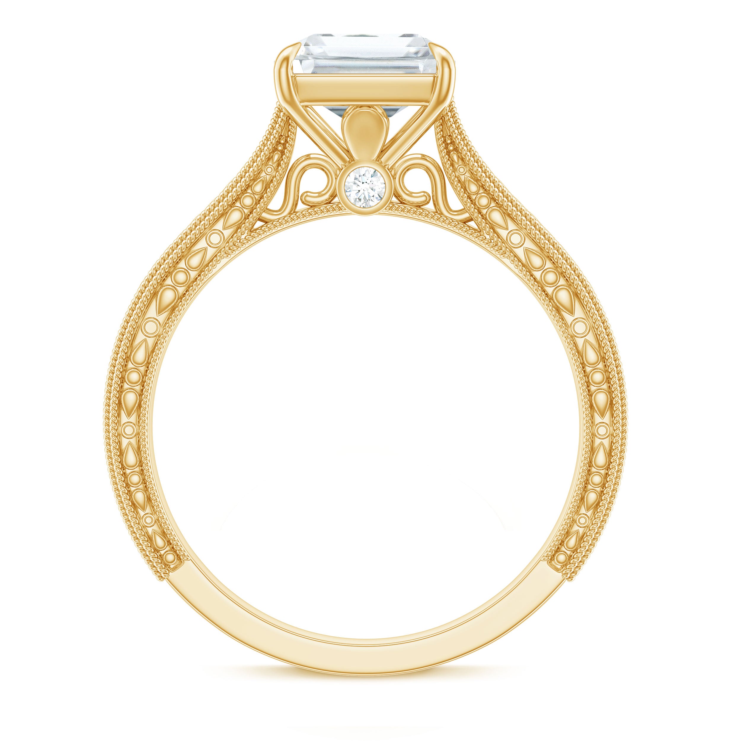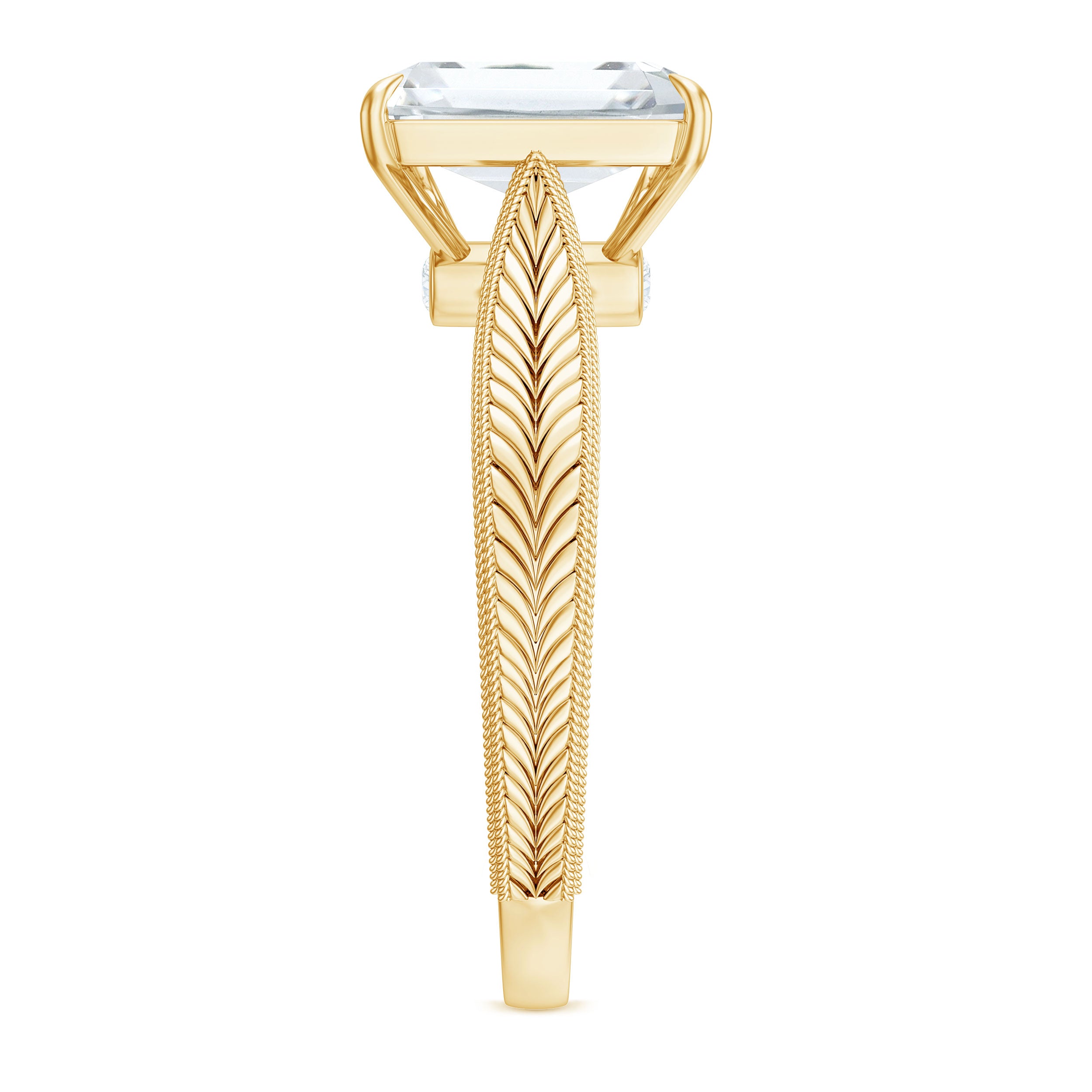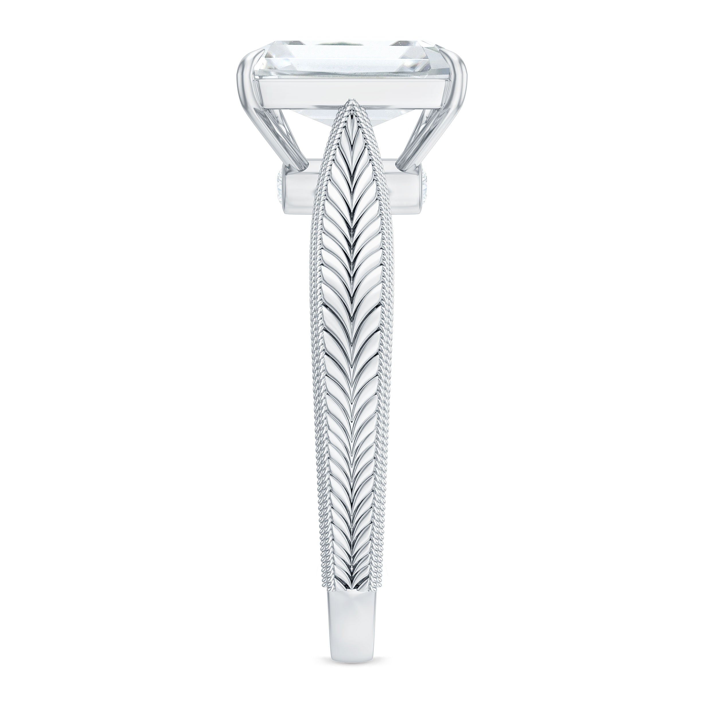 This outstanding Solitaire Engagement Ring combines timeless charm with a hint of modern sophistication. At its heart lies a dazzling 7x9MM Emerald Cut Moissanite in Claw Setting, radiating a captivating sparkle. The Pinched Band showcases exquisite Vintage twisted rope-like detailing and Engraved Patterns that provide depth and texture, making it feel like a treasured heirloom. To add an extra special touch, Round Shape Hidden Moissanite stones are nestled just below the center stone, offering a soft glow from every angle. Made with D-VS1 Quality Moissanite stones, this Emerald Cut Engagement Ring delivers exceptional brilliance while being a responsible choice. This 3 Carat Moissanite Ring is an excellent choice for those who value vintage elegance while maintaining a modern aesthetic. It is perfect for proposals, anniversaries, or commemorating a special occasion, guaranteeing that this Vintage Moissanite Ring will leave a lasting impression. Offered in US sizes 3 to 13 and delivered in an exquisite jewelry box, it is prepared to become a cherished element of your love story.