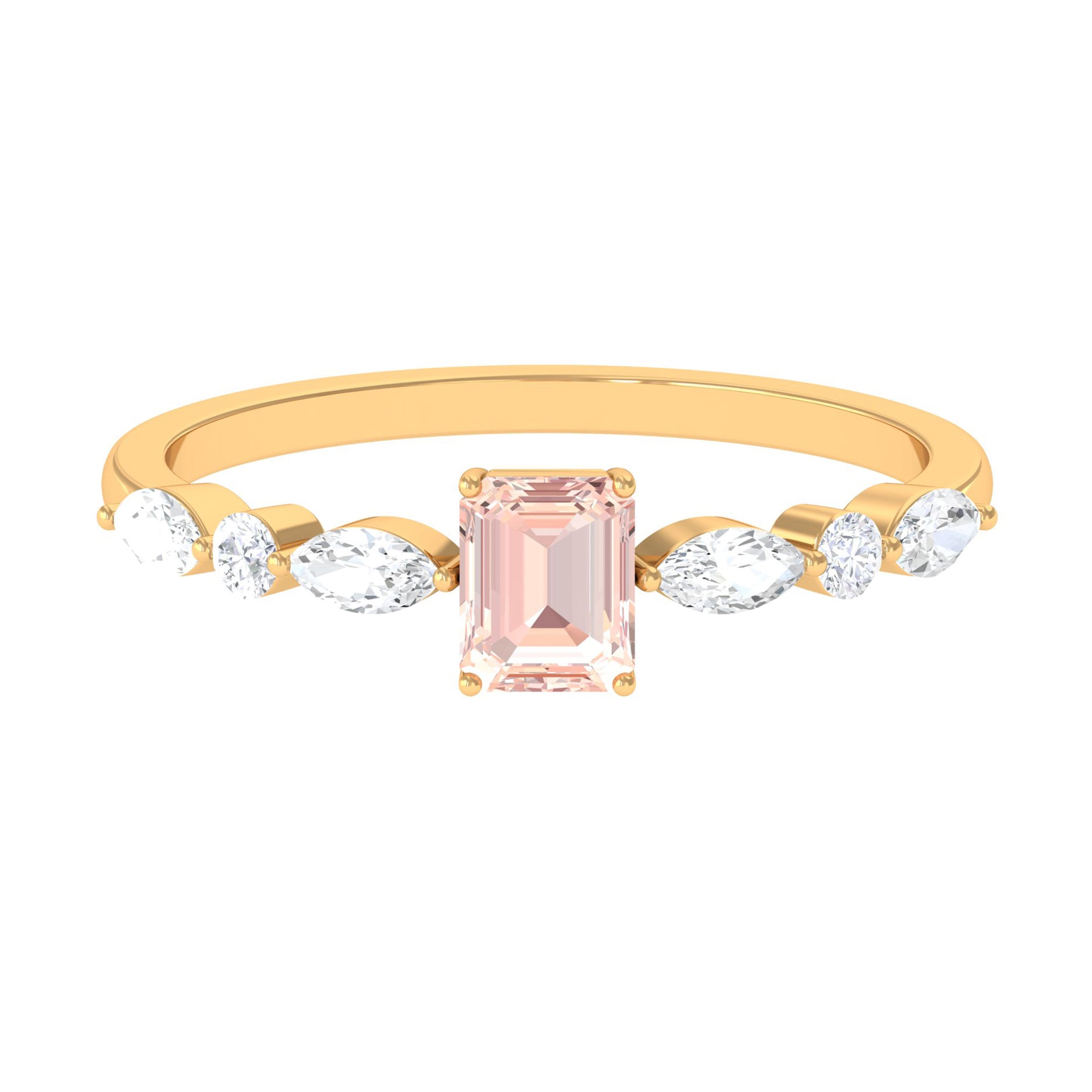 Confess your love with this Solitaire Engagement Ring for Her. It is embellished with Emerald Cut Morganite as a solitaire in a prong setting with a Round and Marquise Diamond as a side stone. This October Birthstone Ring is composed of Gold Metal. This Morganite Engagement Ring will be a unique present for women that they will wear on any occasion.