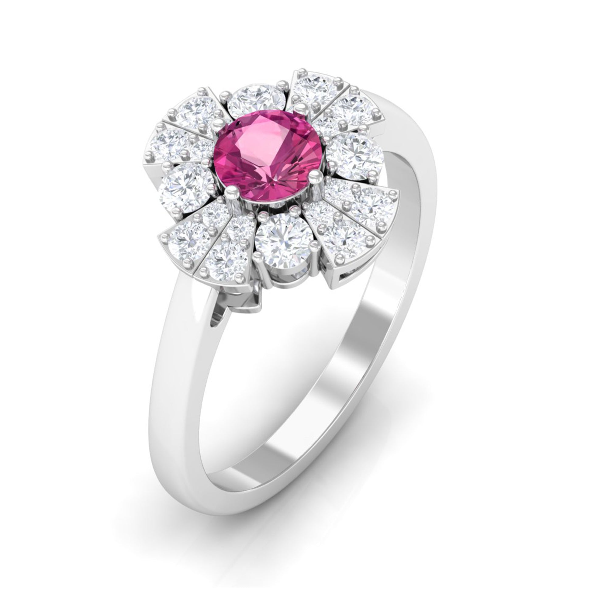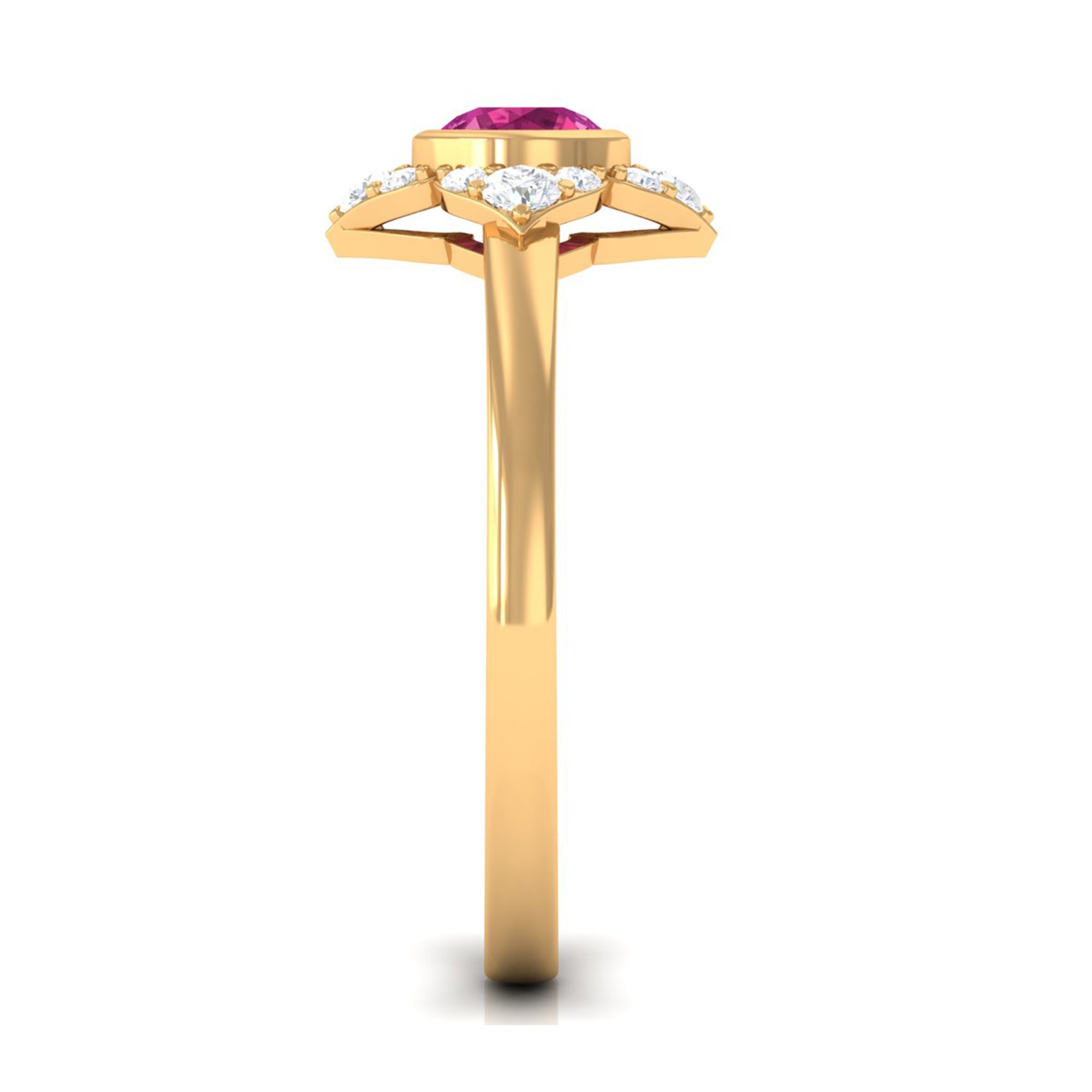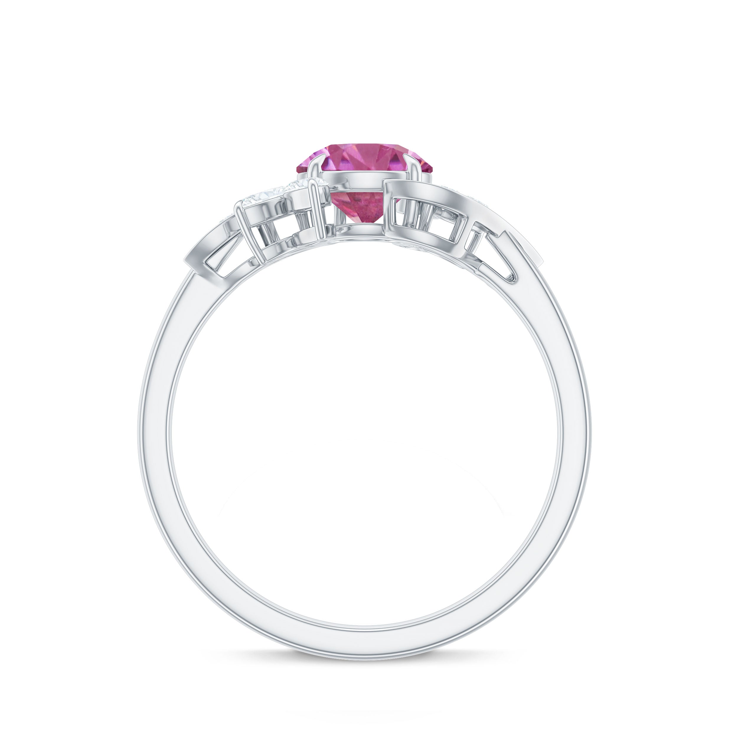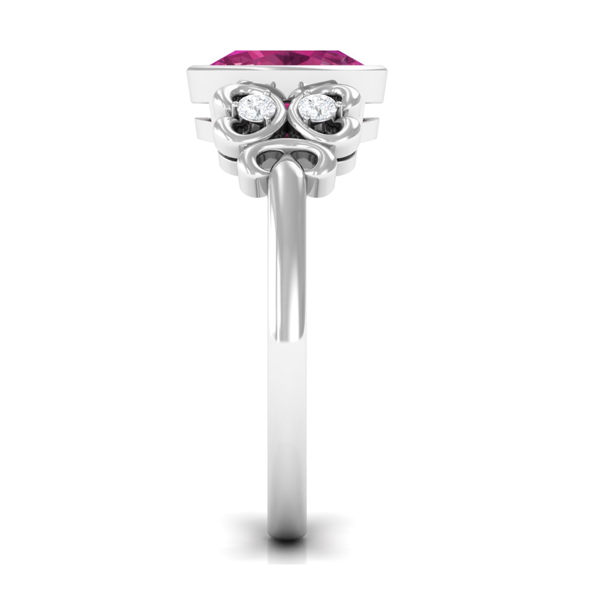 Easily the go-to ring style for the classic bride-to-be, this Solitaire Ring is defined by a Centerpiece of Pink Tourmaline that stands all alone (preferably mounted in a Simple Setting). The feminine appeal of Pink Tourmaline here is meant to catch the most attention owing to its enormous size of 6 MM or more. While the minimalist and timeless aesthetic of this engagement ring sets it apart, its versatility (thanks to the many shapes it is fashioned with) deserves just as many praises. While a Round Pink Tourmaline Engagement Ring speaks to conventional couples, the one fashioned with Pear, Marquise, or Pear Cut is more on the fancier side of the spectrum. If you’re the kind of bride-to-be who fancies a grand and slightly Vintage Pink Tourmaline Engagement Ring, go for the one handcrafted with Asscher, Cushion, or Emerald Cut.