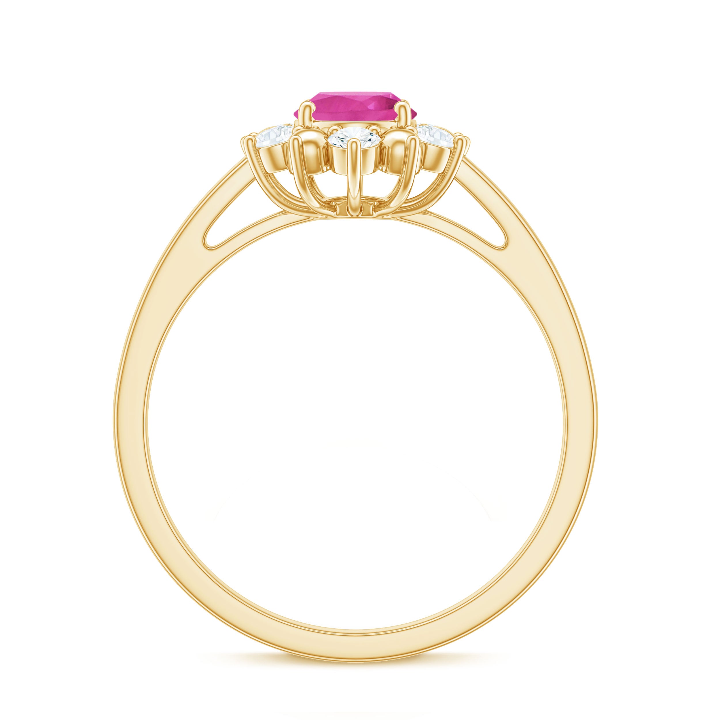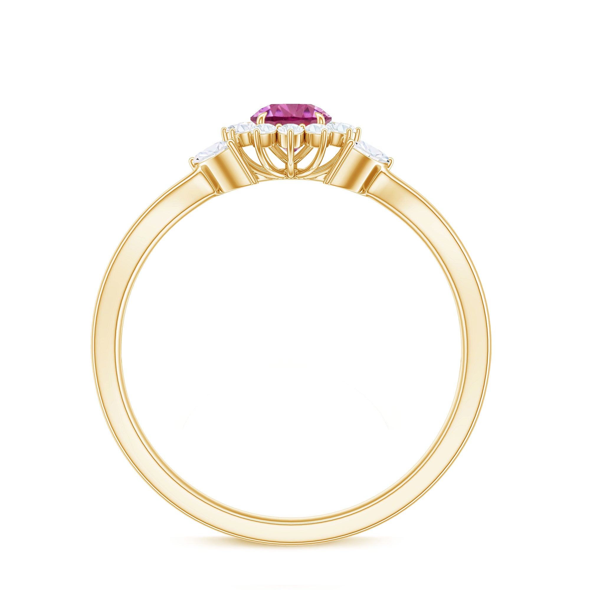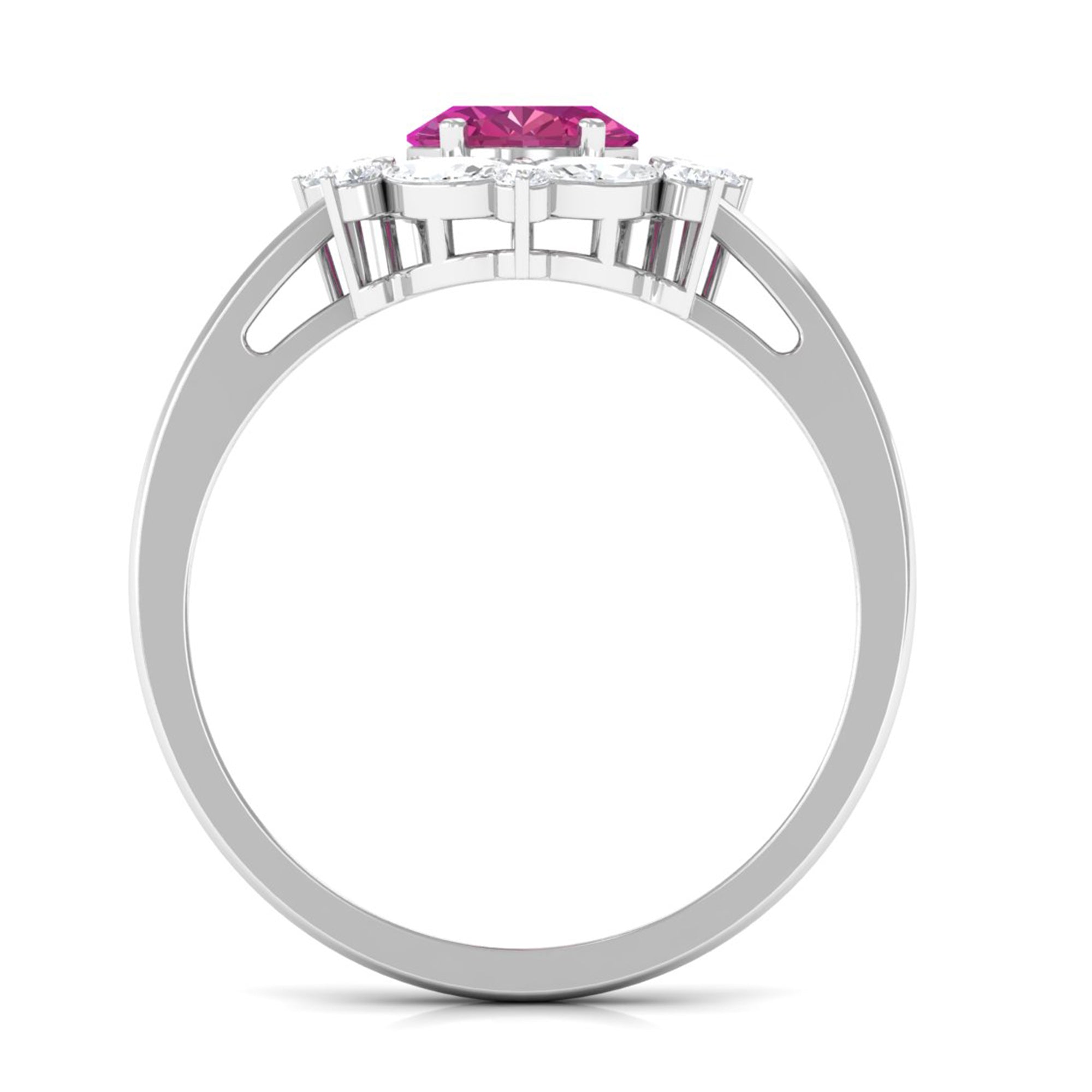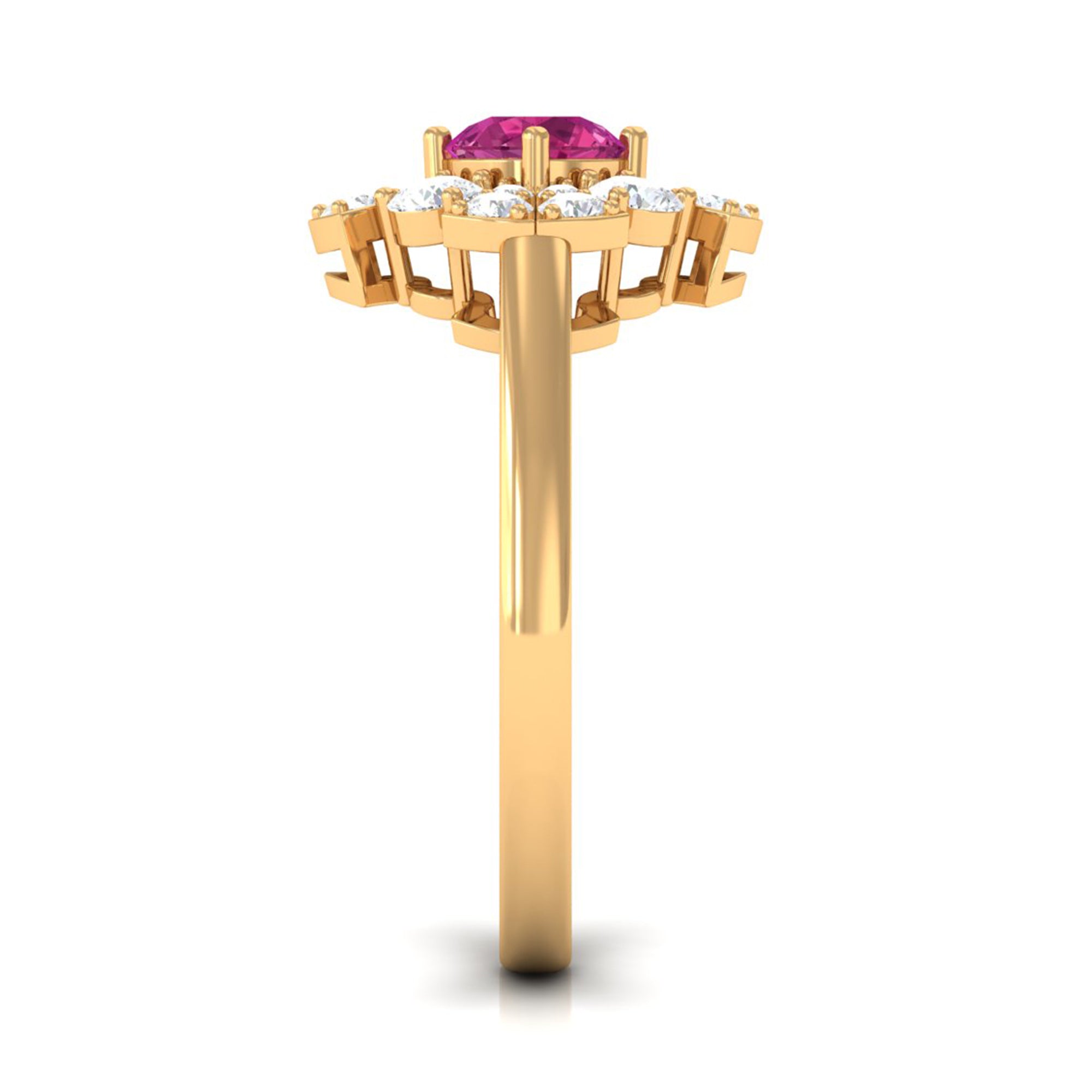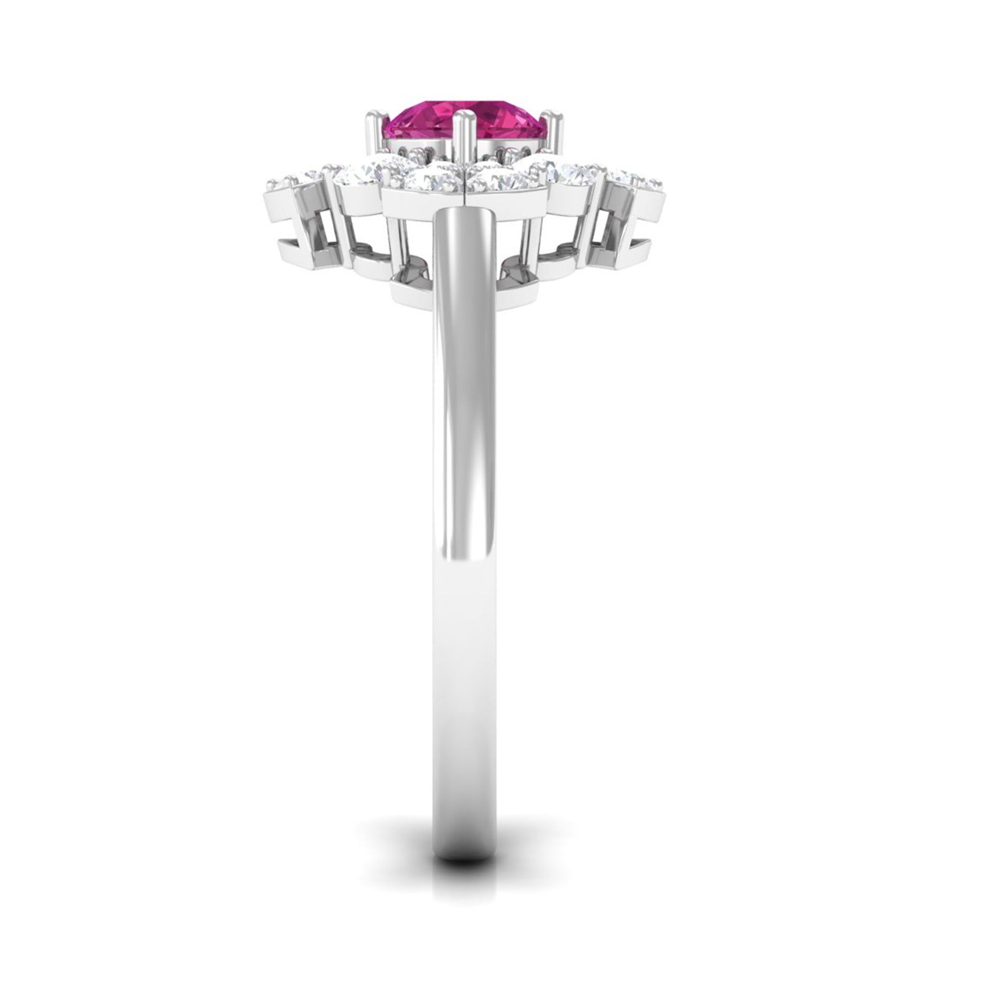 Easily the go-to ring style for the classic bride-to-be, this Solitaire Ring is defined by a Centerpiece of Pink Tourmaline that stands all alone (preferably mounted in a Simple Setting). The feminine appeal of Pink Tourmaline here is meant to catch the most attention owing to its enormous size of 6 MM or more. While the minimalist and timeless aesthetic of this engagement ring sets it apart, its versatility (thanks to the many shapes it is fashioned with) deserves just as many praises. While a Round Pink Tourmaline Engagement Ring speaks to conventional couples, the one fashioned with Pear, Marquise, or Pear Cut is more on the fancier side of the spectrum. If you’re the kind of bride-to-be who fancies a grand and slightly Vintage Pink Tourmaline Engagement Ring, go for the one handcrafted with Asscher, Cushion, or Emerald Cut.