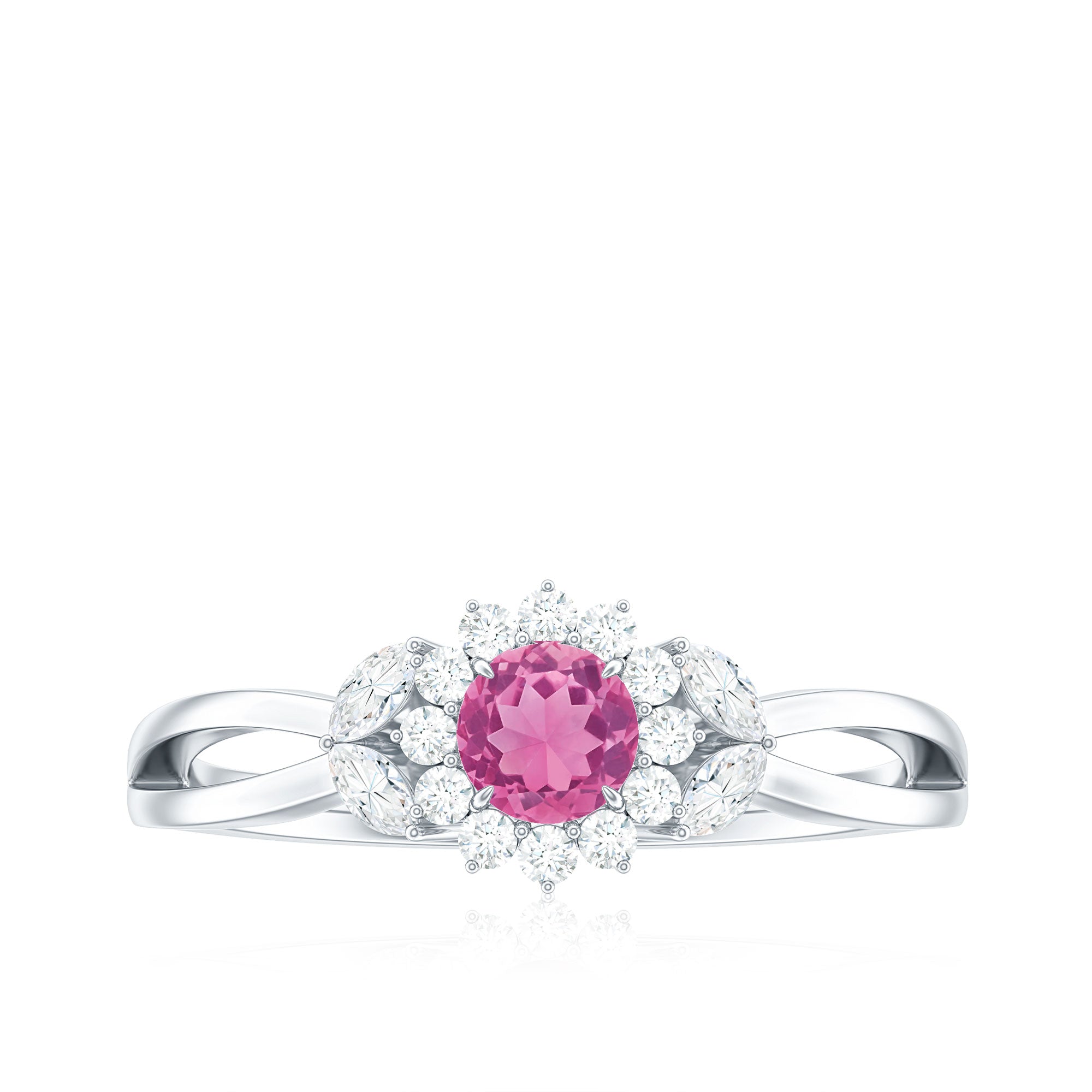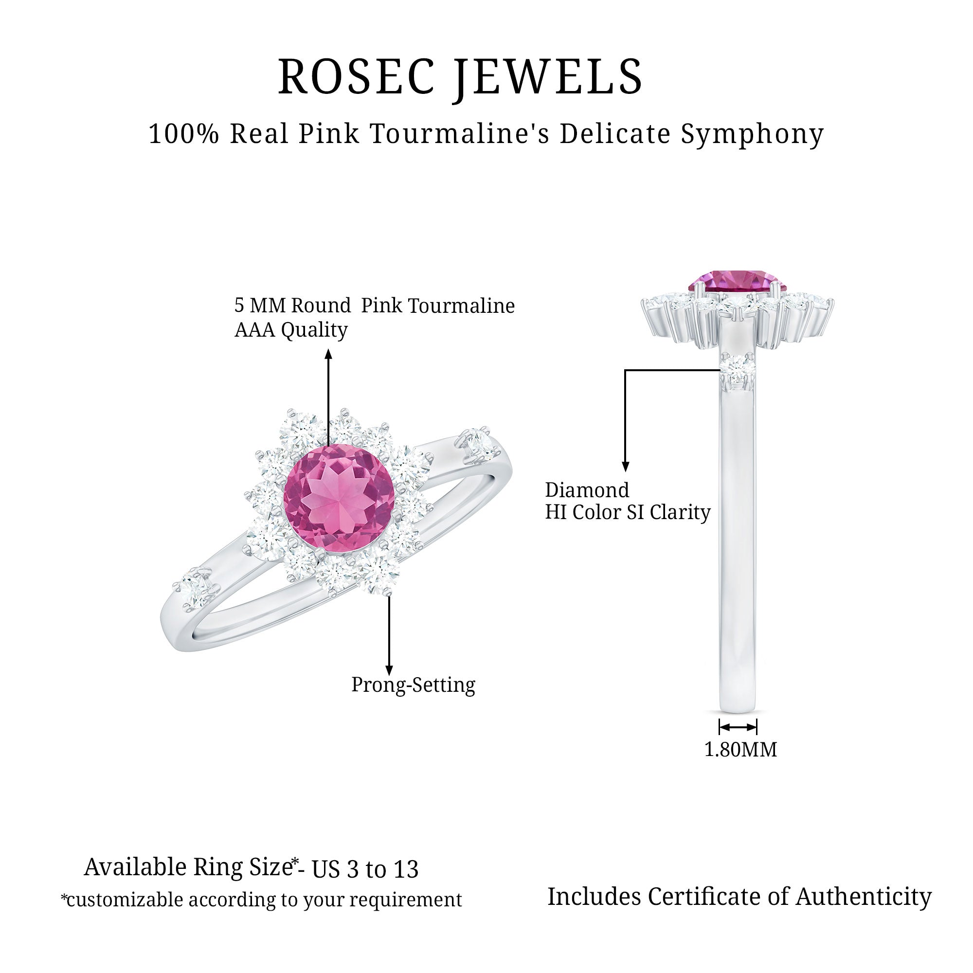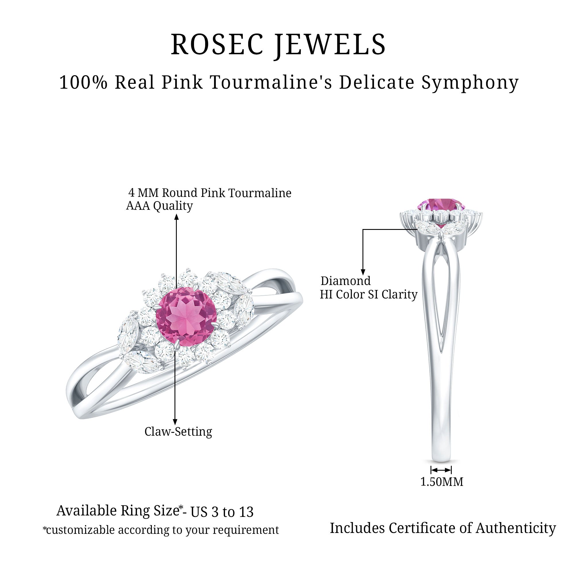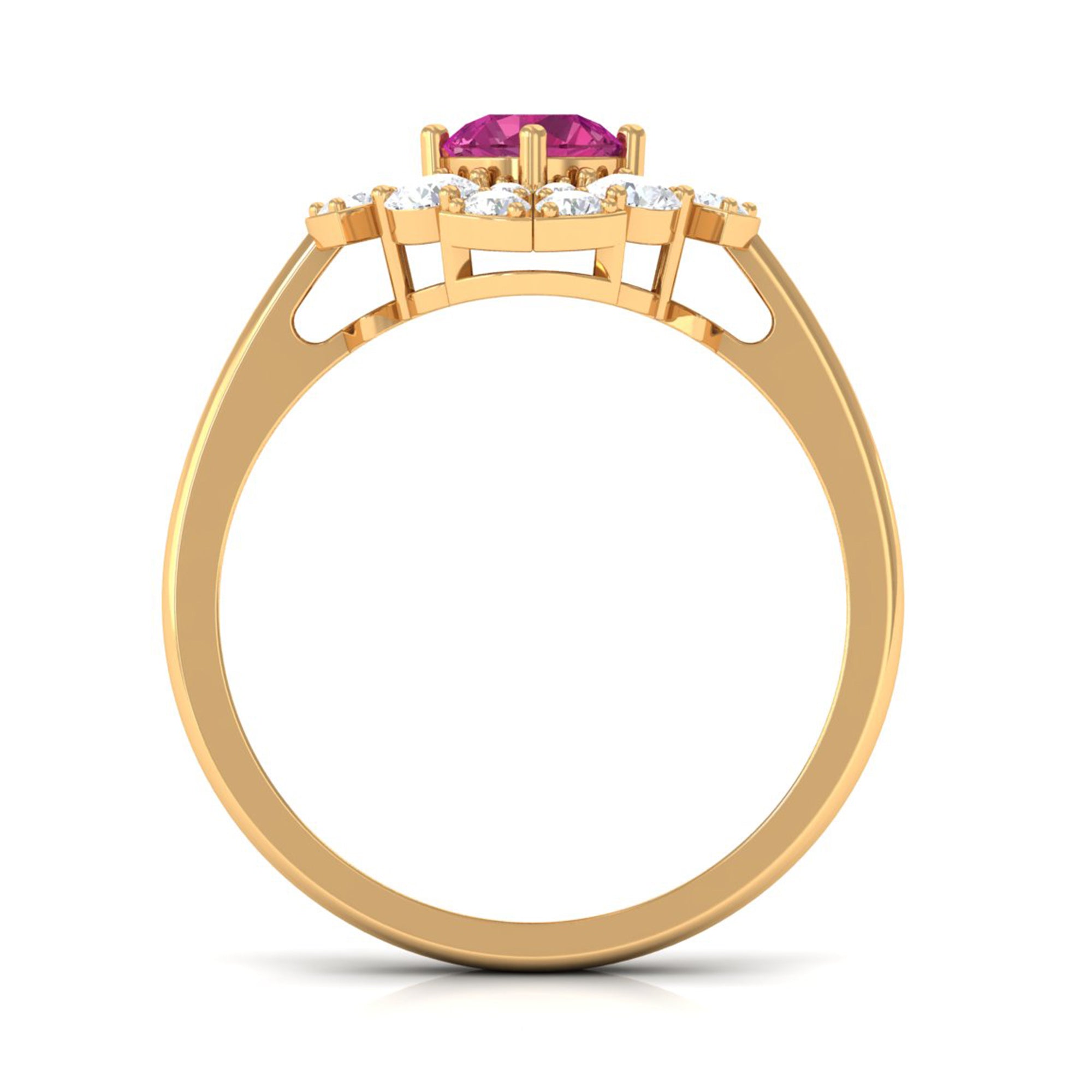 Lending the Classic Solitaire Style more visual appeal, Halo encircles the Centerpiece of Pink Tourmaline with a shimmering row of petite Diamond/Moissanite. As a result, the Pink Tourmaline not only oozes more personality, but its delicate beauty is emphasized since the Halo gives off the illusion of a larger size. Owing to its romantic hue and enhanced brilliance, it makes for one of the most Unique Pink Tourmaline Engagement Rings out there!