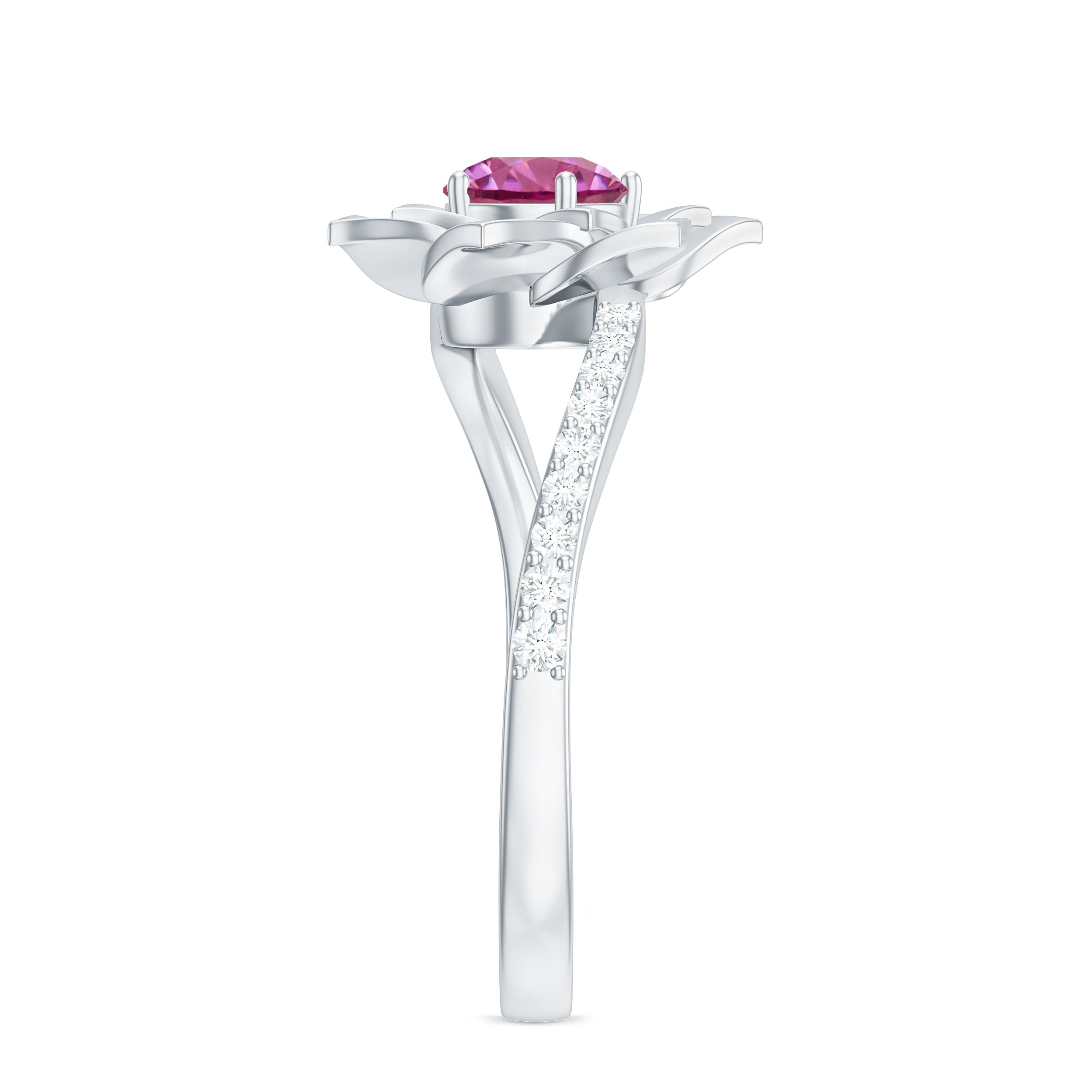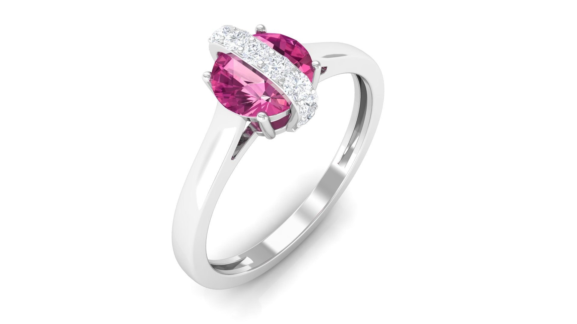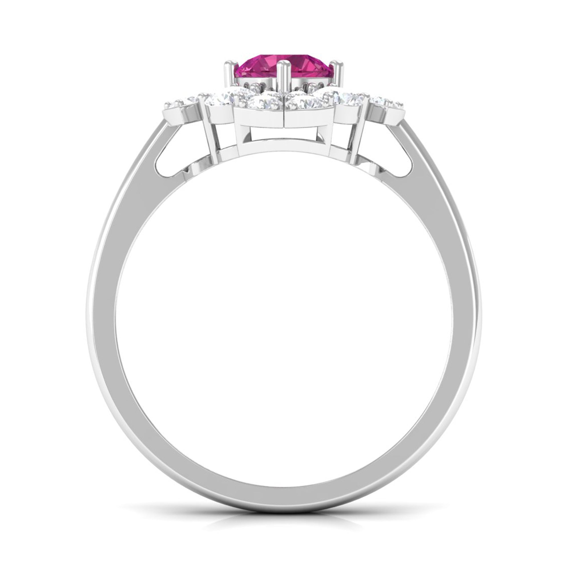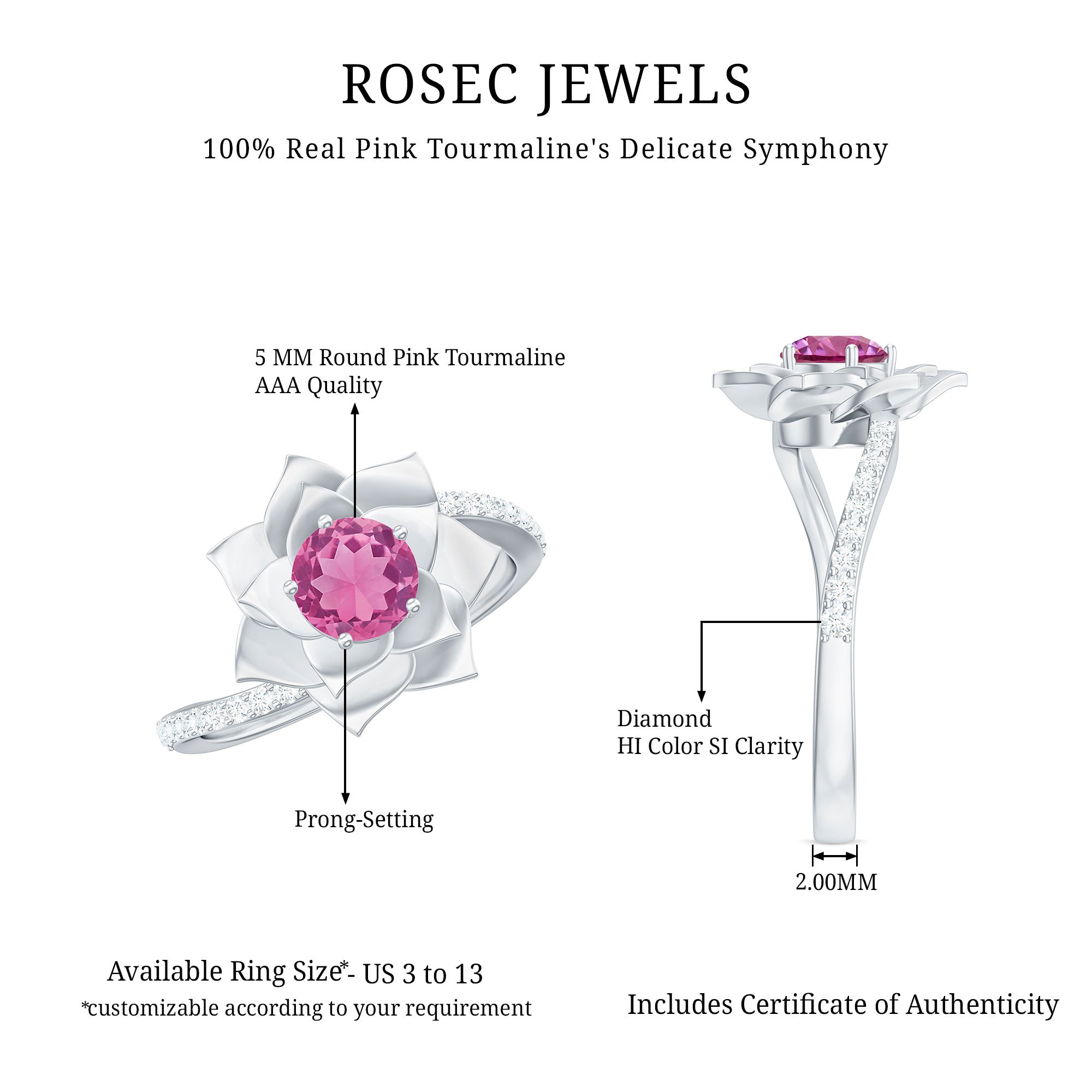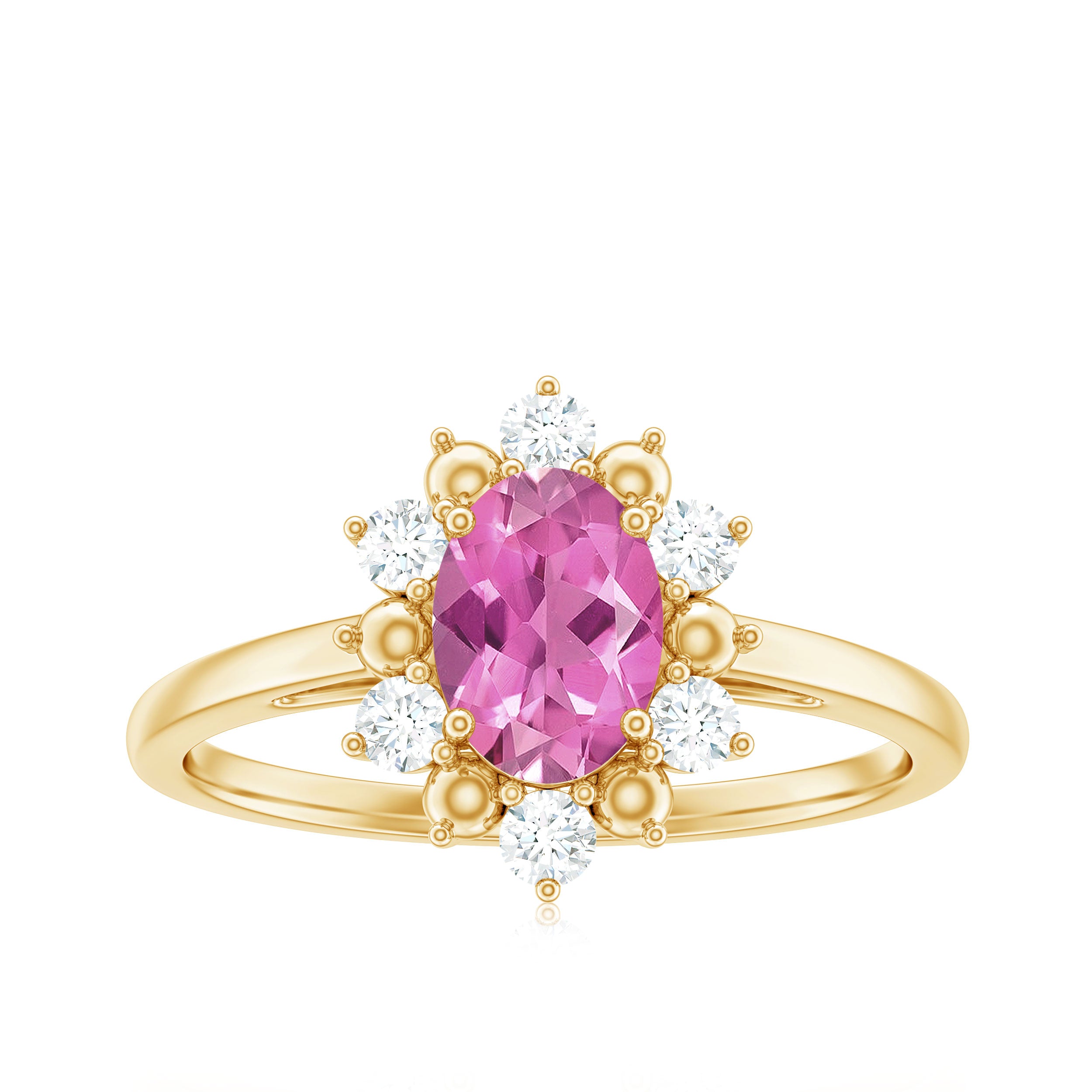 Lending the Classic Solitaire Style more visual appeal, Halo encircles the Centerpiece of Pink Tourmaline with a shimmering row of petite Diamond/Moissanite. As a result, the Pink Tourmaline not only oozes more personality, but its delicate beauty is emphasized since the Halo gives off the illusion of a larger size. Owing to its romantic hue and enhanced brilliance, it makes for one of the most Unique Pink Tourmaline Engagement Rings out there!