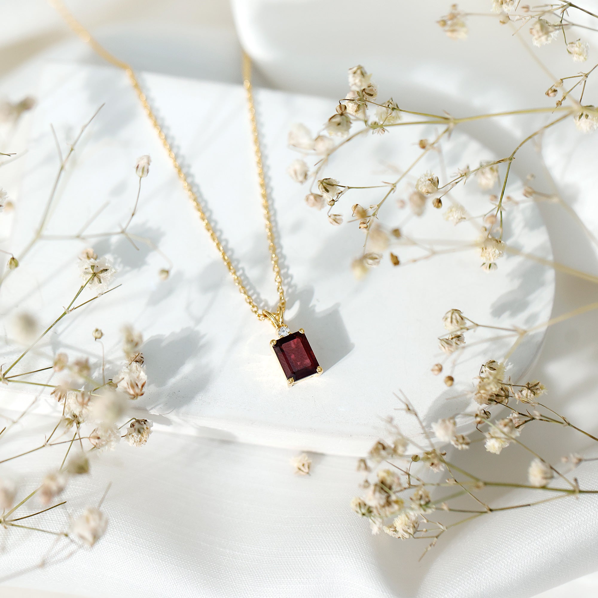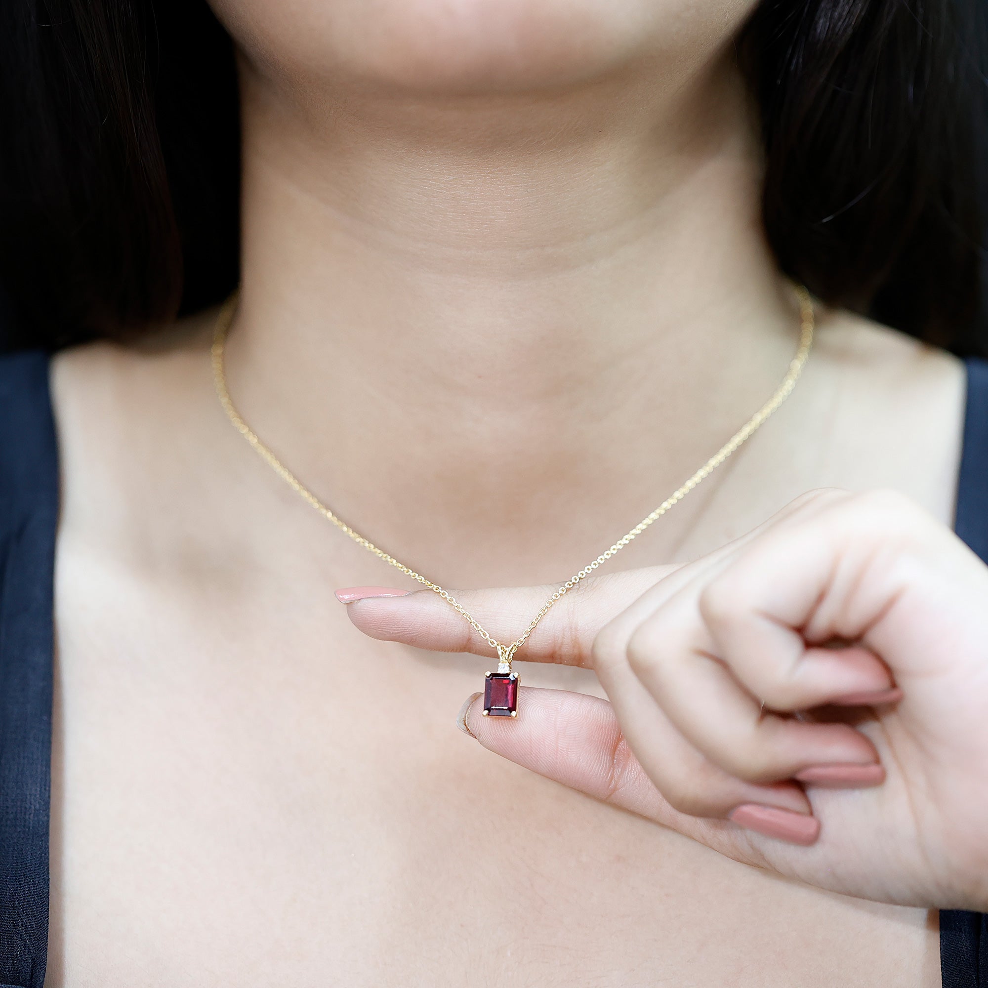 Turn heads with the rich, romantic hue of this Rhodolite Garnet Necklace, a striking blend of bold color and timeless elegance. Crafted from sterling silver with a 14k yellow gold plating, this Solitaire Pendant features a captivating 6X8 MM emerald cut Rhodolite gemstone set in prongs, radiating a luxurious hue that symbolizes passion, love, and inner strength. Adding a delicate contrast to the intense beauty of the center stone is a sparkling dainty round brilliant cut lab diamond, enhancing the pendant’s brilliance without overshadowing the star of the show. The refined combination of rich color and fiery sparkle makes this Emerald Cut Necklace a standout piece that is anything but ordinary. Suspended gracefully from a shimmering chain with a rabbit ear bail, this Rhodolite Pendant is designed to complement everything from evening wear to wedding gowns, or even elevate your everyday look. This Rhodolite and Diamond Necklace makes a thoughtful gift for anniversaries, birthdays, Valentine’s Day, or simply celebrating someone who loves rich, vibrant color. It is not just a piece of jewelry, it is a celebration of confidence, romance, and unforgettable style. Let your neckline glow with the warmth and sophistication of this stunning gemstone treasure.