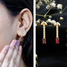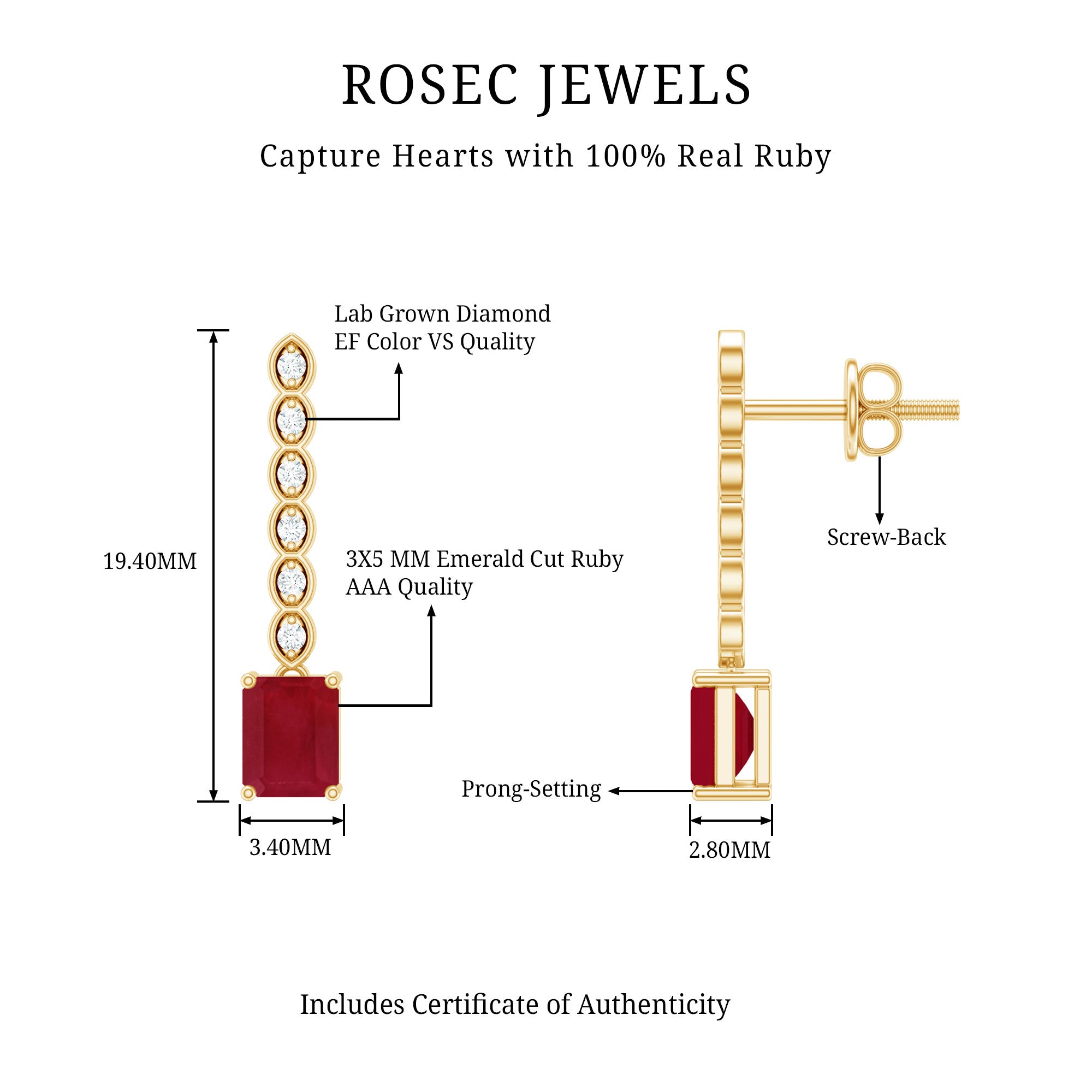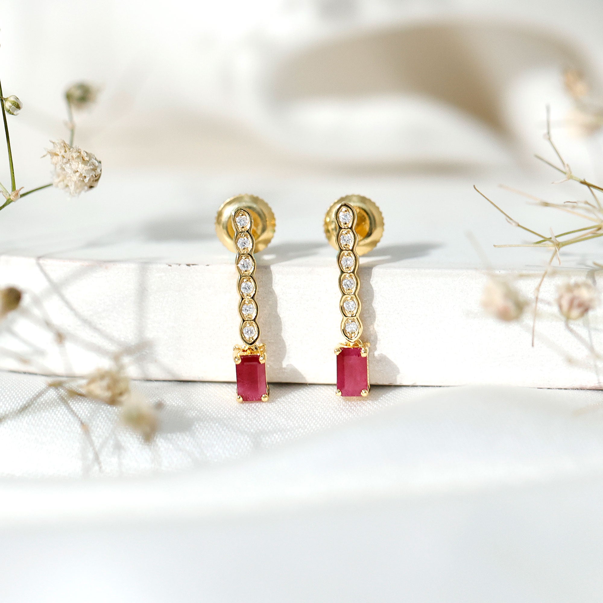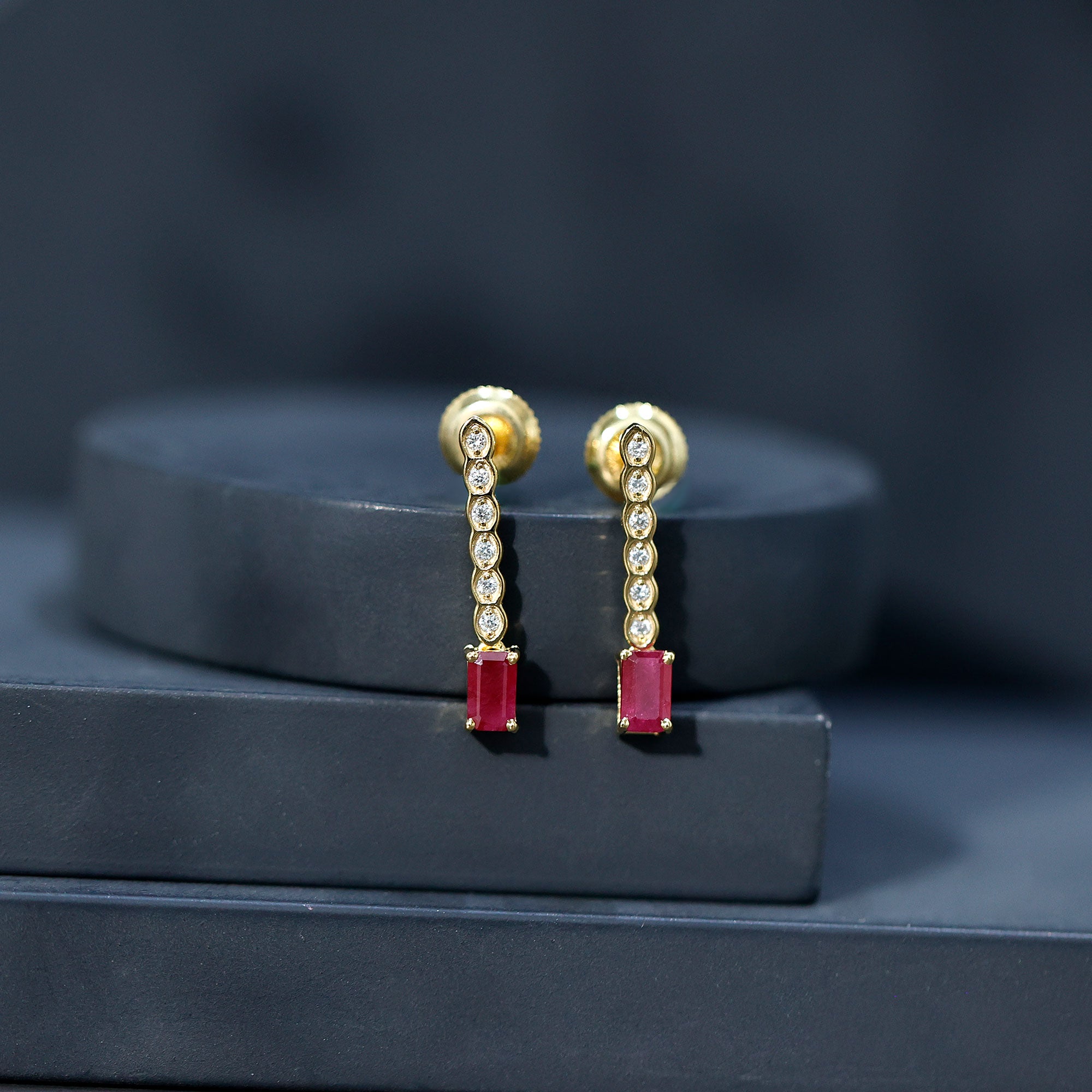 Let your look shine with timeless charm with these Ruby Dangle Earrings, crafted to bring a soft yet striking touch to your style. With a perfect mix of elegance and simplicity, this pair flows beautifully with your every move, ideal for both daily wear and special moments. Handcrafted in 14k yellow gold plated silver, each earring begins with a polished vertical bar accented with a fine line of round brilliant cut lab grown diamonds, adding a delicate sparkle that catches the eye. Hanging at the bottom is a 3X5 MM emerald cut Ruby, securely held in prong setting. These July Birthstone Earrings are not only stylish but also meaningful, symbolizing passion, love, and strength. Whether you are heading into a meeting or stepping out for a romantic evening, these Ruby Drop Earrings offer a refined touch that completes your look with grace. Lightweight and designed for comfort, they feature screw back closures that keep them secure throughout your day. From birthdays to anniversaries or just because, these Ruby and Diamond Earrings are a beautiful way to celebrate someone special, or to treat yourself to a piece that never goes out of style.