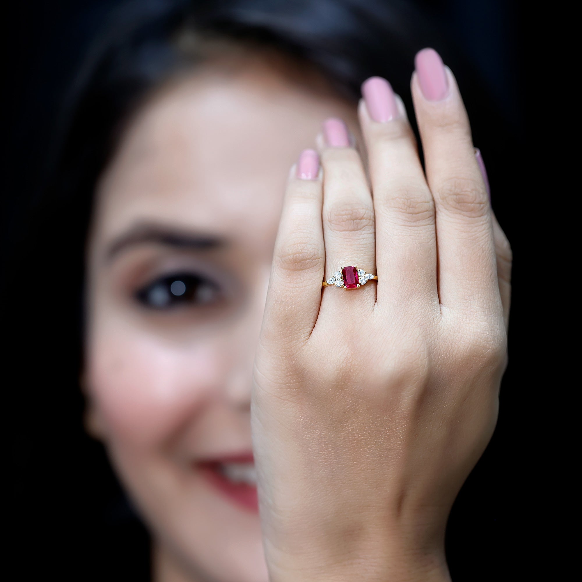 Start your forever story with a ring that speaks louder than words. Thoughtfully designed and full of timeless charm, this Lab Created Ruby Promise Ring is a beautiful way to celebrate love, commitment, or any meaningful milestone. Crafted in 14K yellow gold plated silver, it brings together elegance, craftsmanship, and a hint of bold expression. At the center of this ring is a 4X6 MM emerald cut lab created ruby, set in prong setting that holds the gemstone securely. On either side of the center stone, you will find a graceful trio of round and marquise cut lab grown diamonds that subtly catch the light and enhance the overall brilliance of the piece. The band is smooth and comfortable for daily wear, yet it makes enough of a statement to stand out on special occasions. With AAAA quality ruby and EF-VS quality lab created diamonds, this Pre Engagement Ring shows its ethical sourcing. Each detail, from the emerald shape to the flawless trop design, has been crafted with love and precision. Whether you are proposing, gifting, or celebrating your own journey, this Ruby and Diamond Ring is a symbol of strength, love, and new beginnings. Its design is heartfelt, timeless, and made to be treasured.