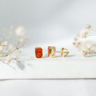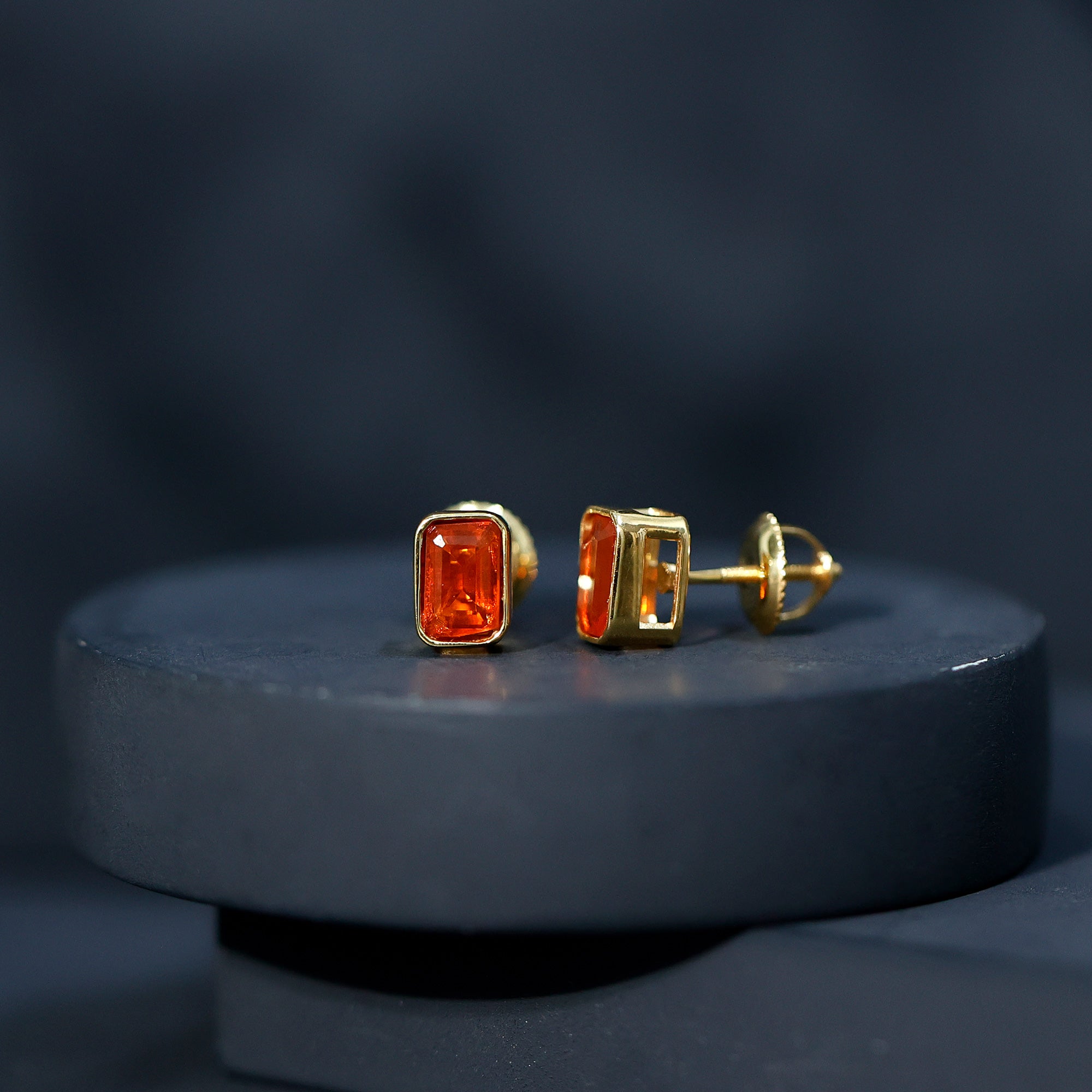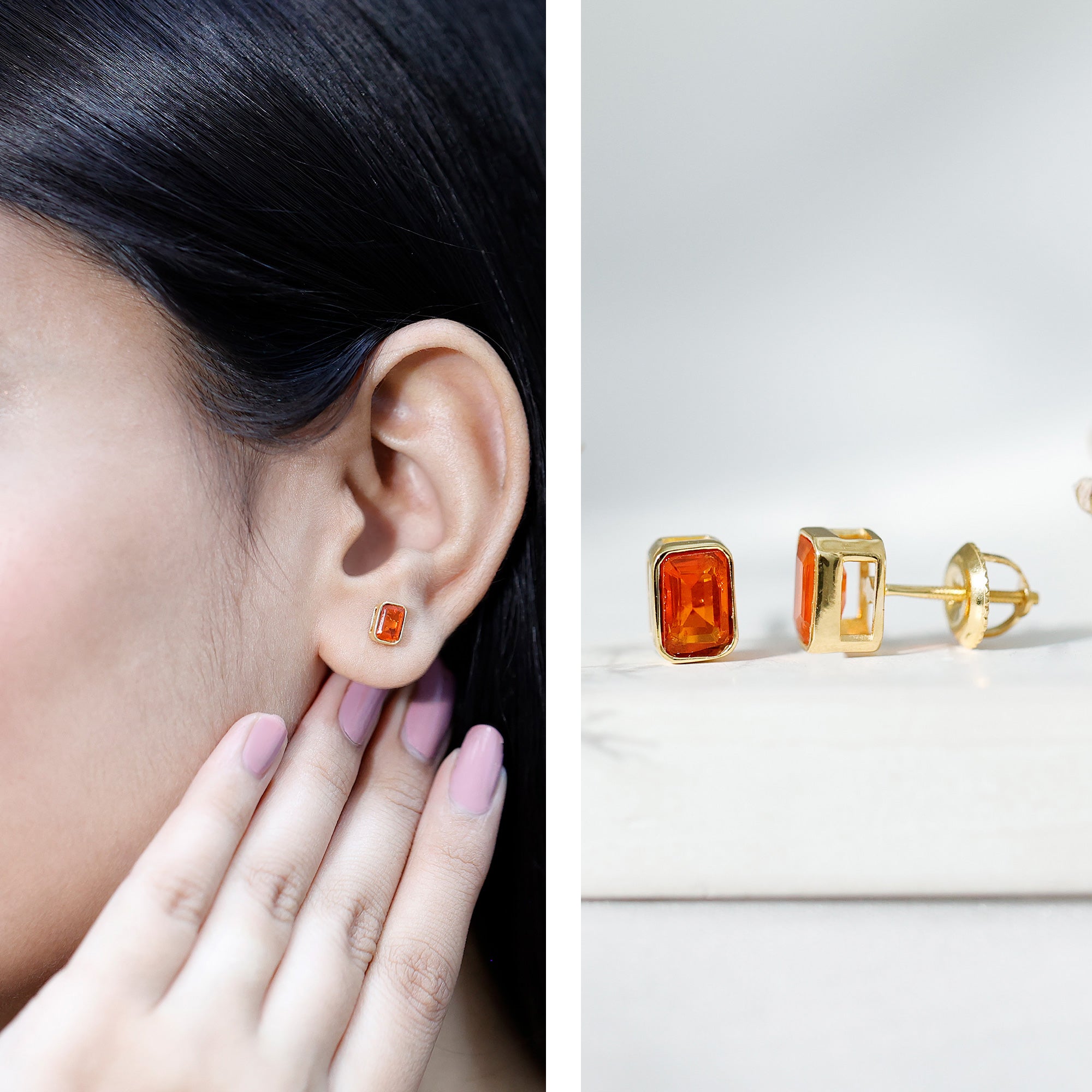These Fire Opal Stud Earrings are a beautiful blend of modern design and classic detail, making them the kind of accessory you will never want to take off. Carefully crafted in 14K yellow gold plated silver, each earring features a 4X6 MM emerald cut fire opal securely set in a smooth bezel setting. This sleek frame not only adds a clean and polished look but also offers extra protection for the gemstone, making these Solitaire Studs ideal for daily wear. The screw back closures give you peace of mind, ensuring that the earrings stay comfortably in place whether you are running errands or heading out for a dinner date. Lightweight and practical, they are designed to be lived in without losing their charm. As the birthstone for October, fire opal holds special meaning, often associated with creativity, passion, and self-expression. These October Birthstone Earrings make a thoughtful gift for birthdays, anniversaries, or even just to show your love. Whether you are dressing up for something special or adding a touch of style to your everyday look, these Emerald Cut Earrings strike the perfect balance between minimal and meaningful.