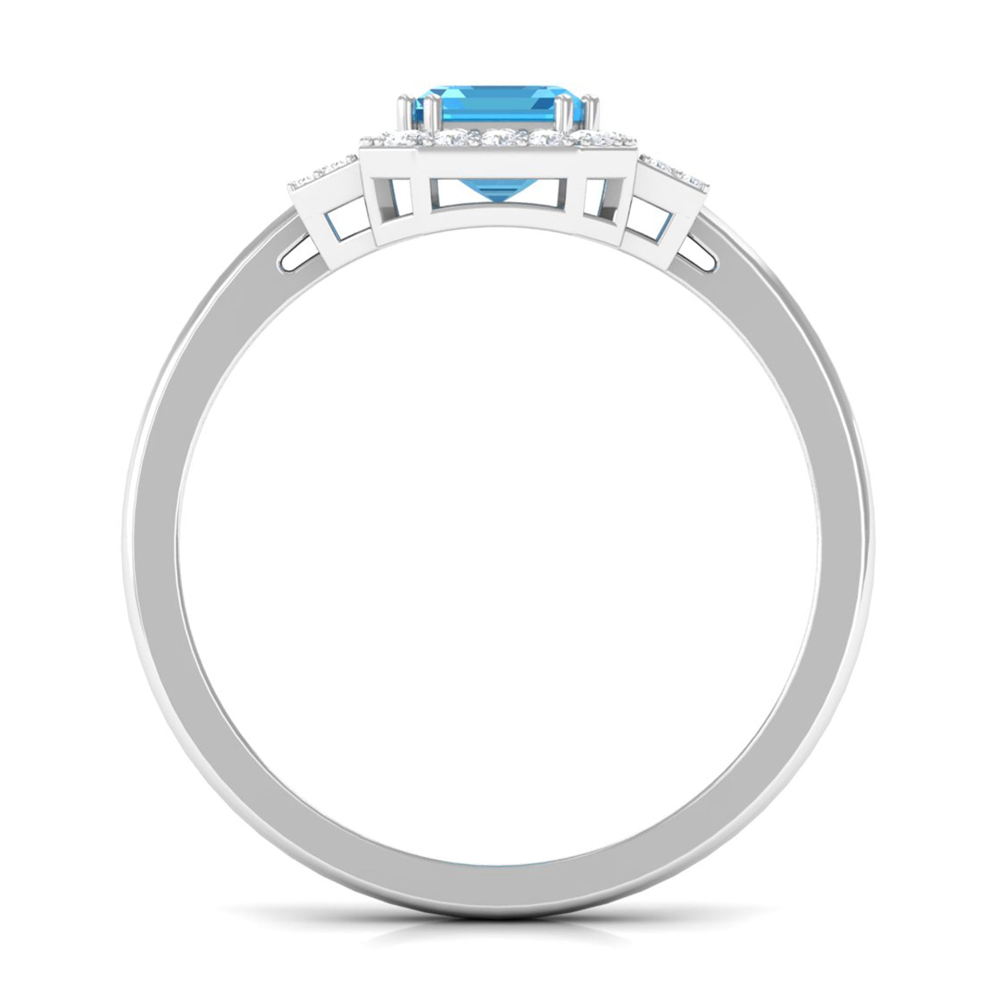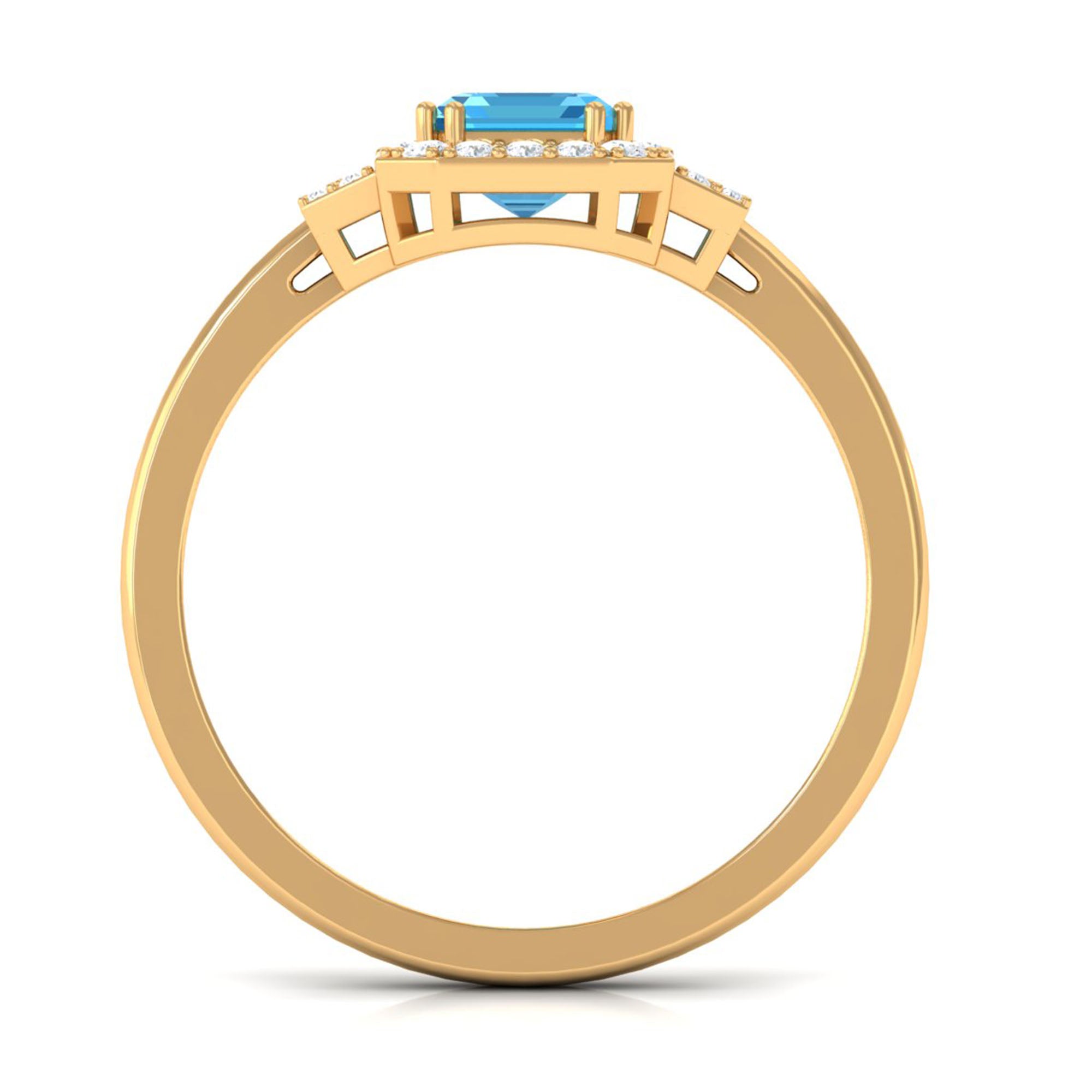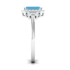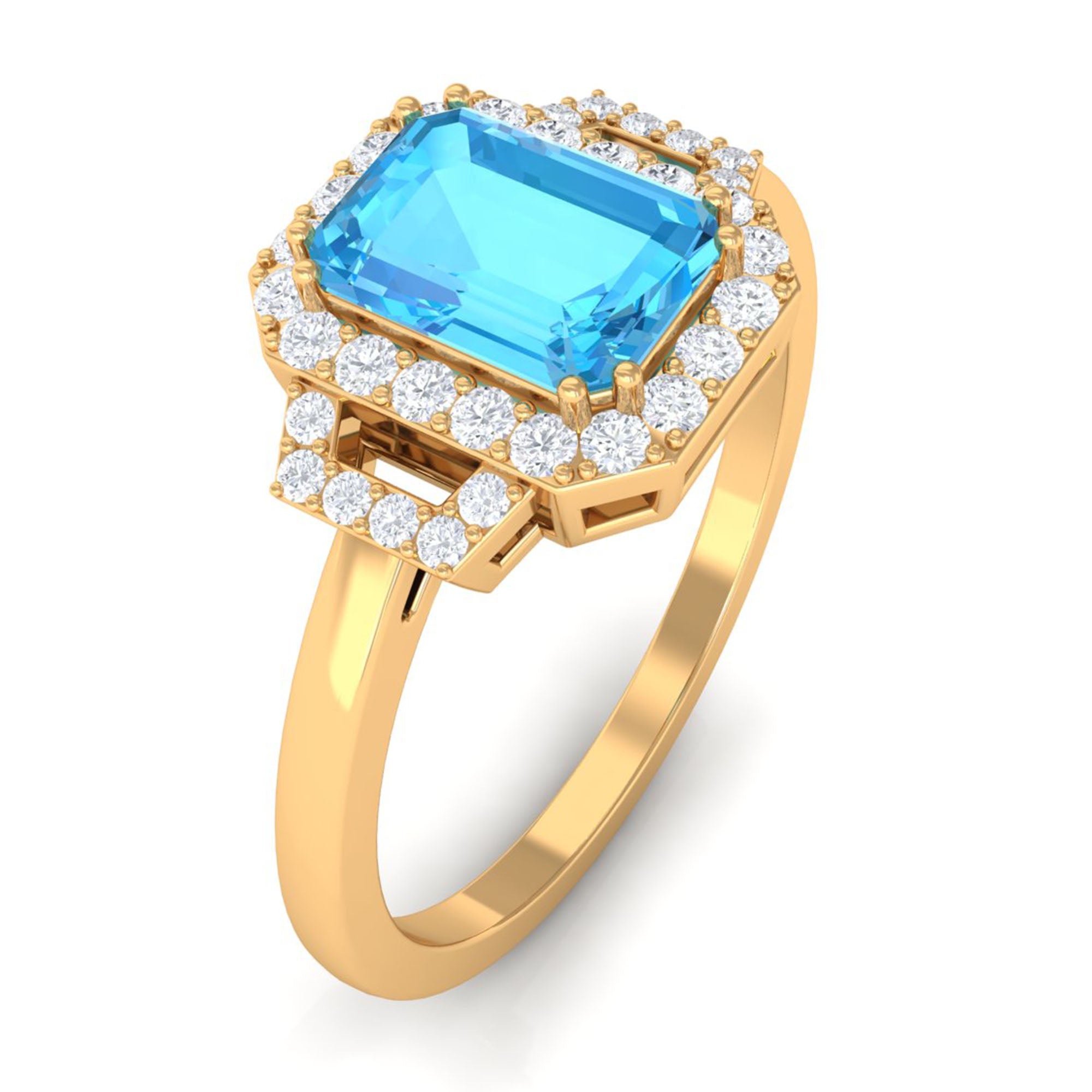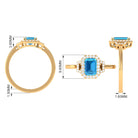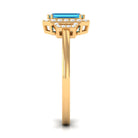 Make a bold statement with this magnificent engagement ring, featuring a stunning Emerald Cut-cut Swiss Blue Topaz centerpiece, encircled by a sparkling halo of round Diamond stones. Crafted with high-quality gold, this Swiss Blue Topaz ring is designed to last a lifetime. The striking Blue of the Swiss Blue Topaz is beautifully complemented by the brilliance of the Diamond stones. With its unique and eye-catching design, this ring is the perfect symbol of your love and commitment to your significant other. Its a truly exceptional piece that will leave your loved one speechless.