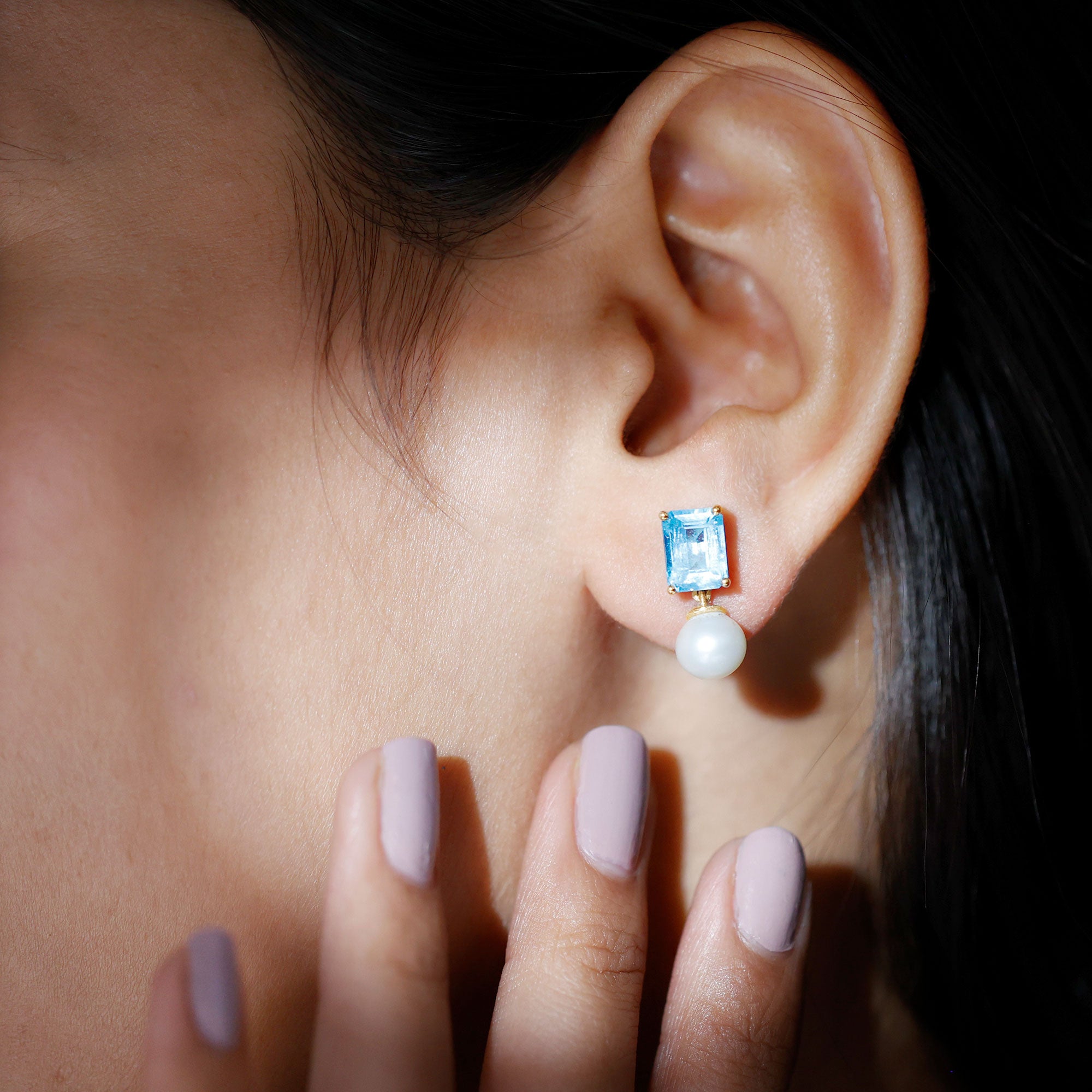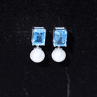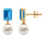 Emerald Cut Swiss Blue Topaz and Freshwater Pearl Drop Earrings