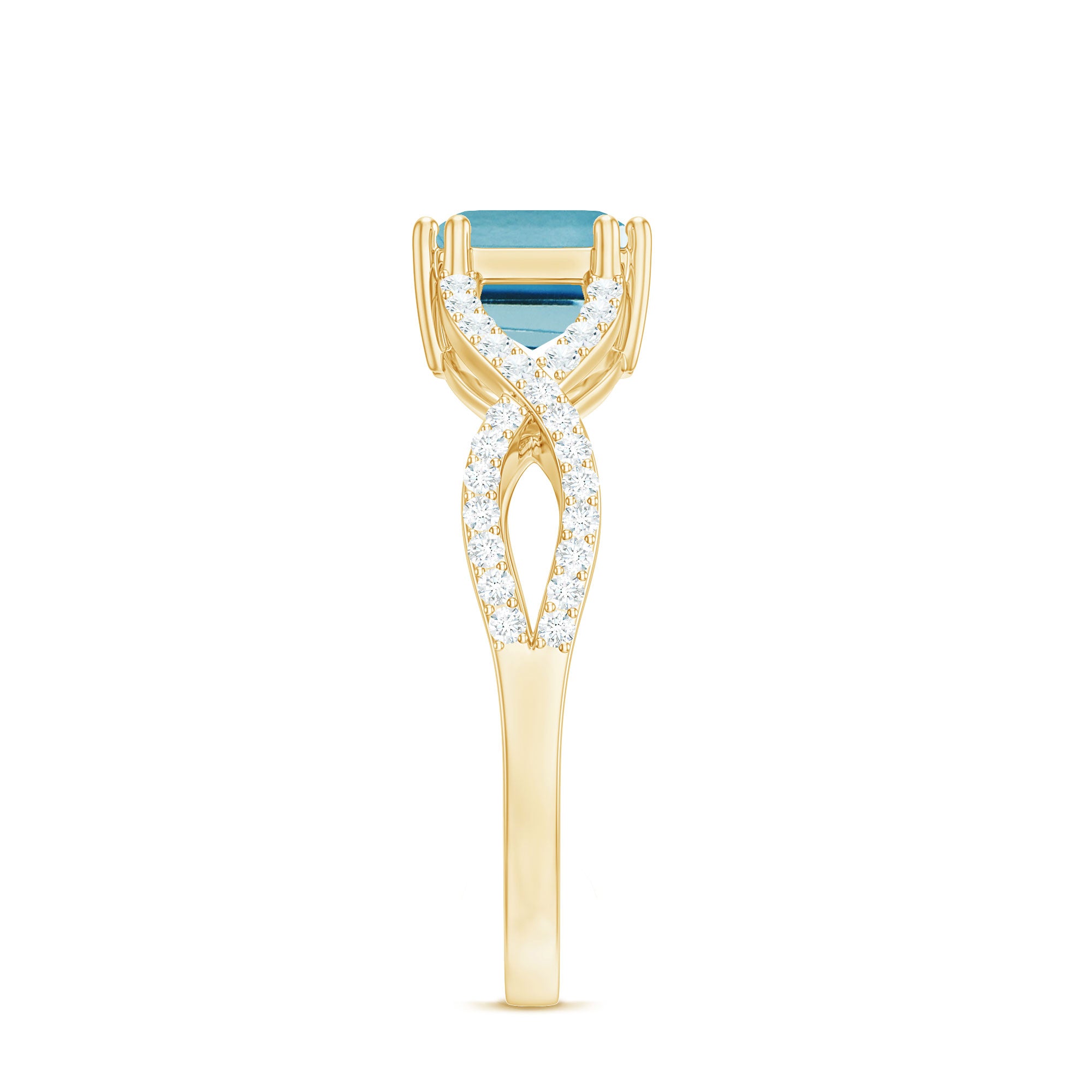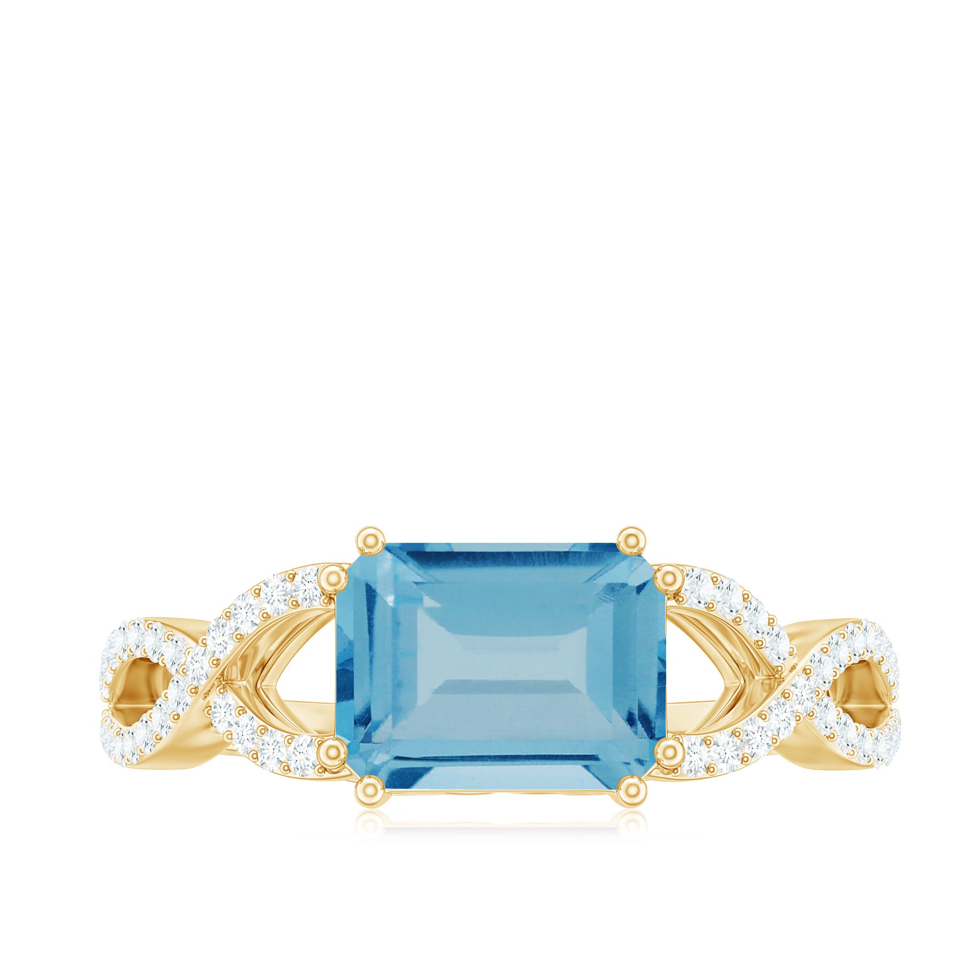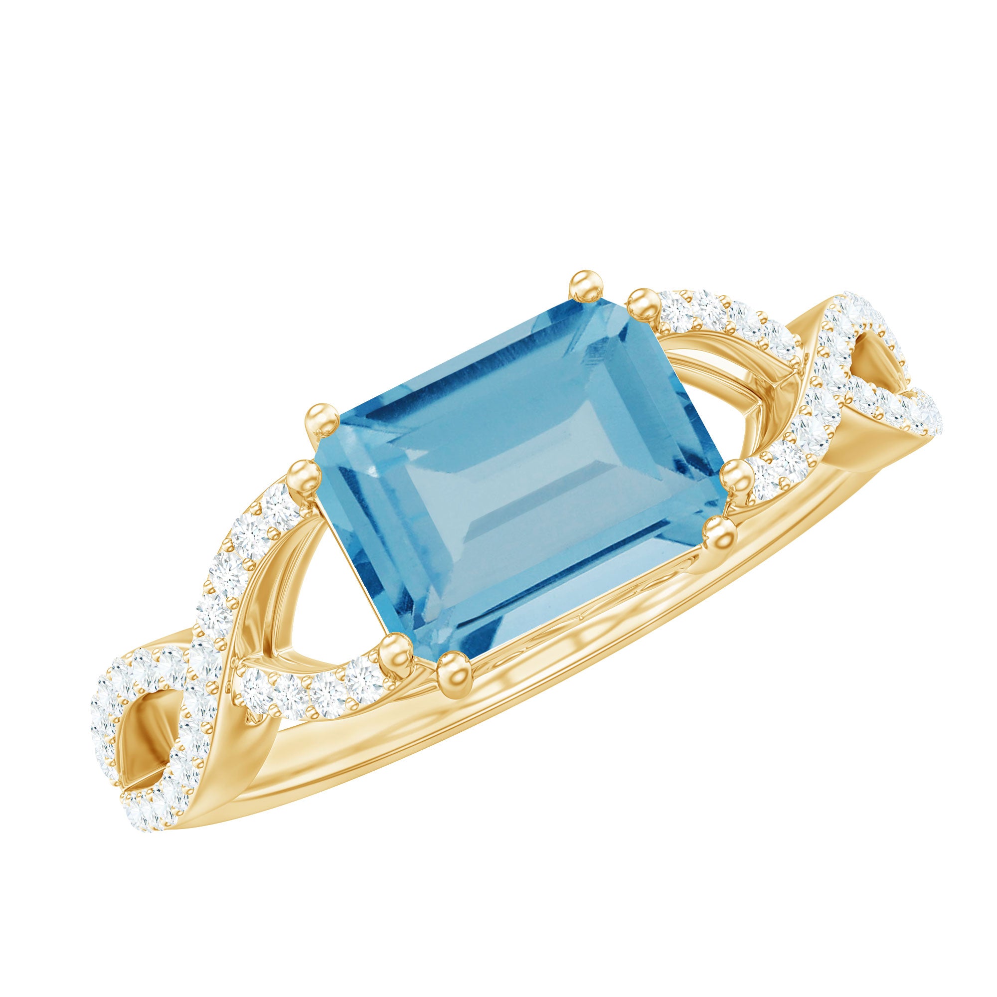 Introducing a stunning Designer Swiss Blue Topaz Engagement Ring to enhance your beauty with its captivating blue hue. Featuring an exquisite Emerald Cut Swiss Blue Topaz gemstone set as a solitaire in an East-West style and embellished with Diamond on a Gold Crossover Shank, this Solitaire Ring is the perfect choice for your lovely lady.